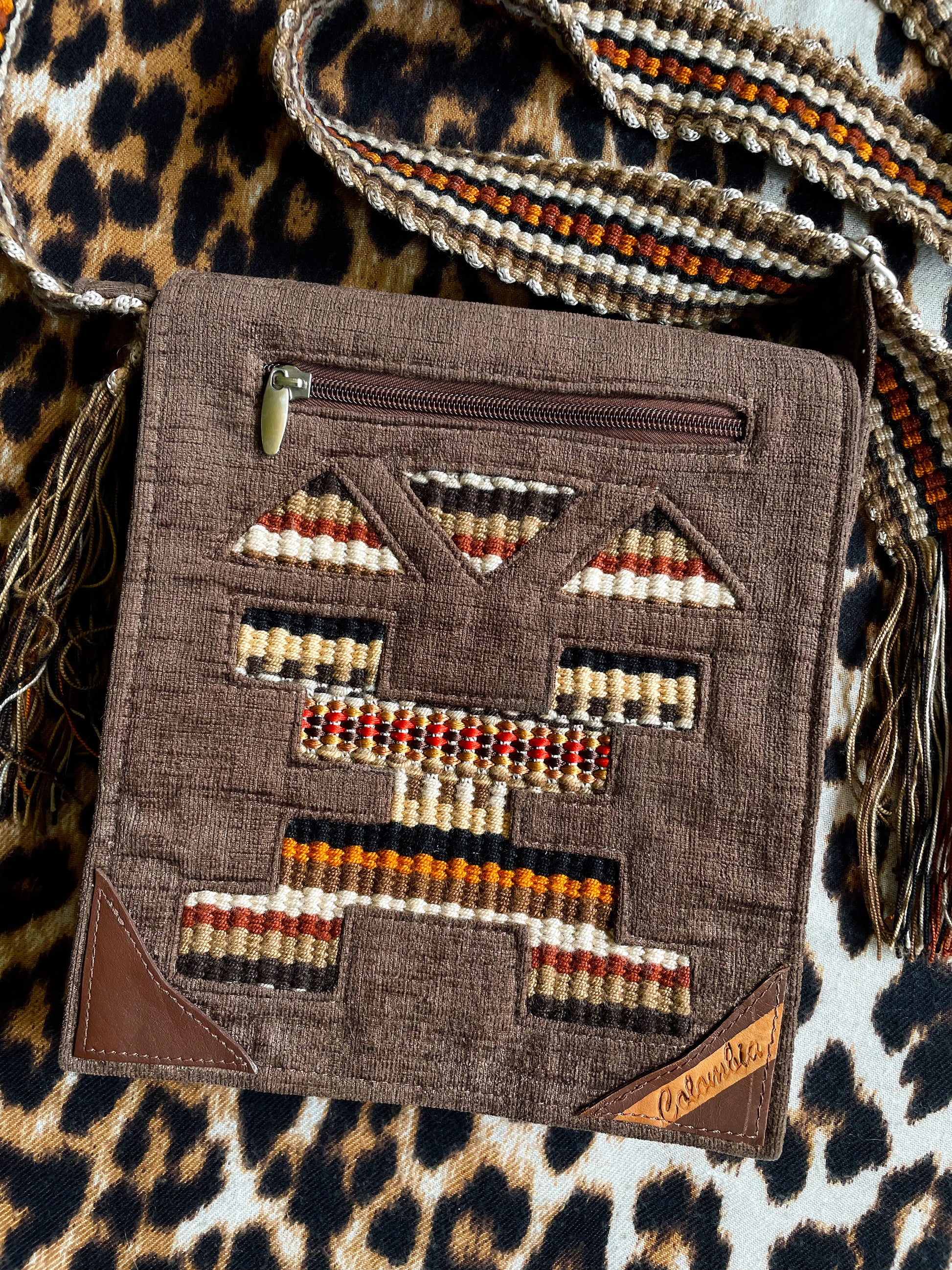 Almost too cool for words, this bag features a glorious warm color combination, knitted adjustable strap, fringe, knitted details on the front and back, a total of four pockets and velcro closure. Appears to be from 1970s but can’t confirm 100%. Measures approx 10.5” tall by 9” wide.