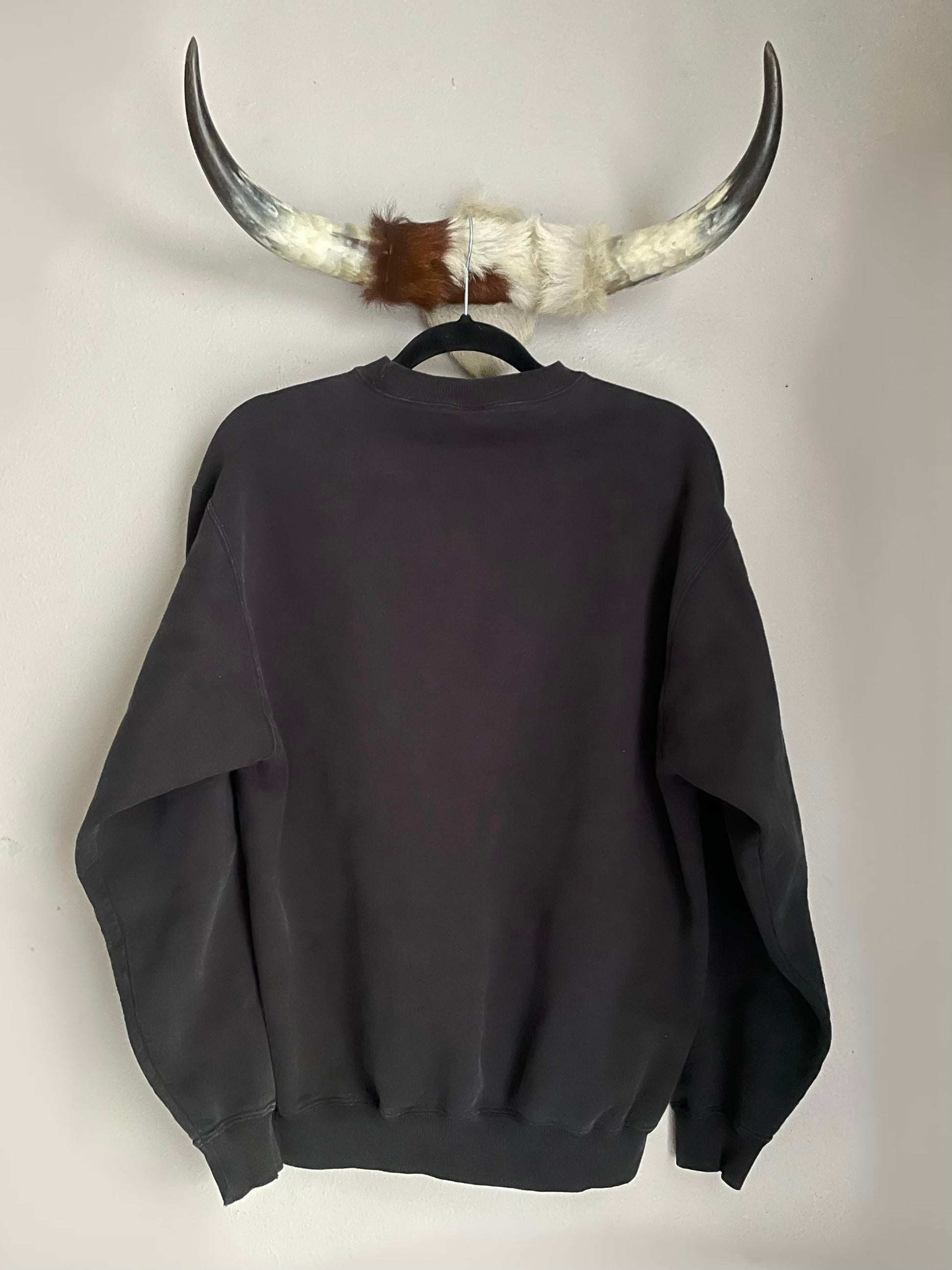 This is the kind of piece you’ll want to live in all Fall and Winter long. The perfect faded black crewneck featuring a badass motorcycle graphic on the front. Elastic sleeve cuffs and waistband. By Jerzees. 90% Cotton. Made in Honduras. Age unknown. Marked as a Women’s Large; can of course be worn oversized on smaller sizes as well. See measurements below!