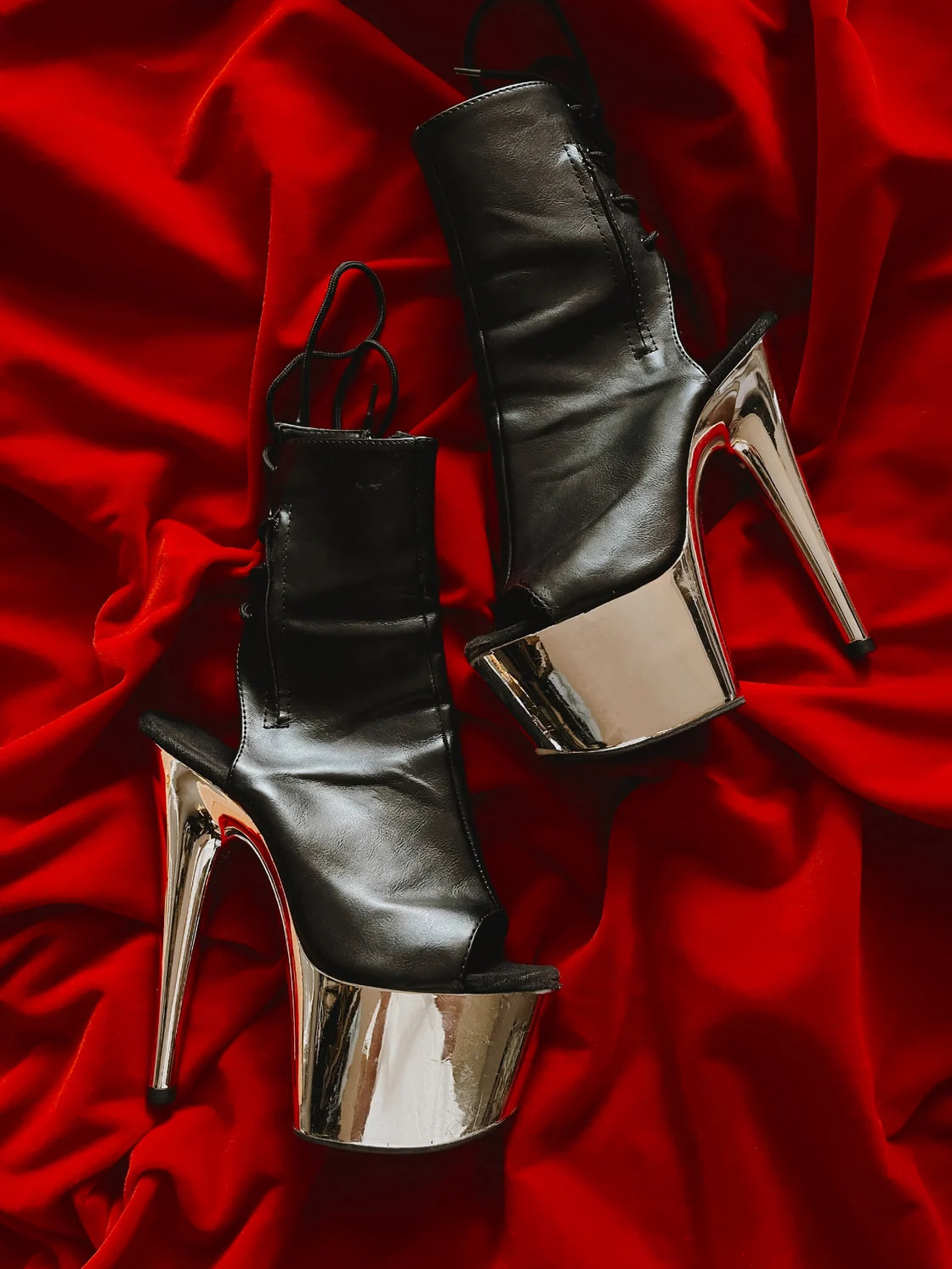Killer platforms by Pleaser featuring metallic silver heel/platform, lace up back, and zippers on the side. All man made material. Shows a little wear from age. Stop the show in these badass beauties. Fit like a Women's US 7/7.5. Heel measures 7", platform measures 2.5".