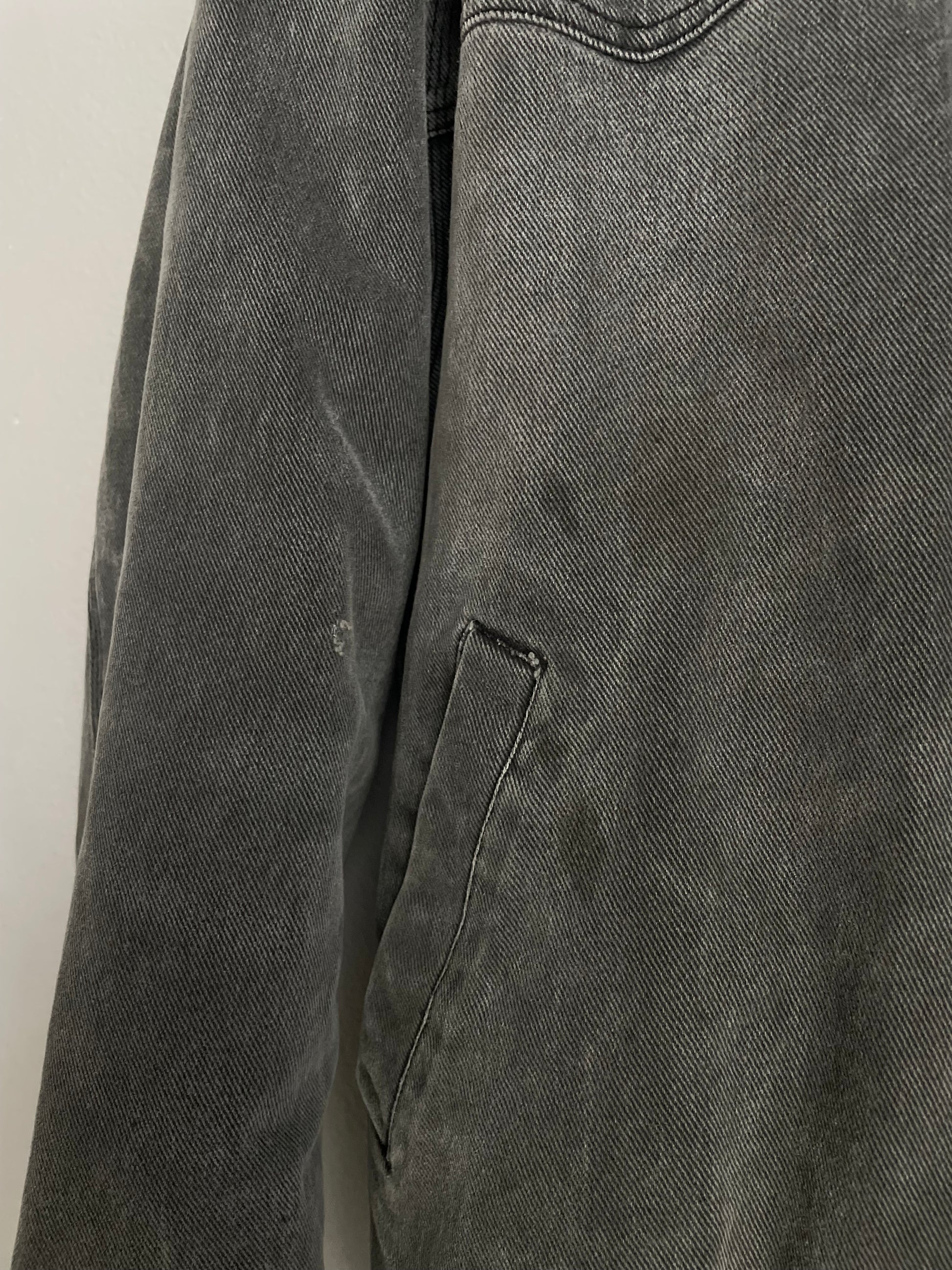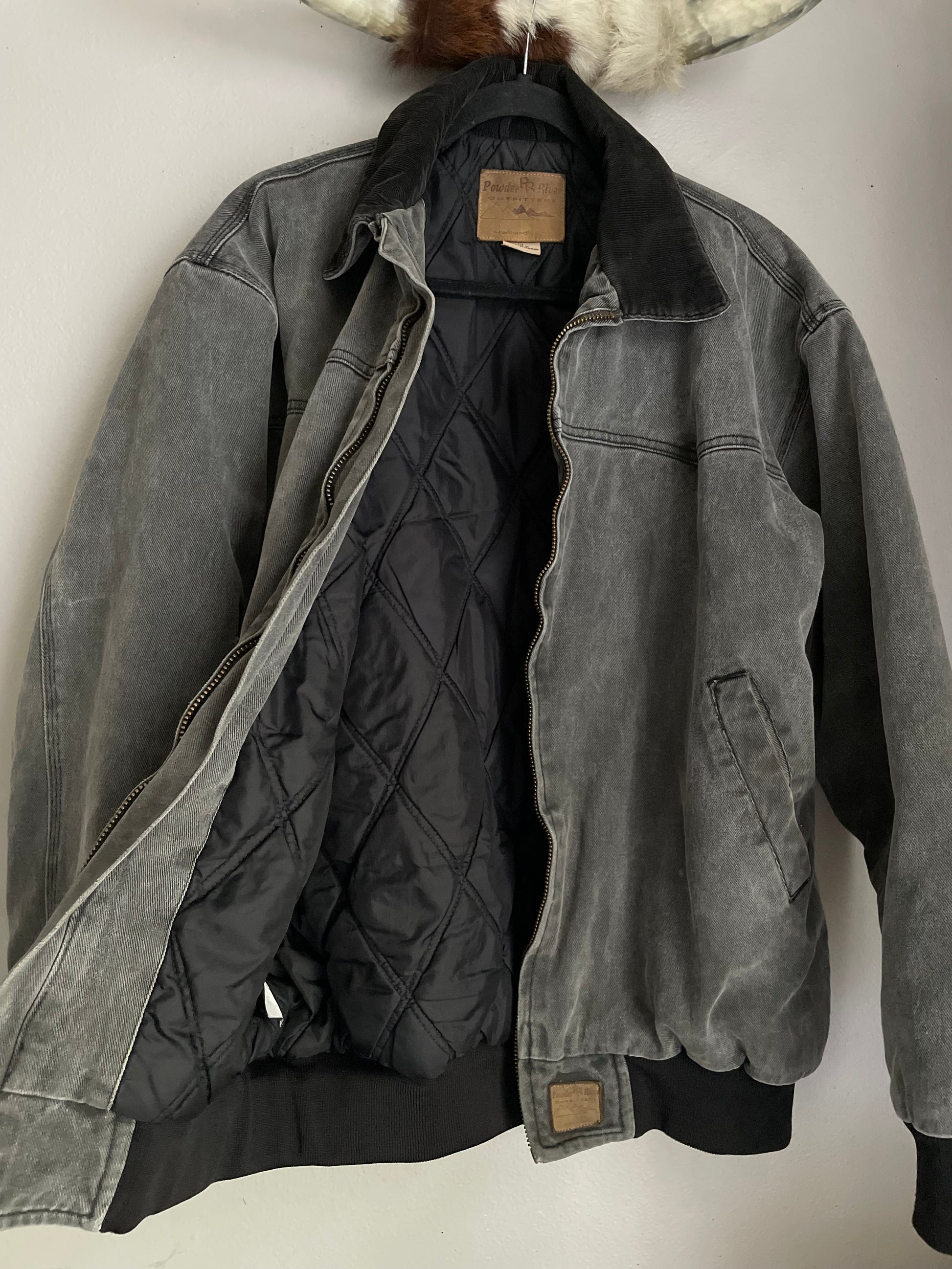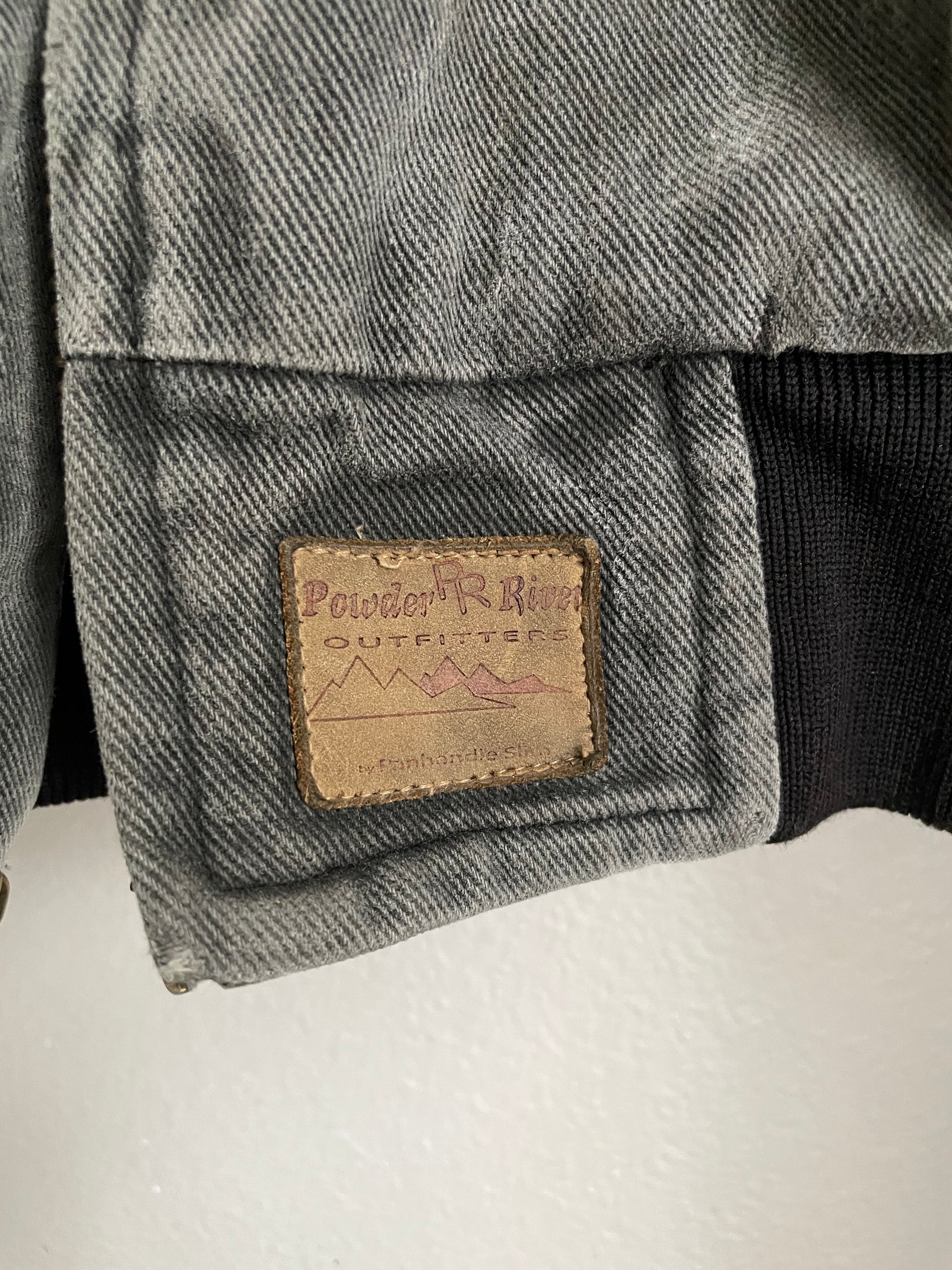 The definition of “effortlessly cool”. Charcoal gray denim bomber jacket with black accents featuring front pockets, zipper and quilted inside lining. The perfect oversized fit. By Powder River Outfitters by Panhandle Slim. Some minor flaws from age… just adds to the character of this piece! See all pictures. Marked as a Men’s Medium; would fit a Women’s Medium — XLarge, depending how oversized you want the fit. See measurements below!