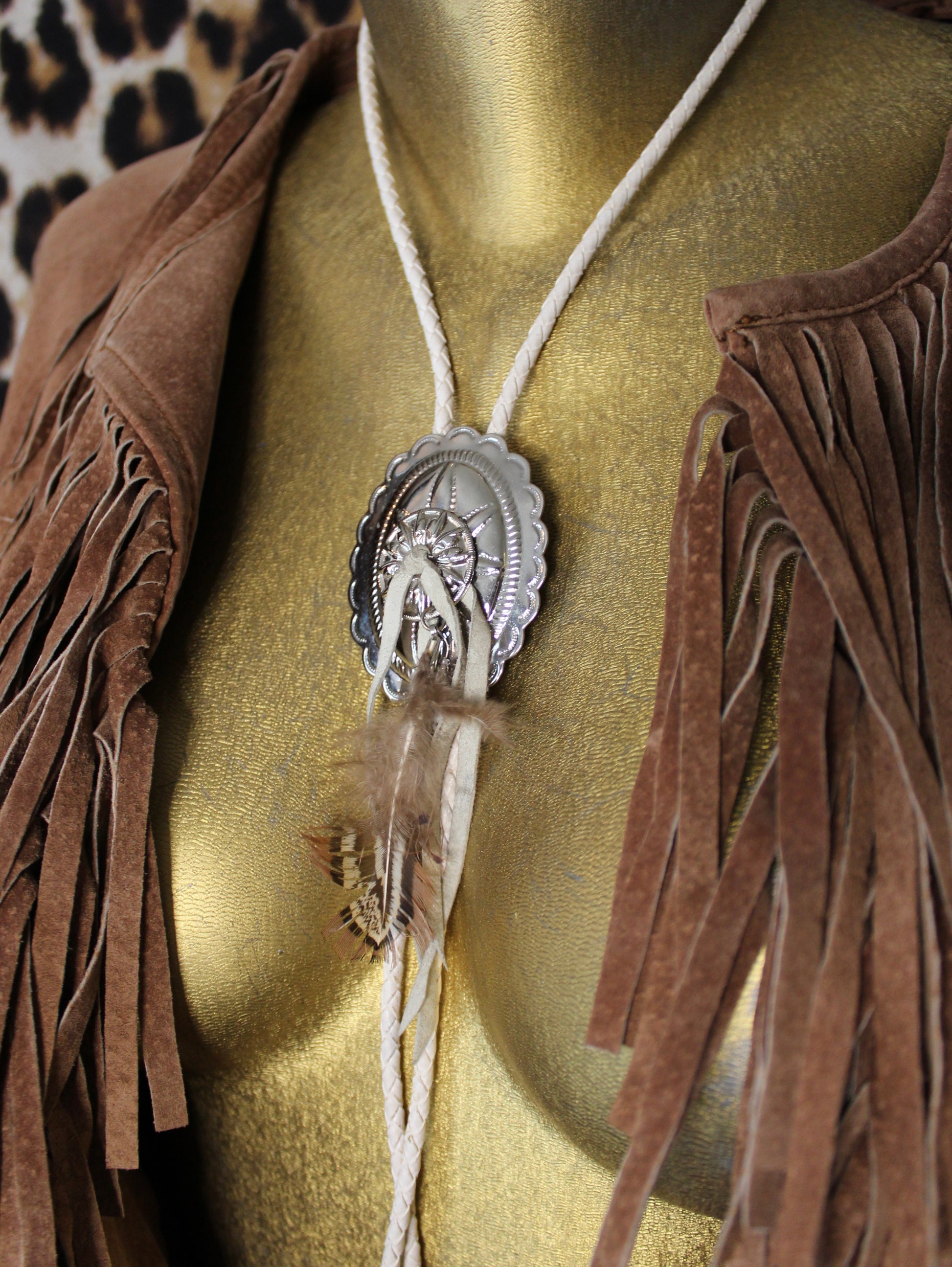 Rare bolo tie featuring a quality white leather braided cord, adjustable oval concho pendant with a smaller circle concho inside, fringe, small feather and silver tips on the bottom. Measures approx 18” top to bottom.