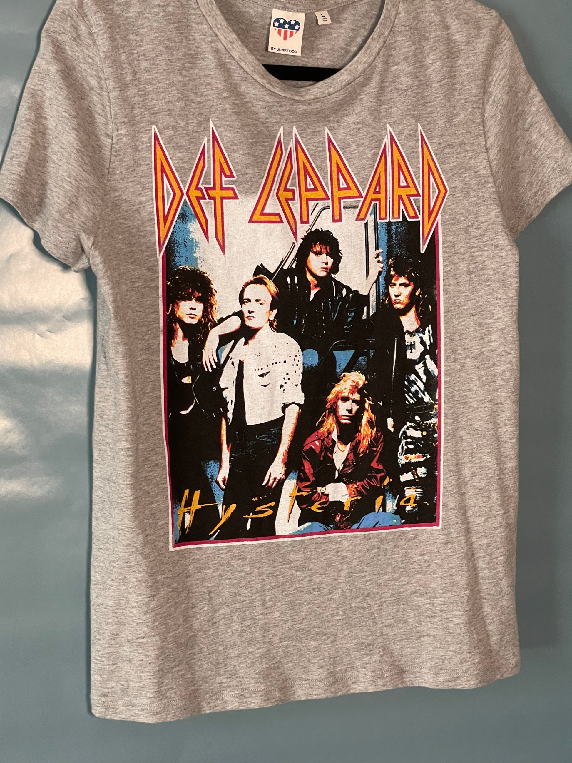 Gray Def Leppard Hysteria tee featuring an iconic shot of the band on the front along with their logo. A modern tee with a vintage look. By Junk Food. Size Women’s Large; see measurements below!