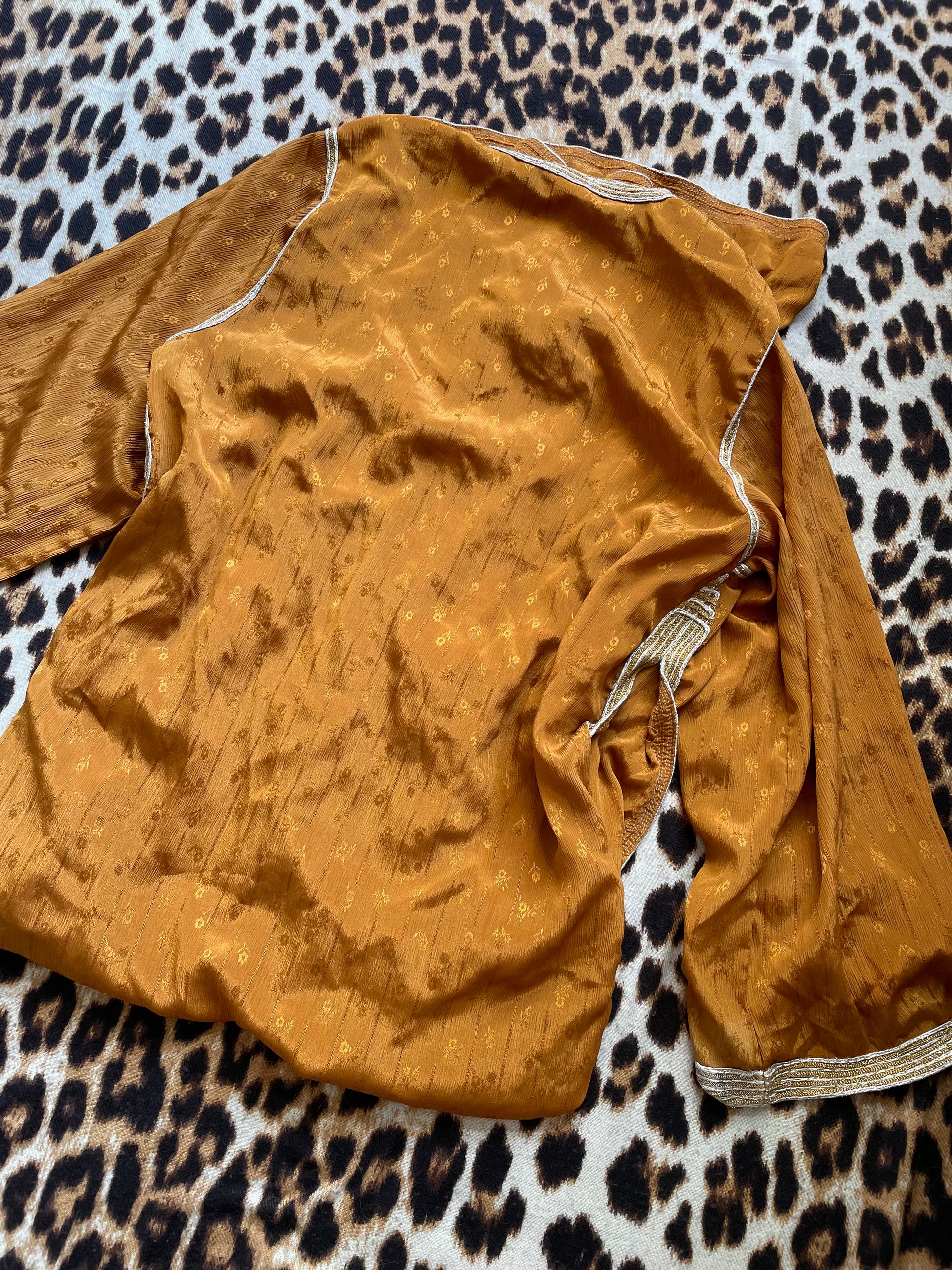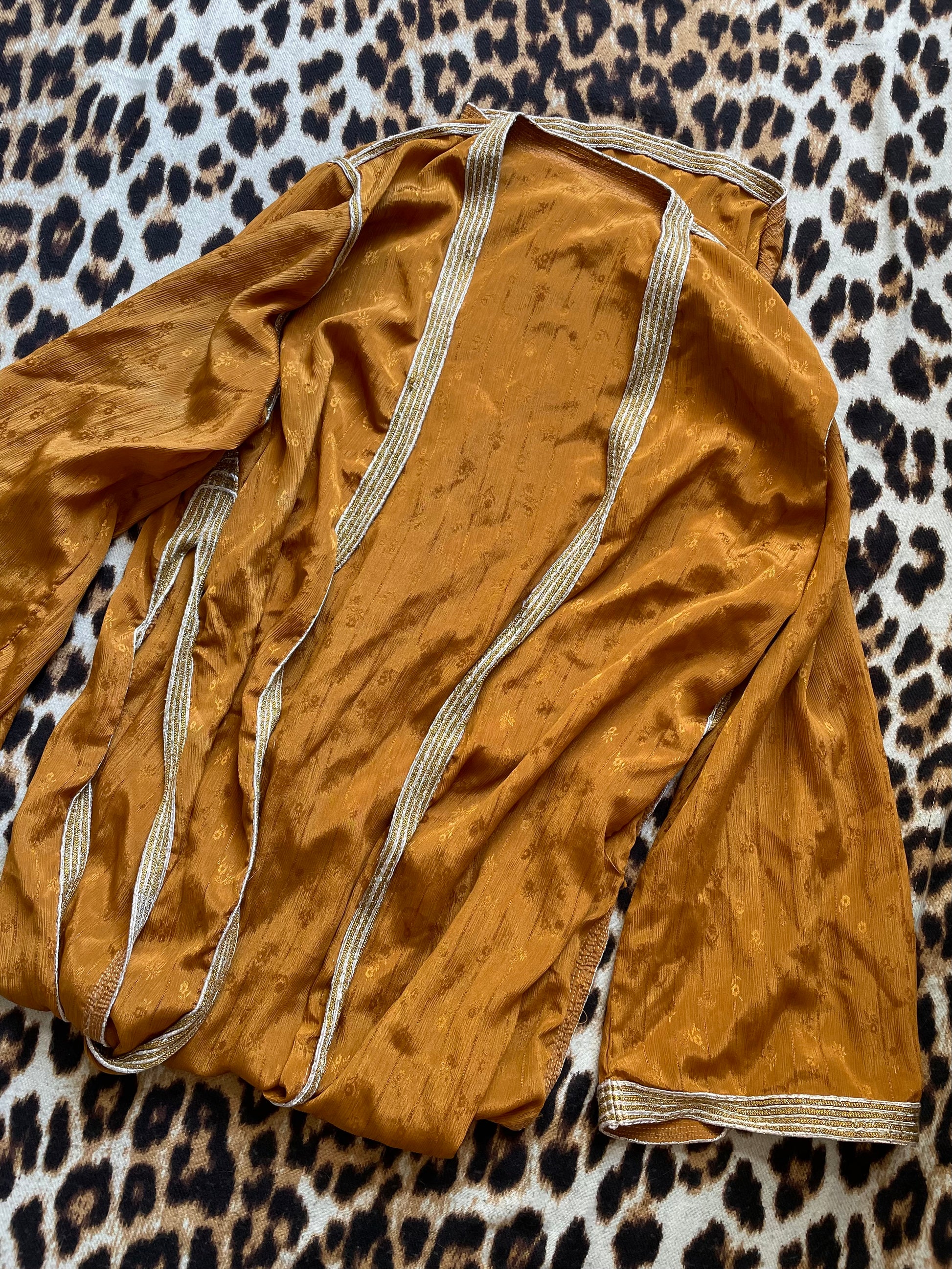Absolutely insane piece in the perfect fall marigold/orange color. This floor-length kimono features semi-sheer fabric with little flowers printed on it, long splits up the sides almost to arms and metallic trim. Appears to be vintage and possibly made by hand. Would fit a Women’s Small/Medium best; see measurements below!
