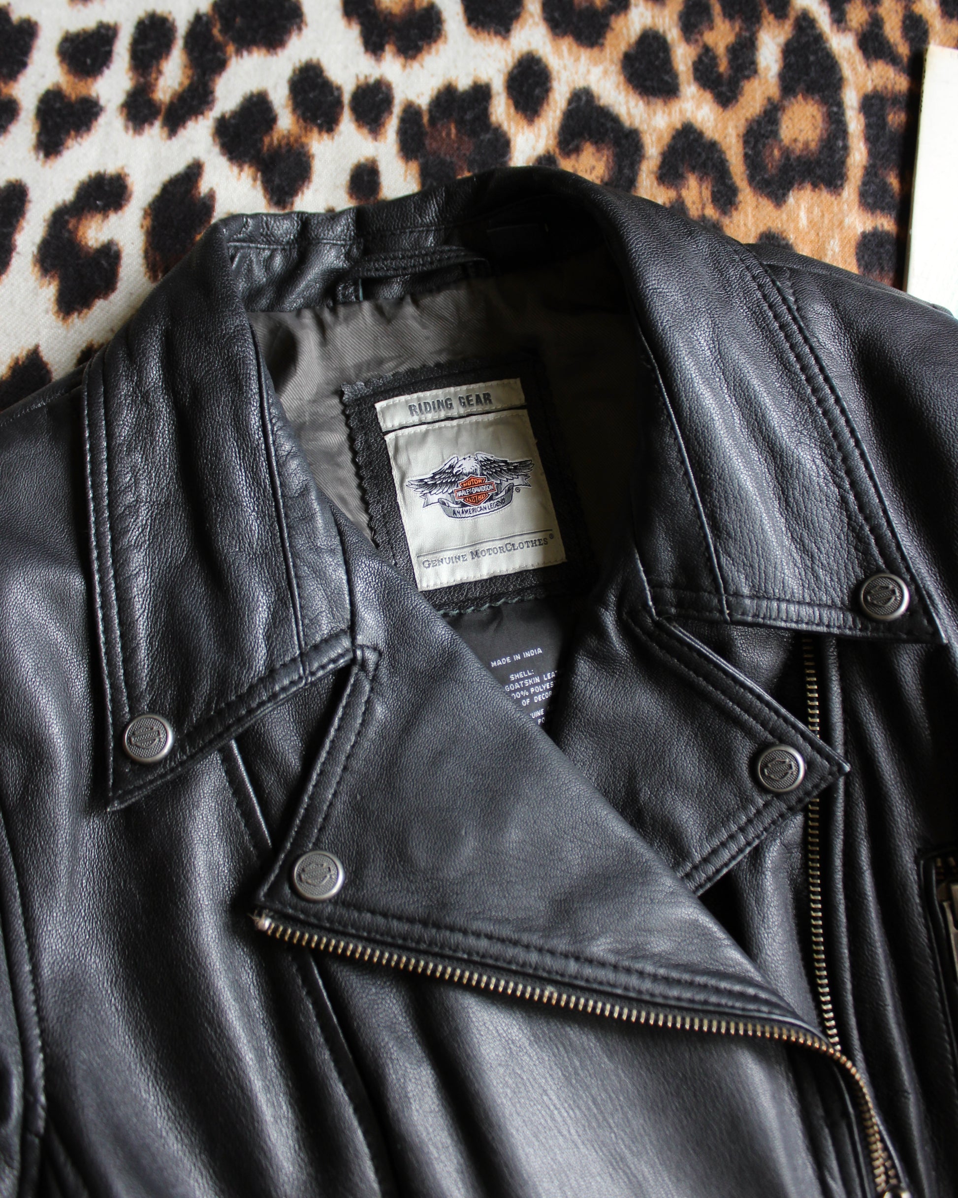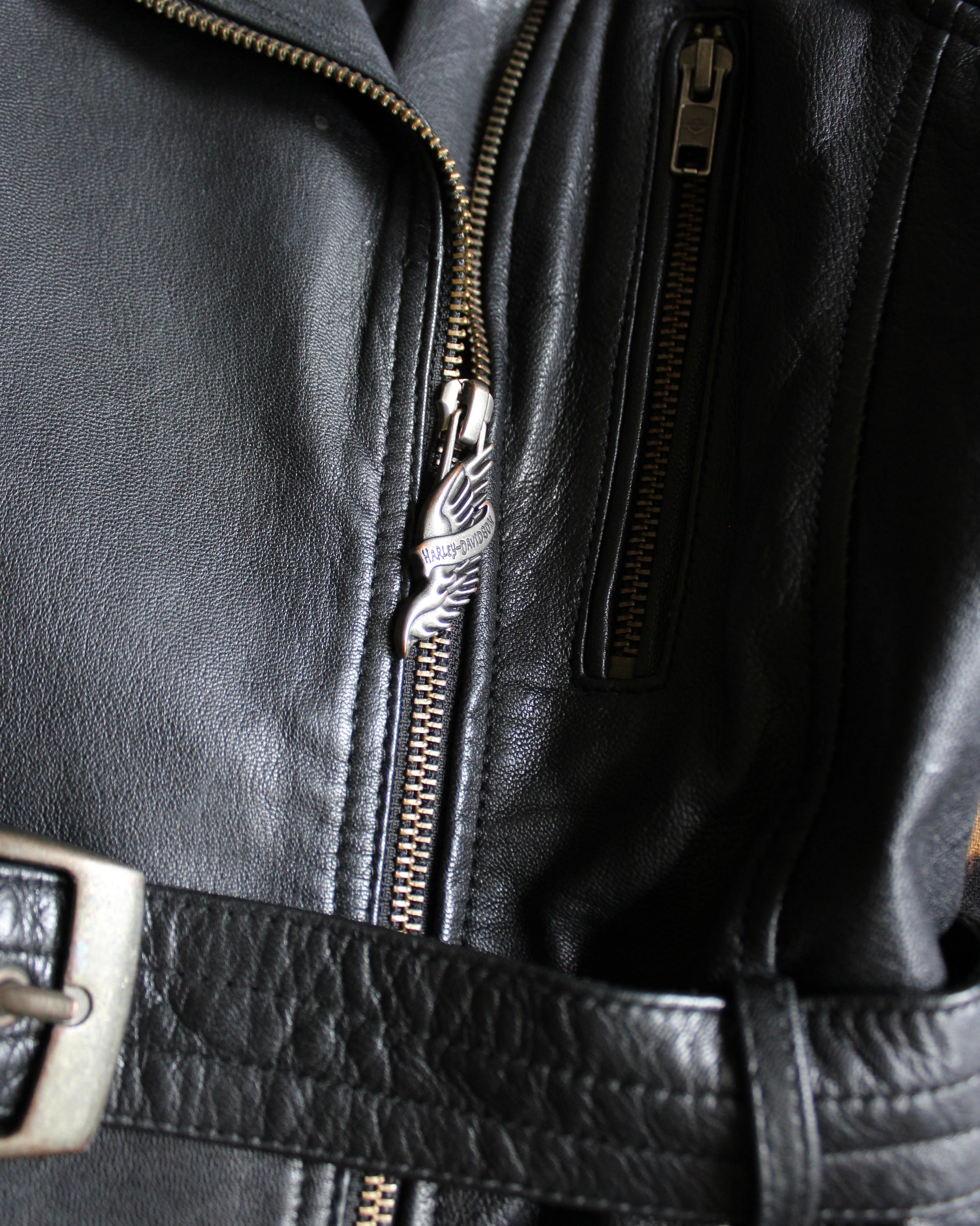 Genuine leather Harley-Davidson jacket featuring a detatchable belt, branded buttons, branded heavy duty zipper down the front, buckles on sleeve cuffs to match belt, three front pockets, snap button lapels/collar and an embossed leather patch on right arm. This piece really has it all. Quality goatskin leather that only gets better with age. In good condition besides small hole inside right pocket lining. Size Women’s Small; see measurements below!