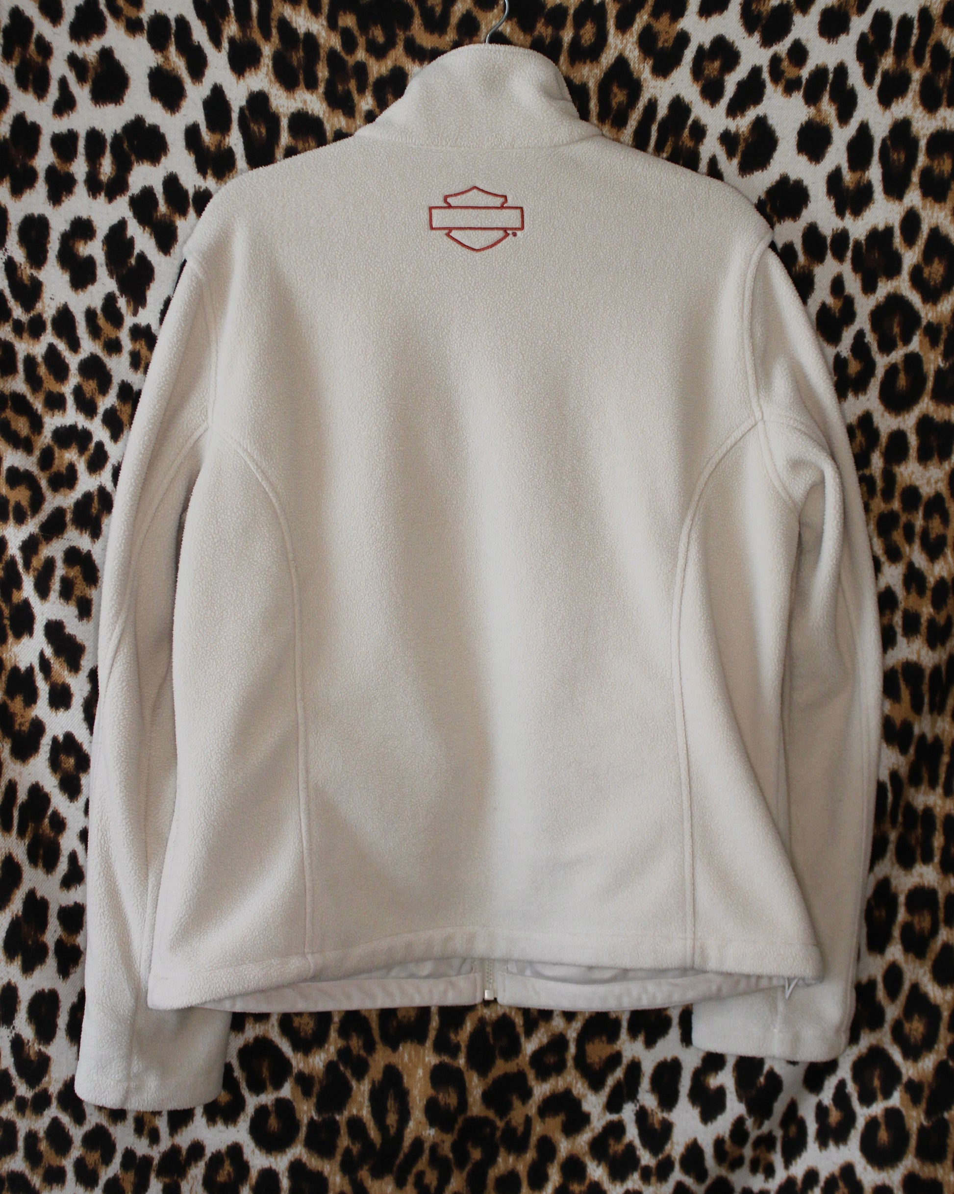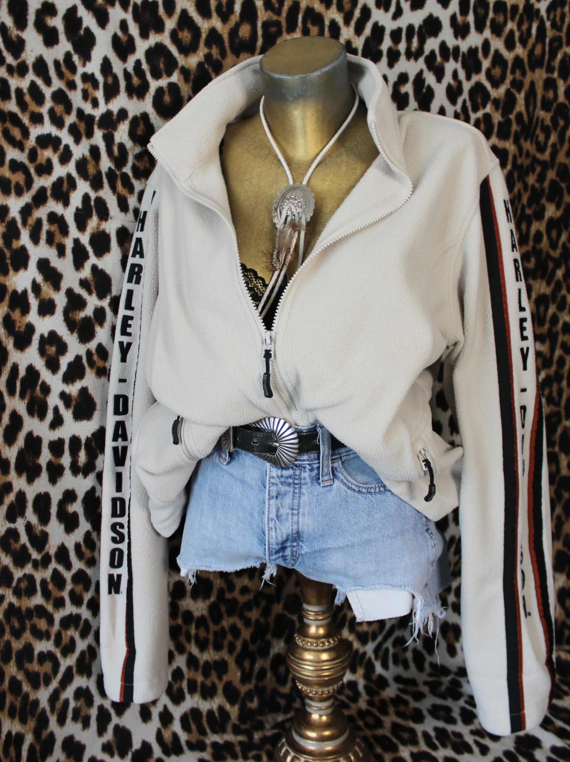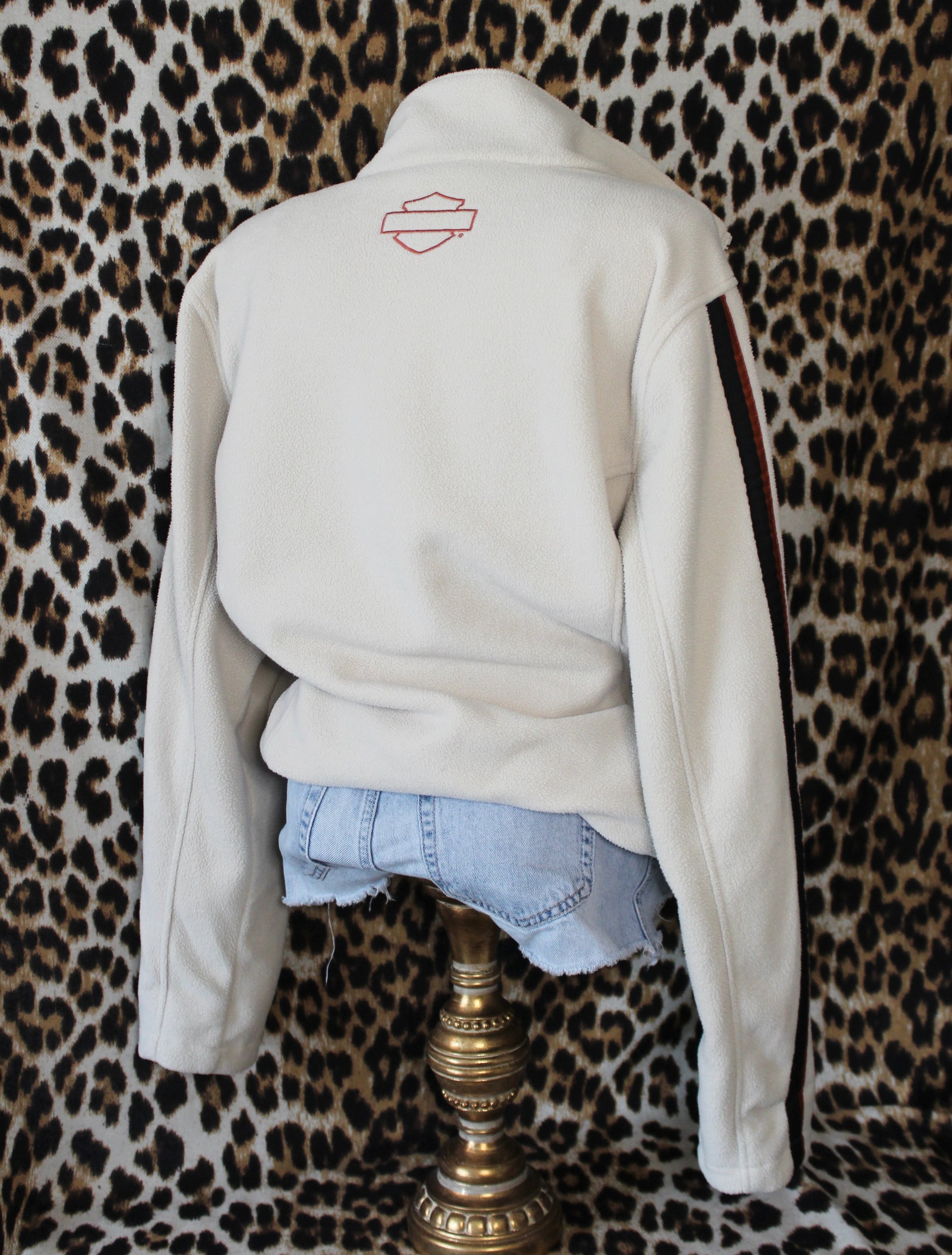 Badass Harley-Davidson cream fleece zip-up jacket featuring branded zipper pulls, zipped pockets, HD embroidery on the front, orange and black stripes down the arms along with embroidered Harley-Davidson, mock neck and a small embroidered Harley logo shape on the back of neck. Adjustable elastic on bottom hem. Appears to be about 20 years old. Some light pilling inside from wear. Officially licensed. Marked as a Women’s size XL; can be worn oversized on smaller sizes as well. See measurements below!