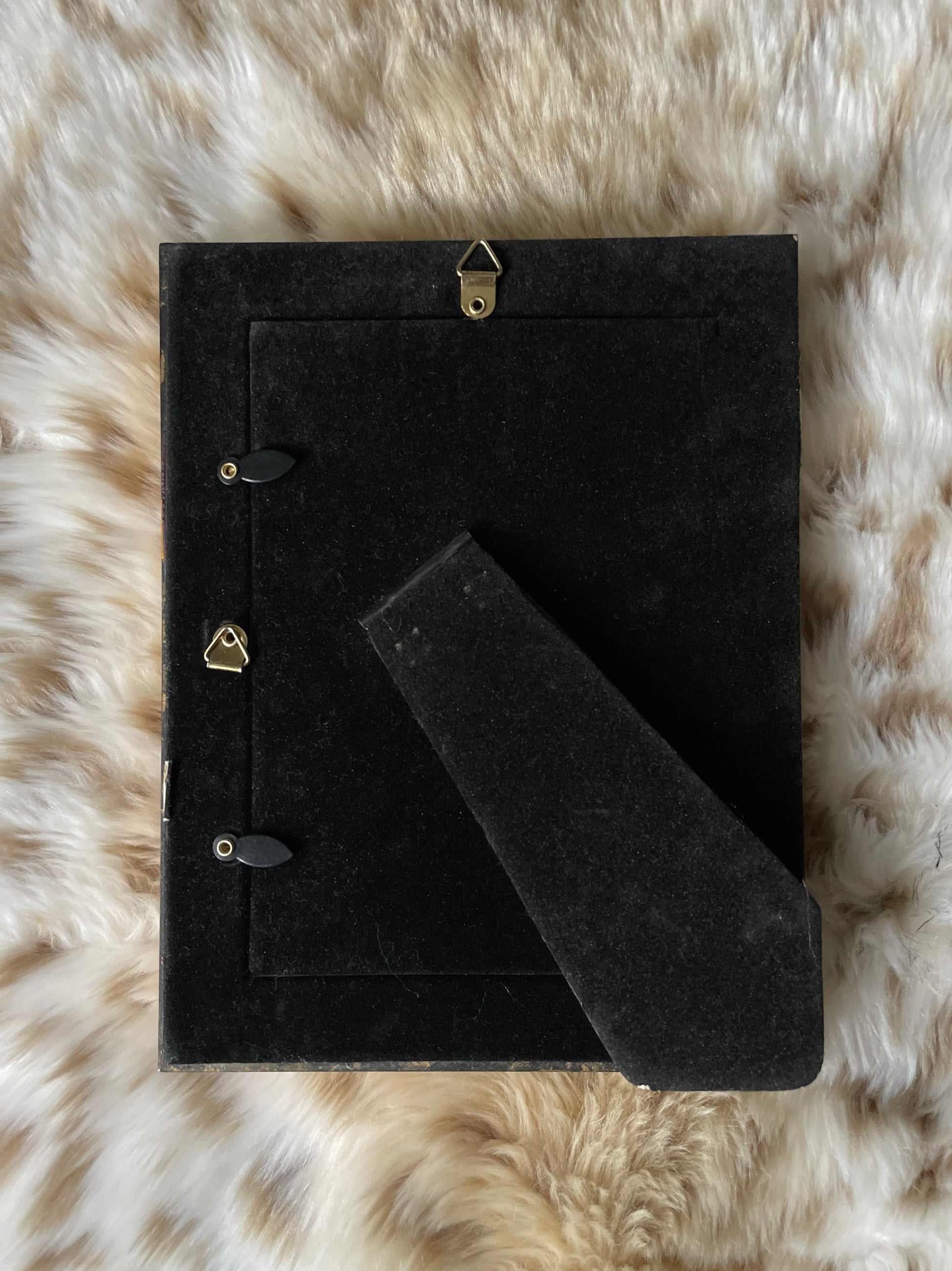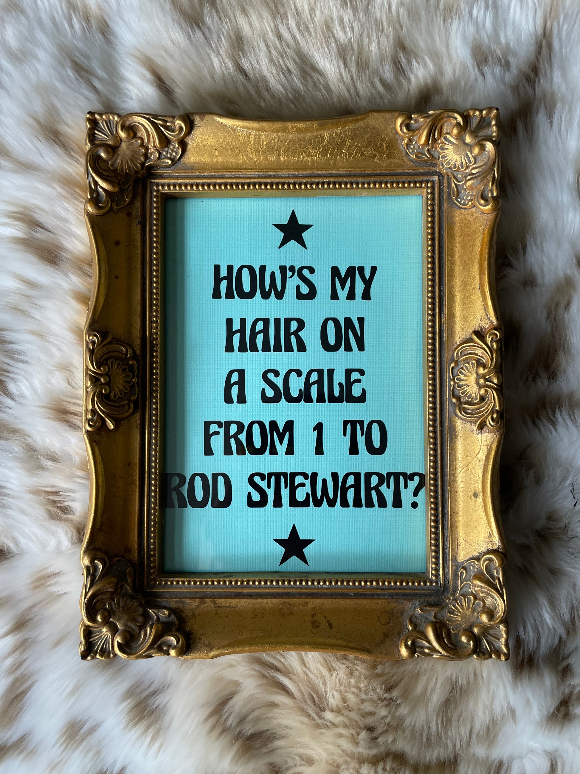 Our Thunderstruck coined phrase “How’s my hair on a scale from 1 to Rod Stewart?” was an instant hit since its initial release four years ago. This one of a kind framed piece features custom vinyl lettering on a 60s-inspired blue background. Framed in an opulent gold frame. Can be hung up or propped up. We believe the frame to be vintage but don’t have enough information on it to say for sure. Measures approx 7” wide by 9” tall.