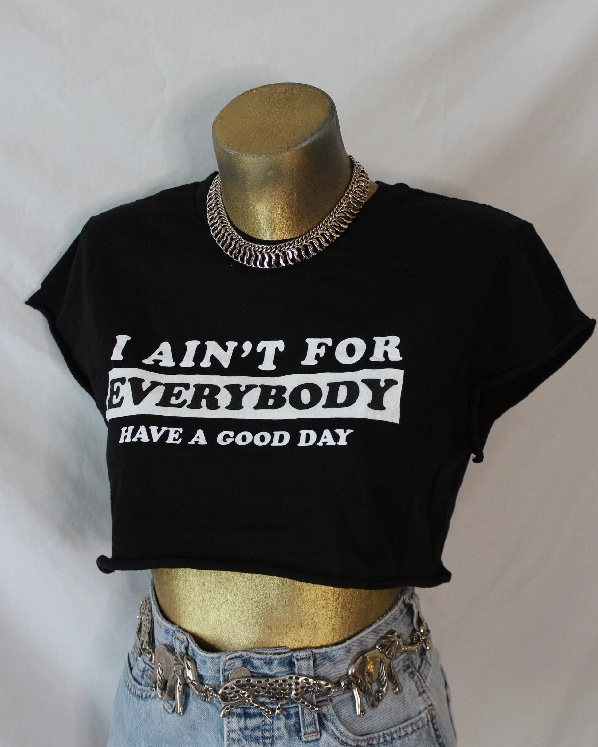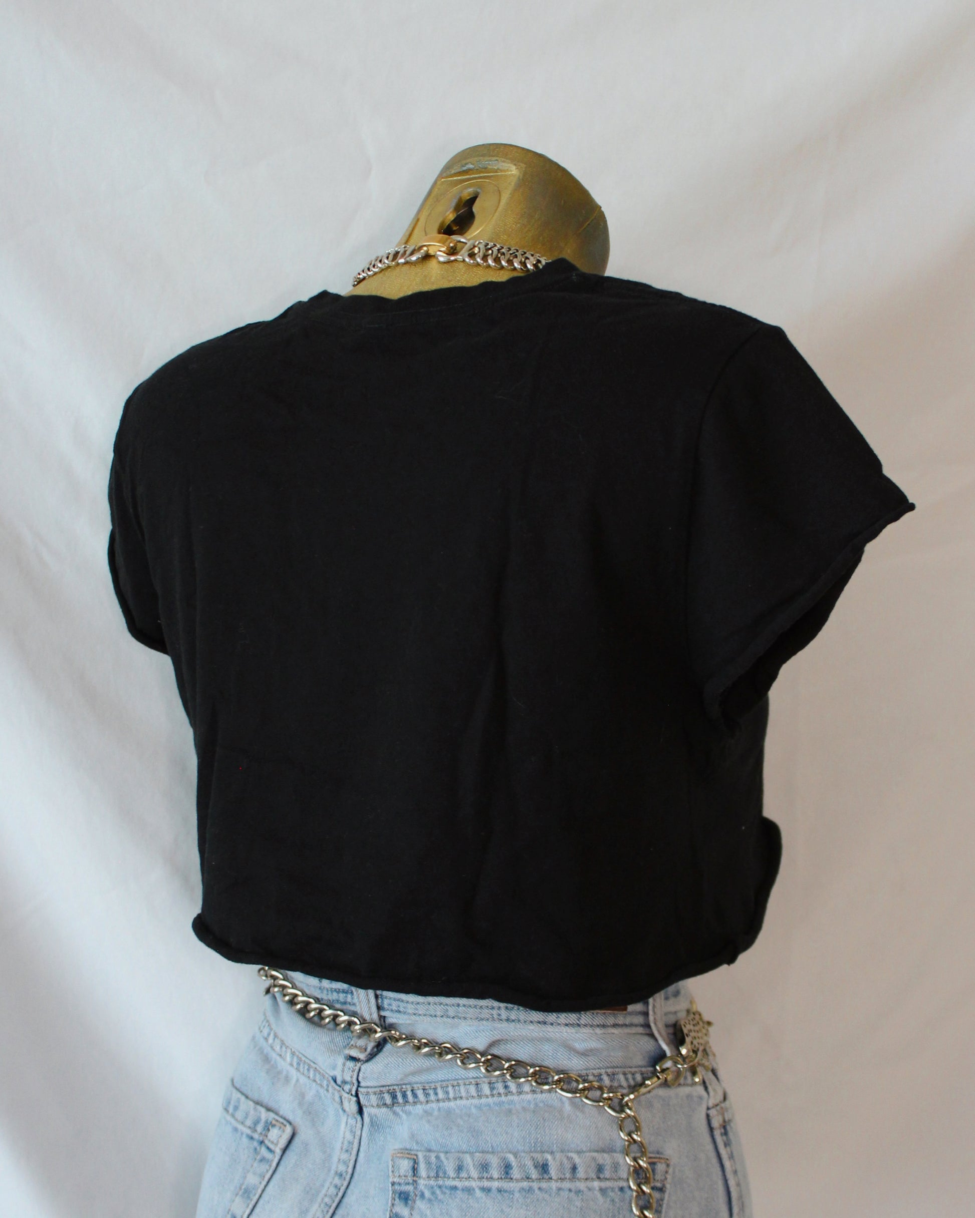 This tee really says it all, doesn’t it? Ultra cropped, soft cotton tee with a little stretch to it. Cropped raw hem at bottom + sleeves. Original tag missing, looks and feels just like a simple Anvil tee. Size Women’s XS; see measurements below!