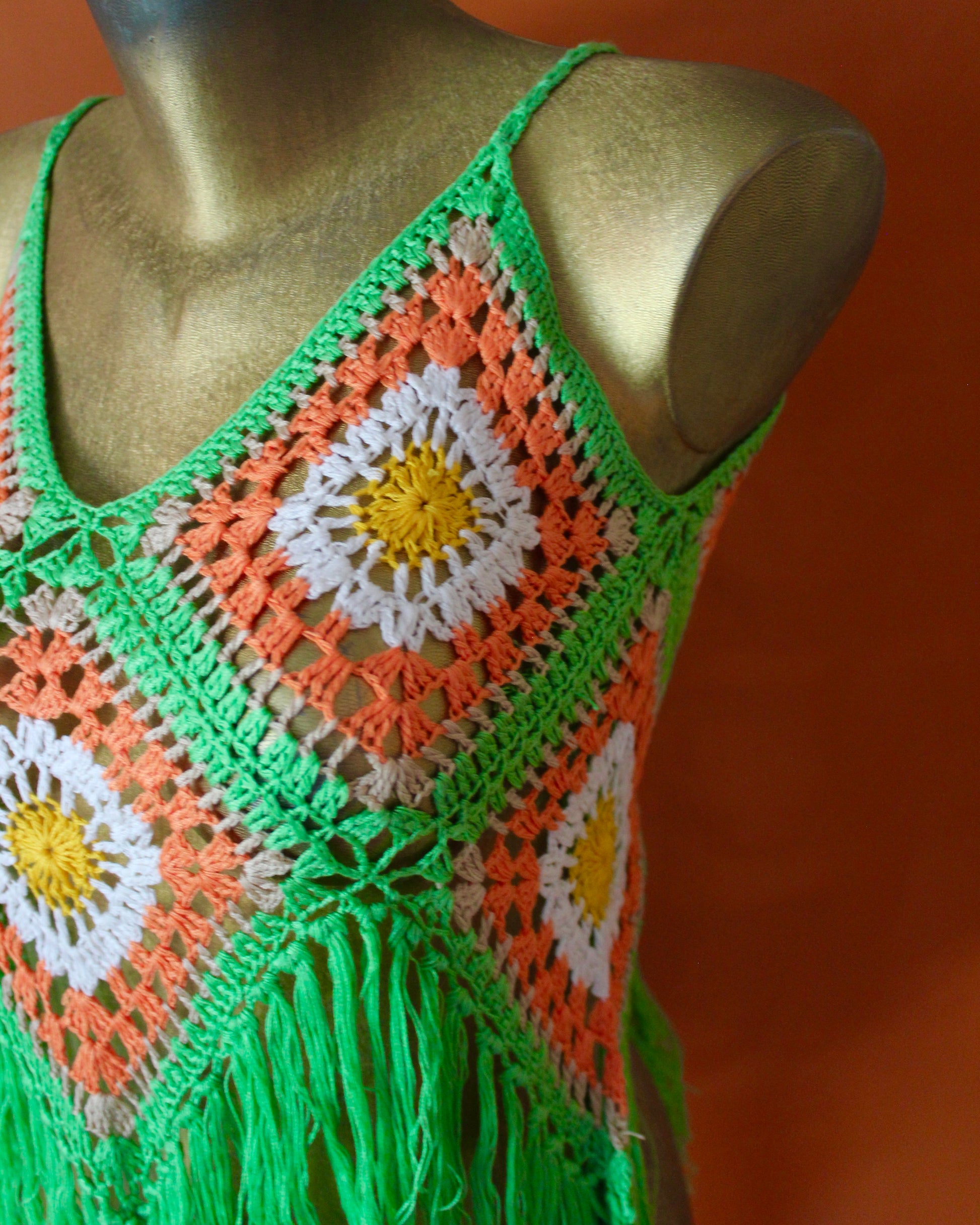 If ‘Tangerine’ or ‘Going to California’ by Led Zeppelin were an article of clothing, it would be this crocheted tank. This appears to be a modern take on a 70’s style — featuring a green, orange, white, yellow and cream color way, fringe hem and skinny straps. No size marked; could fit a Women’s Small or Medium.