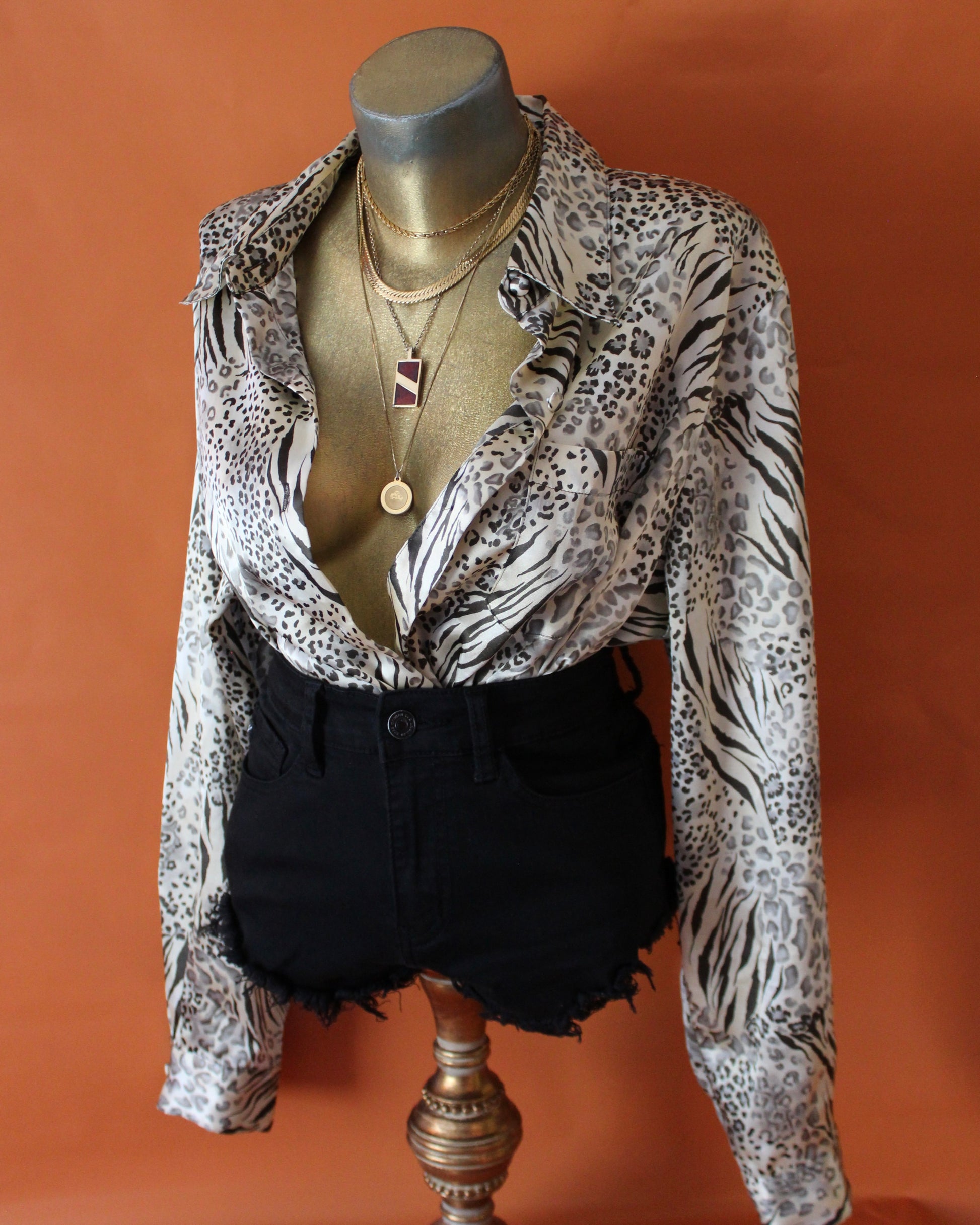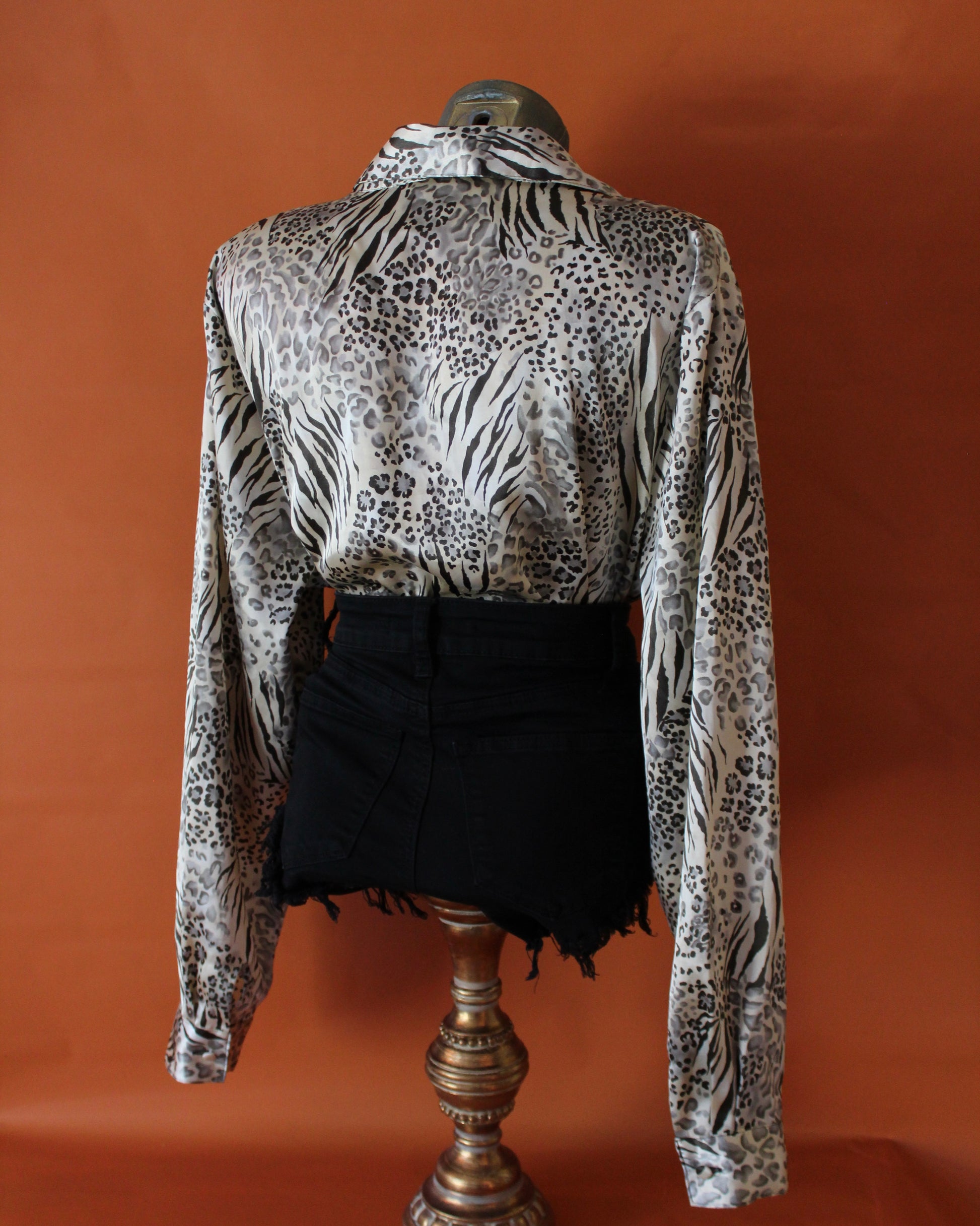 Gorgeous cream colored button-up featuring silky mixed animal print fabric, single pocket, covered buttons down the front and on sleeve cuffs, and small collar. Would look effortlessly cool worn open over a bralette or tank or buttoned up and tucked into some leather pants. Original tags missing so age and size unknown. Could fit Women’s Small — Large, depending how oversized you want it to fit. See measurements below!