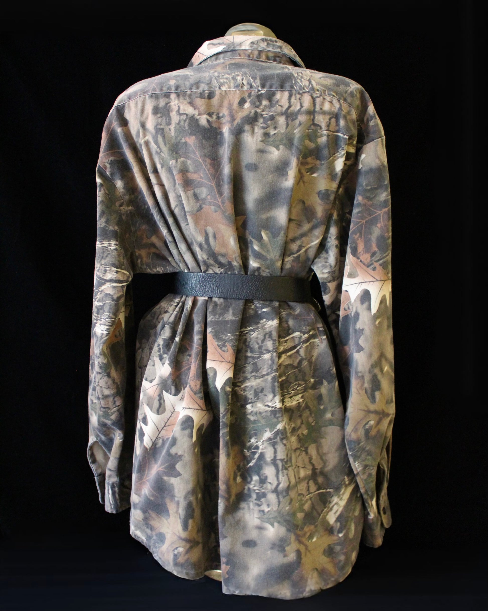 Camo for Fall? Always a good idea. We love this button-up by Bear Ridge for many reasons: it’s perfectly faded from wear, it has front pockets, it’s an oversized fit, great for layering, can be worn open or belted dress style. Size Men’s XL; can fit Women’s Small — XXL, depending how oversized you want it to fit. See measurements below!