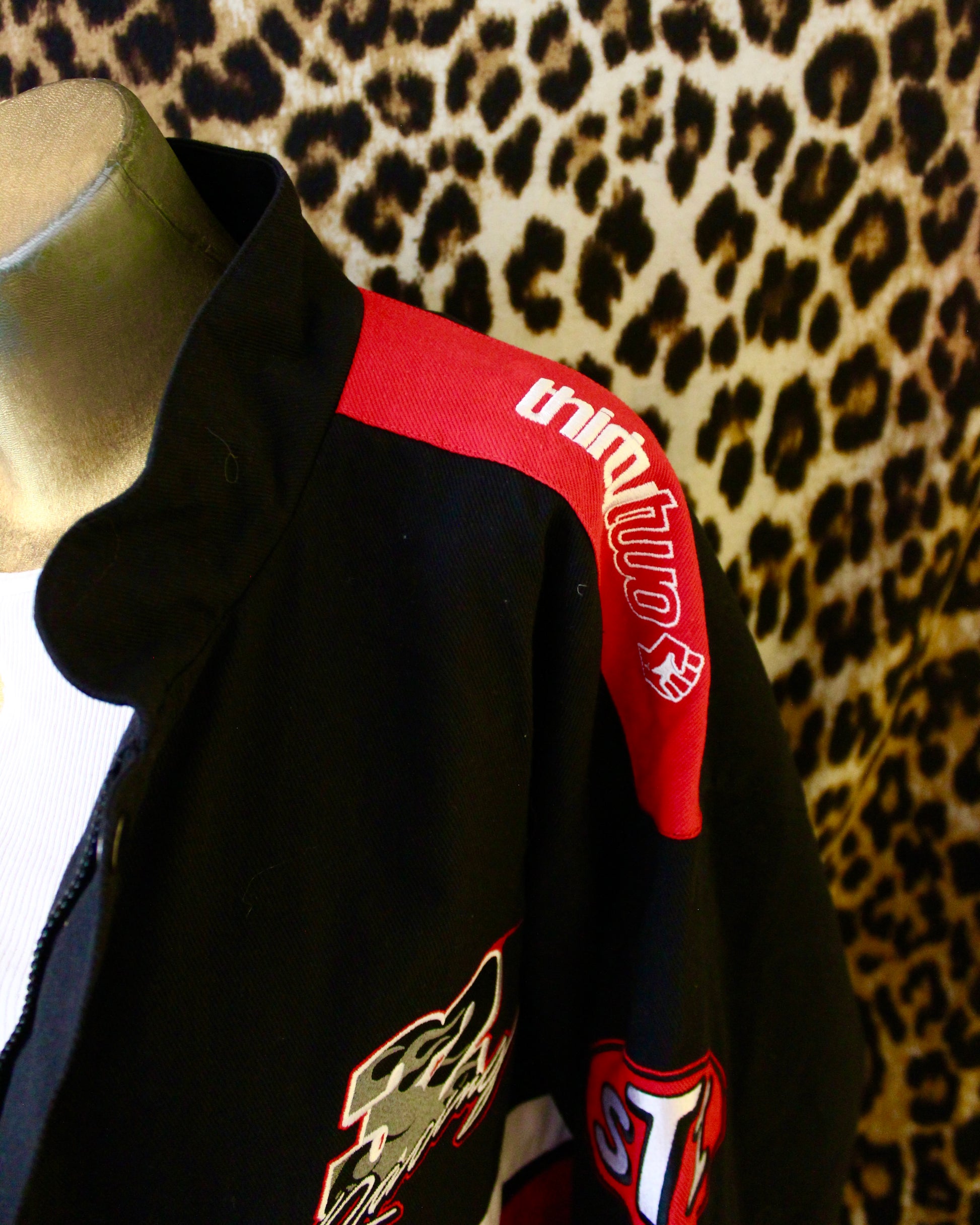 Cool as hell oversized limited edition Zeb Powell Pro Model Pit/Snowboard/Nascar jacket. Featuring a black, white and red color scheme, canvas/denim 100% Cotton material, ribbed elastic on sleeve cuffs and bottom hem, zipped inside pocket, two zipped outside pockets, 32 Racing patch on the front, big patch on the back and some embroidery on the back of neck, on shoulders and on left sleeve. Effortlessly cool. Size Men’s Large; can fit Women’s Small — XLarge, depending how oversized you want the fit. See measurements below!