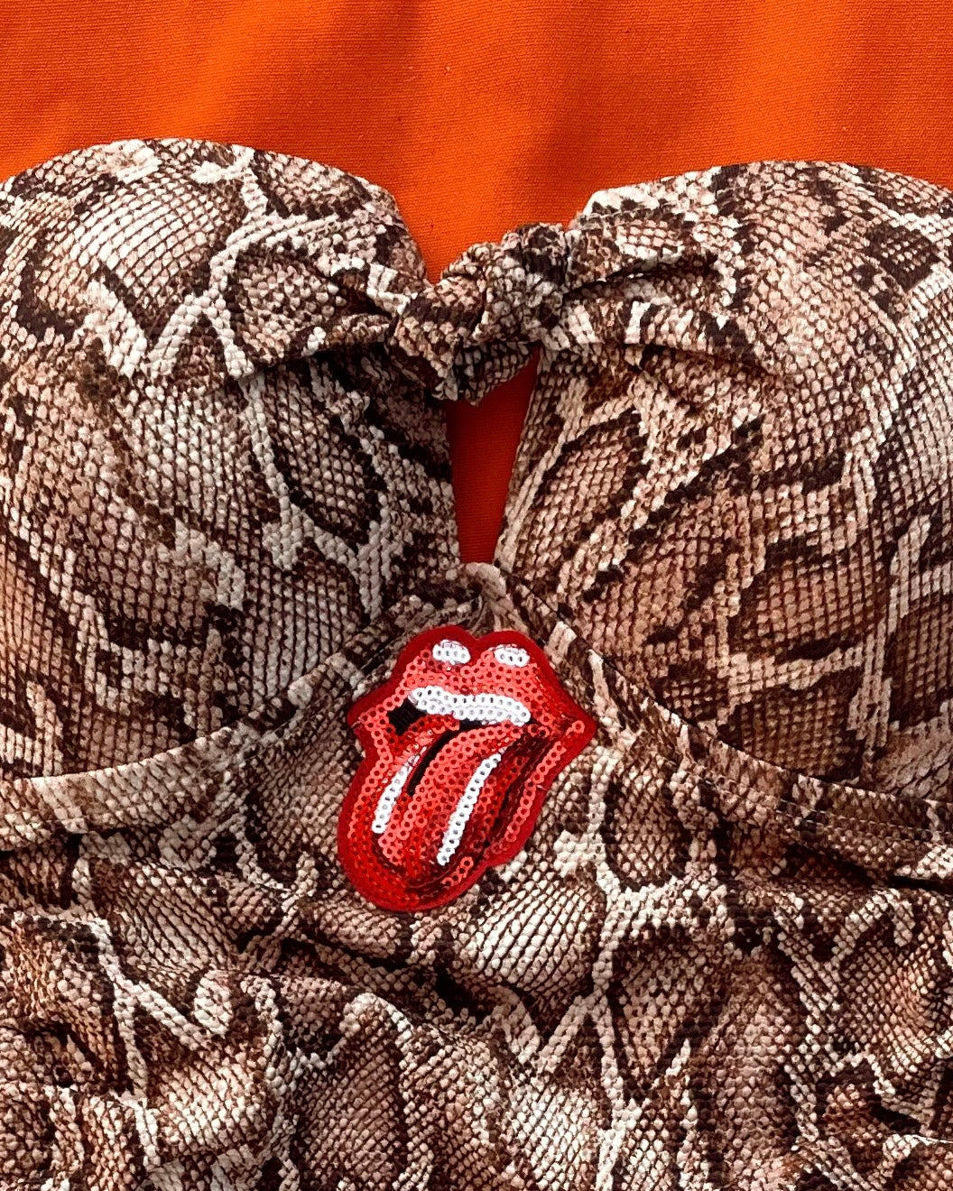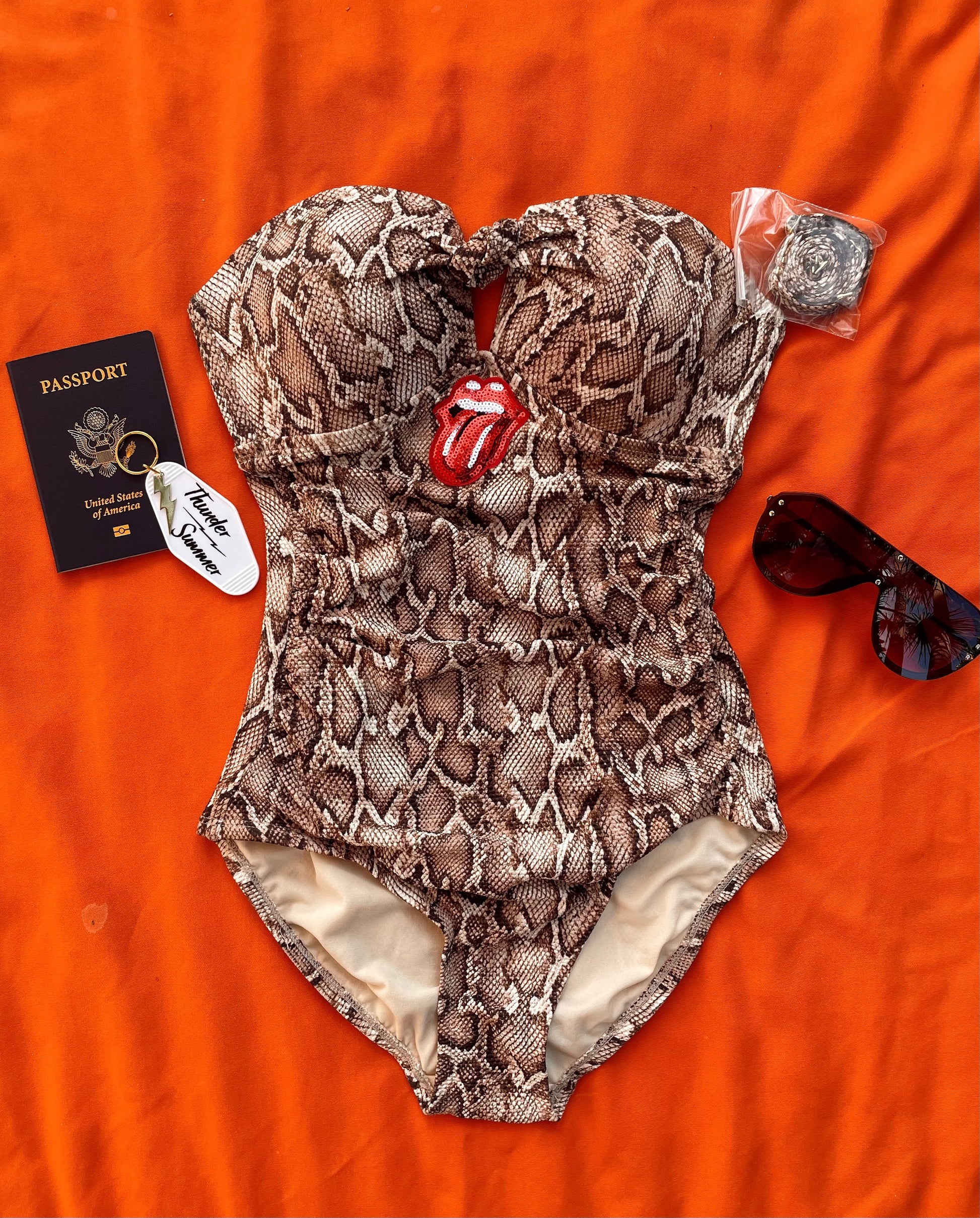 The Jagger One Piece features a snake print fabric, full coverage bottom, gathering on the sides for a shaping flattering fit, padded cups, custom sequined Rolling Stones tongue patch in the middle, and straps if you don’t want to wear it strapless. Although this is technically a swimsuit, it would make an excellent bodysuit as well. Available in size Small, Medium, and Large. Best fits fuller bust sizes. See measurements below (keep in mind material is stretchy).