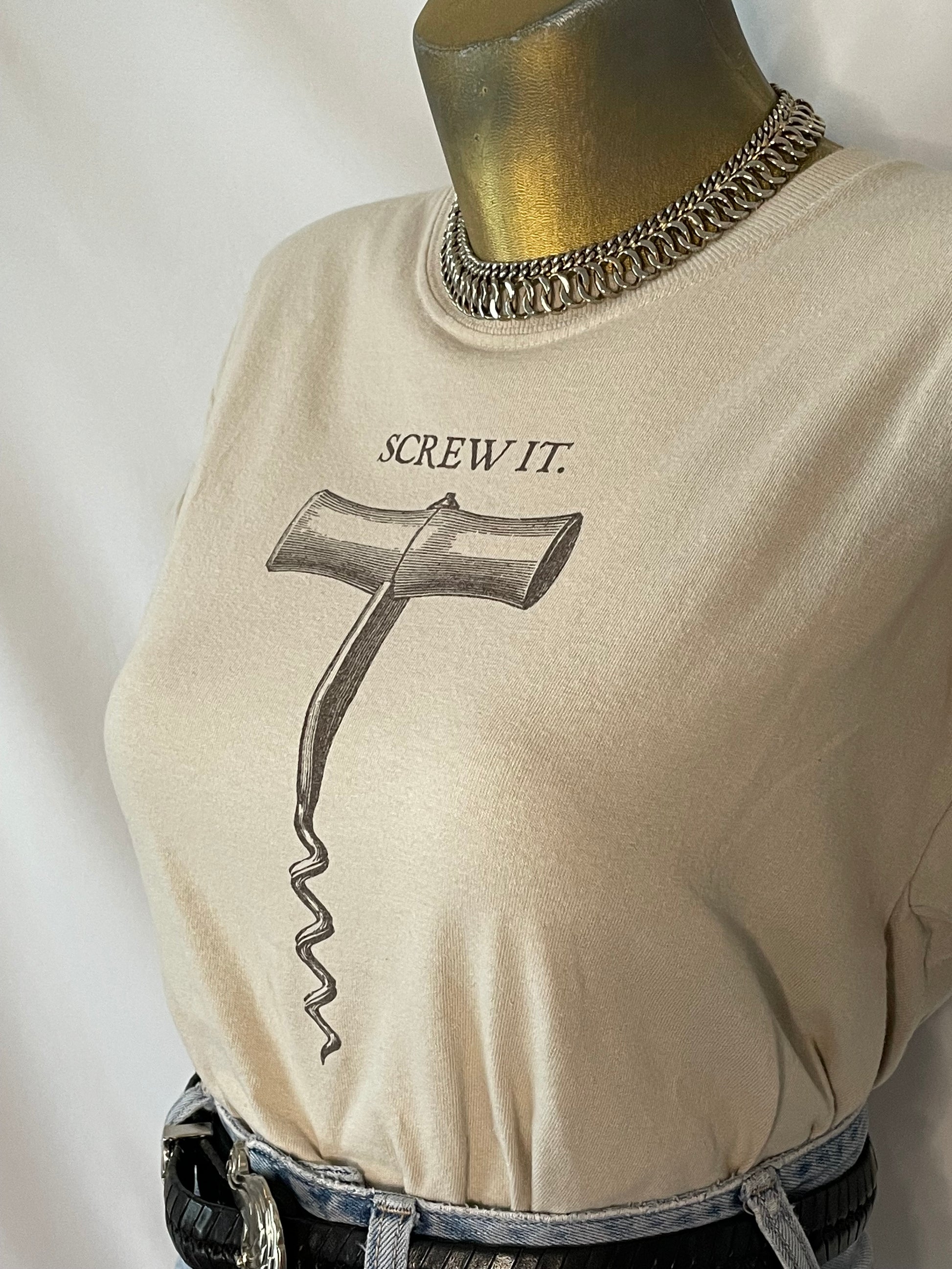 Screw It beige graphic tee by Chris’s Stuff. 100% Cotton. If you just don’t give two damns, this tee is for you. Marked as an Adults Medium; see measurements below!