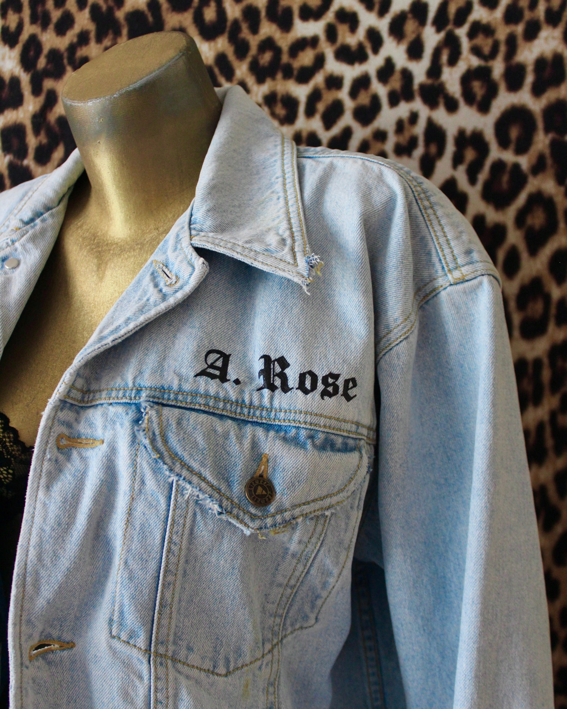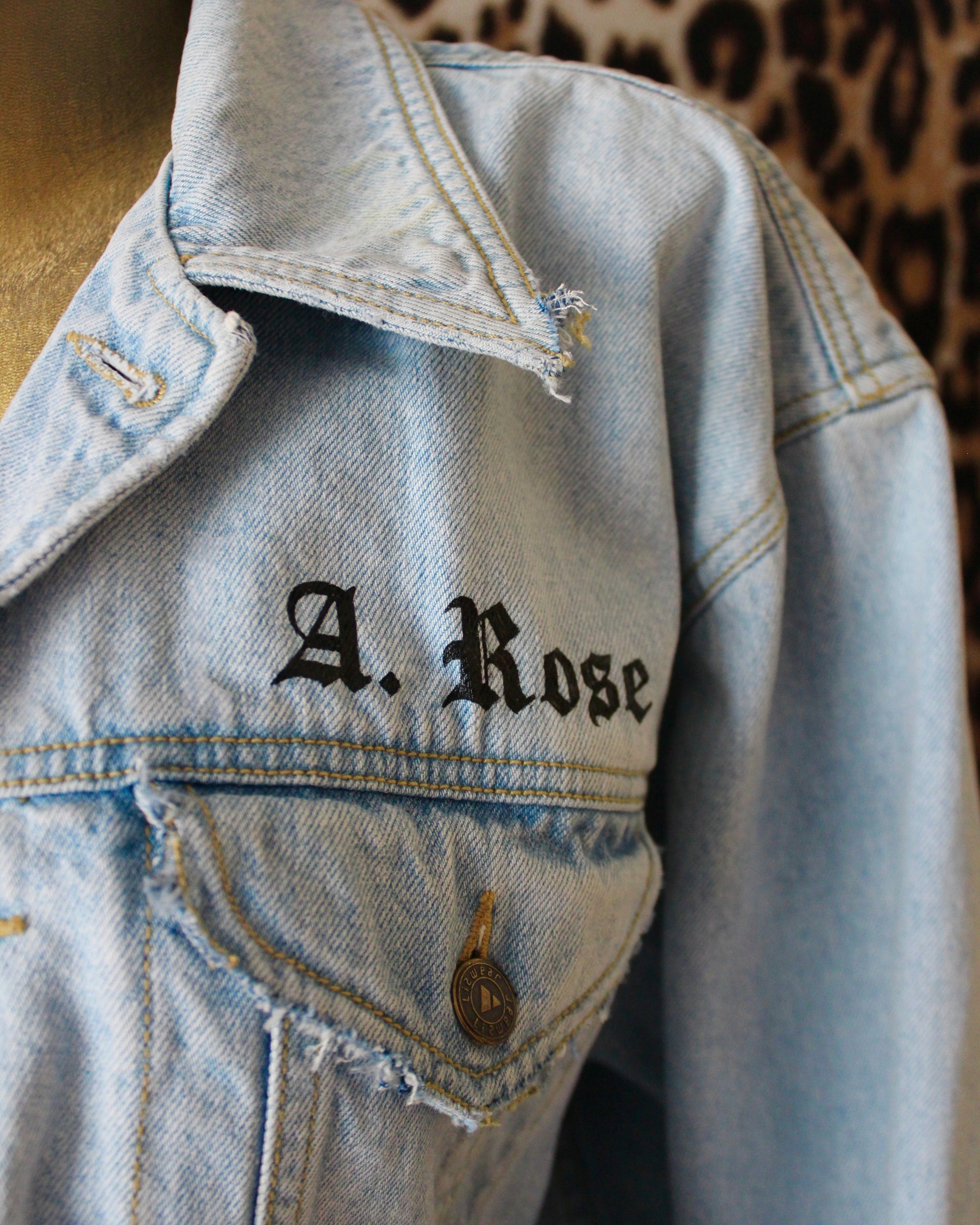 The Bad Obsession Jacket is a light wash denim jacket circa 90s/Y2K by Lizwear. This custom piece features a badass Guns N Roses graphic on the back (made of thick, patch-like materials) and hand painted ‘A. Rose’ on the front for frontman Axl Rose. Denim burnt and distressed by hand to give it a worn in look. A one of a kind Thunderstruck original that will never be made again. Oversized fit. Size Women’s Small/Medium; see measurements below!