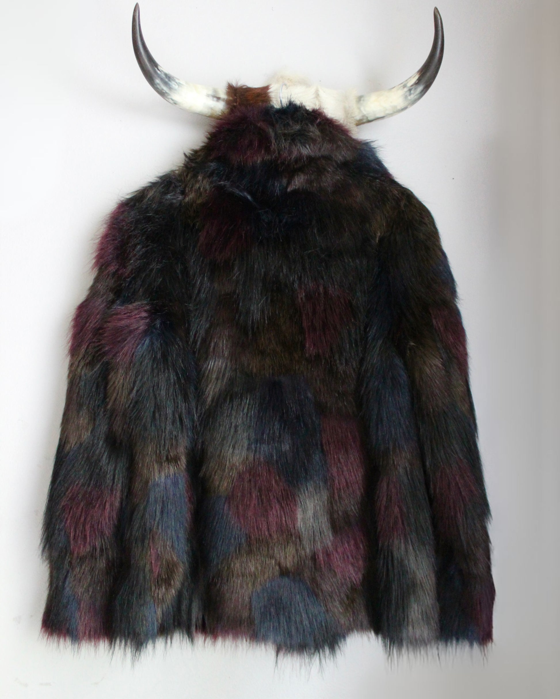 It just doesn’t get better than this glam rock multi-colored faux fur coat. This piece features front pockets, fabulous oversized collar and lapels, super fluffy and soft quality faux fur in a muted color pallet and two hidden hook closures inside. A modern piece with a vintage look. Although this is faux fur, it is heavy duty and quality. Original tags missing; would fit a Women’s Medium best. See measurements below!