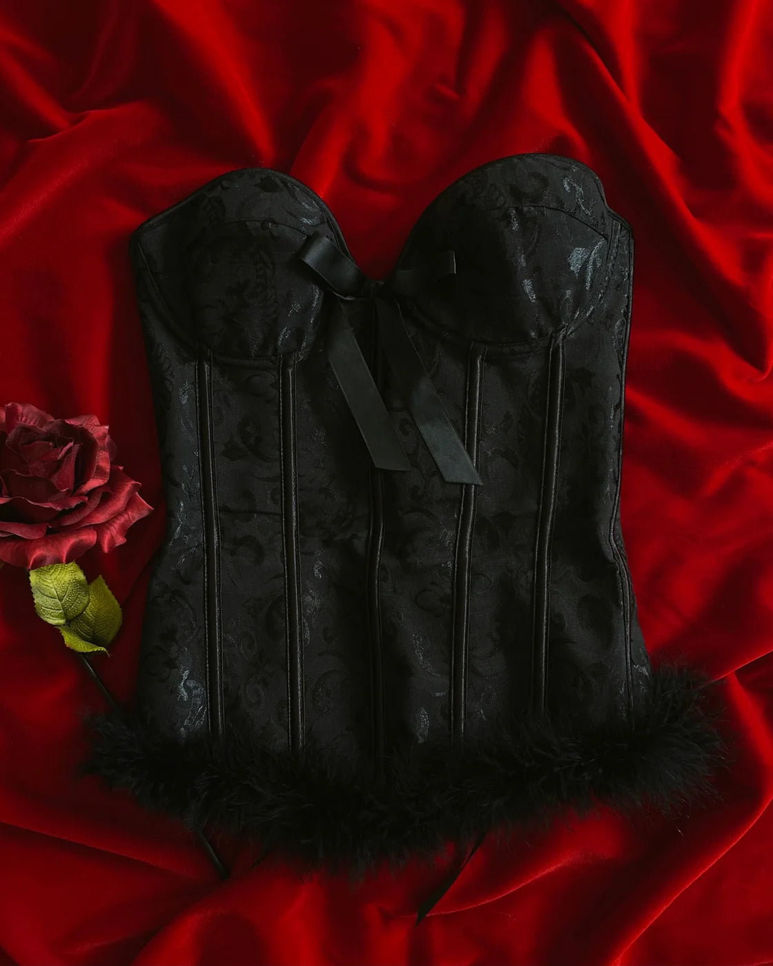 Hard to beat the timelessness of a corset — this one is extra special because of the little details. This Y2K number by Shirley of Hollywood features a subtle print, boning for structure, faux fur trim, a bow in the center, underwire and light padding in the cups, laces up the back (with a panel inside so you can adjust it to your desired fit) and a zipper on the side, making it easy to get on and off. Natural indentation at waist were it was fitted to original owner. Marked as a size Women's Small, would not recommend for cup sizes under a C.