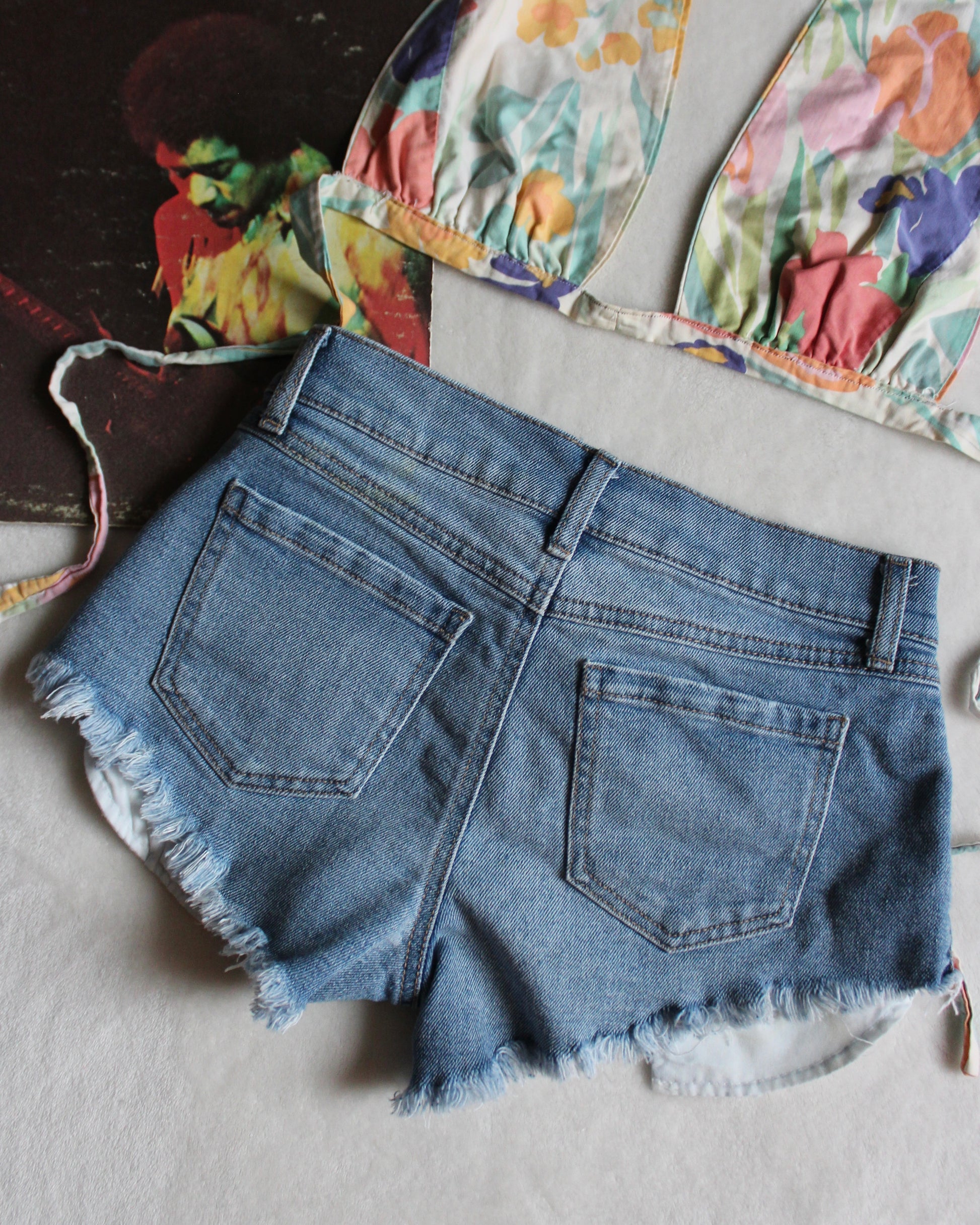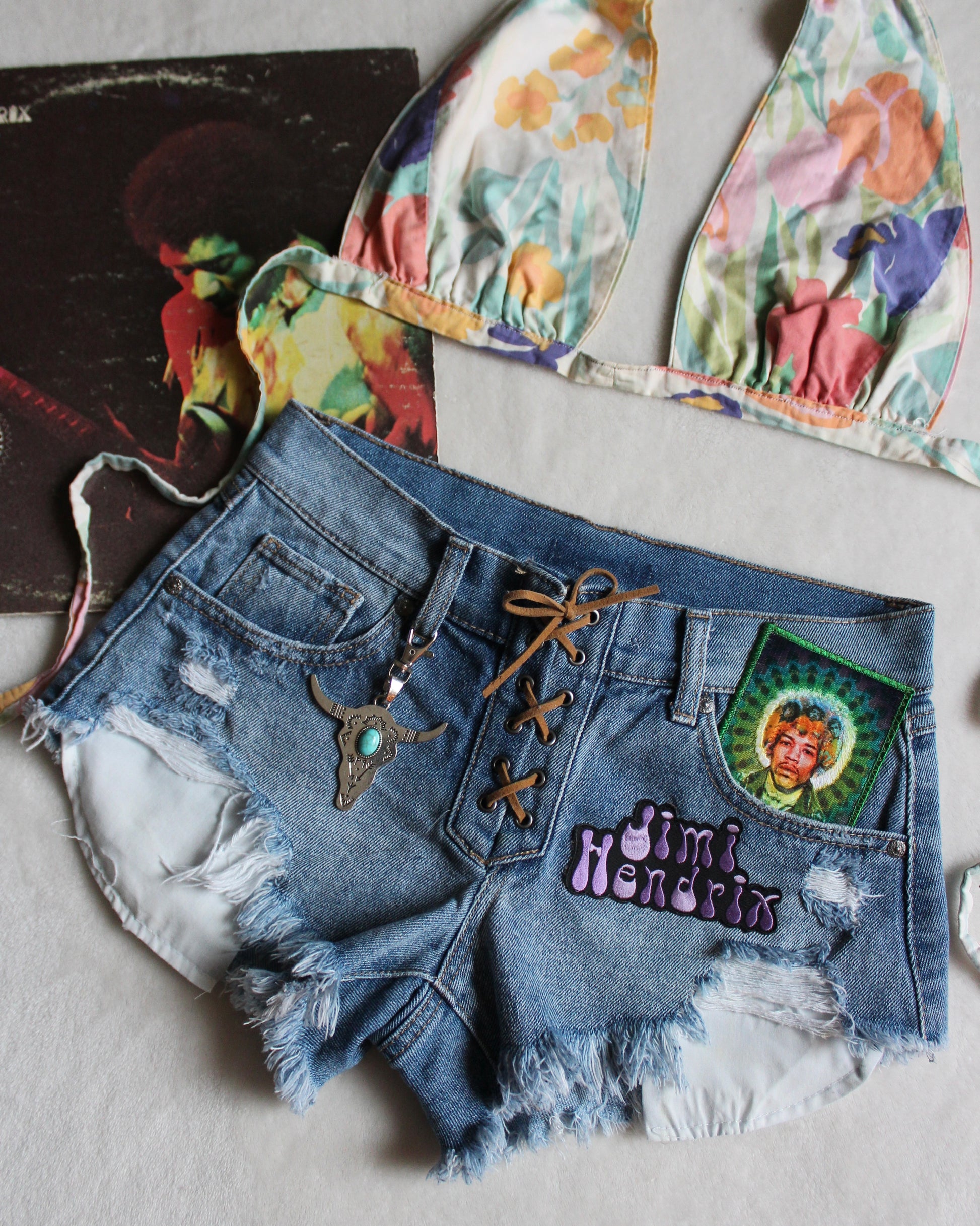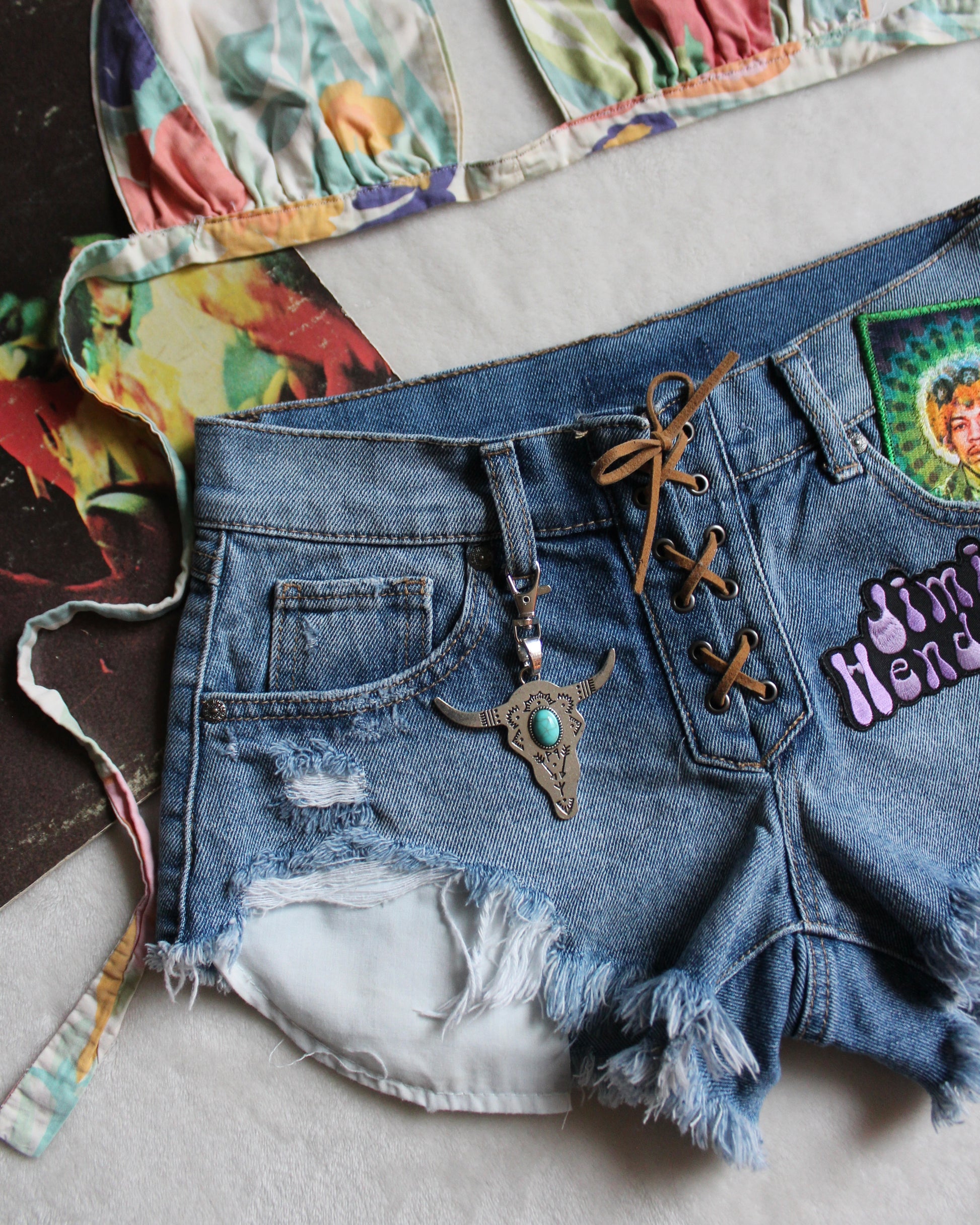 Introducing: The Hendrix Shorts. Your new favorite go-to denim cutoffs for making a statement and repping one of the greatest guitar players to ever live. Featuring two Jimi Hendrix patches (sewn down), lace up detail, the perfect medium wash, distressed hems and a steer skull pendant. A one of a kind Thunderstruck piece that will never be made again. Small flaw on back (see last picture). Would fit a Women’s XS best; see measurements below!