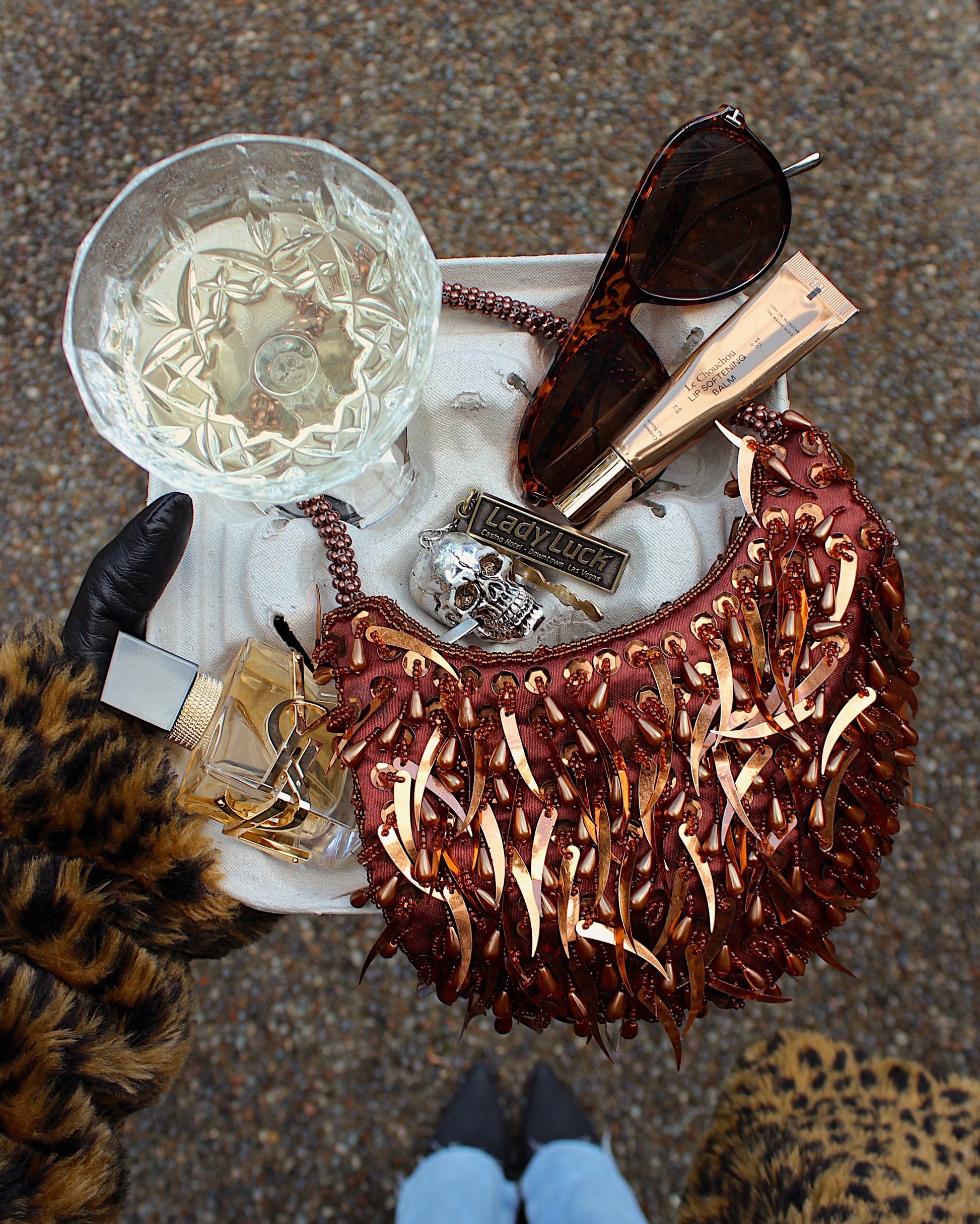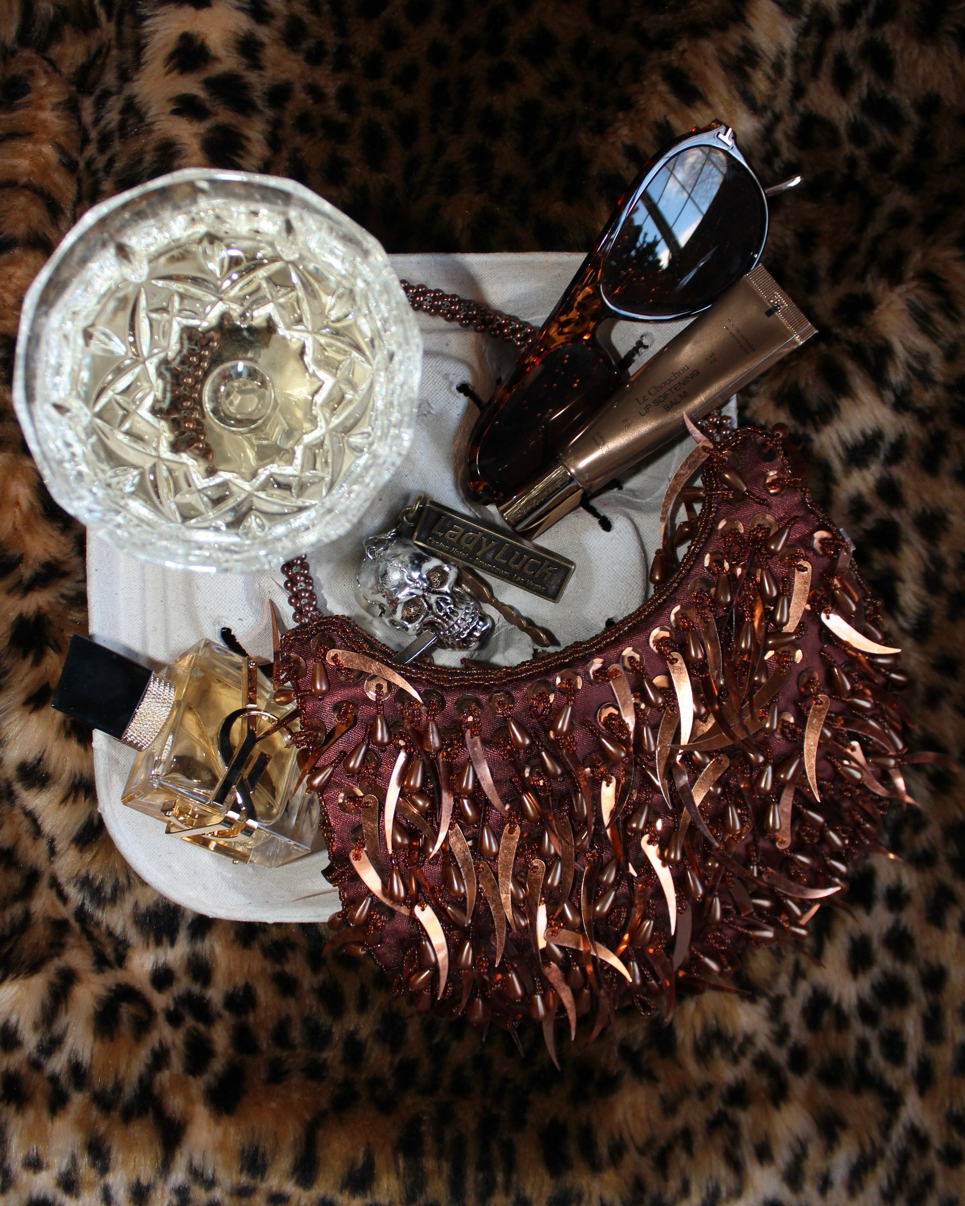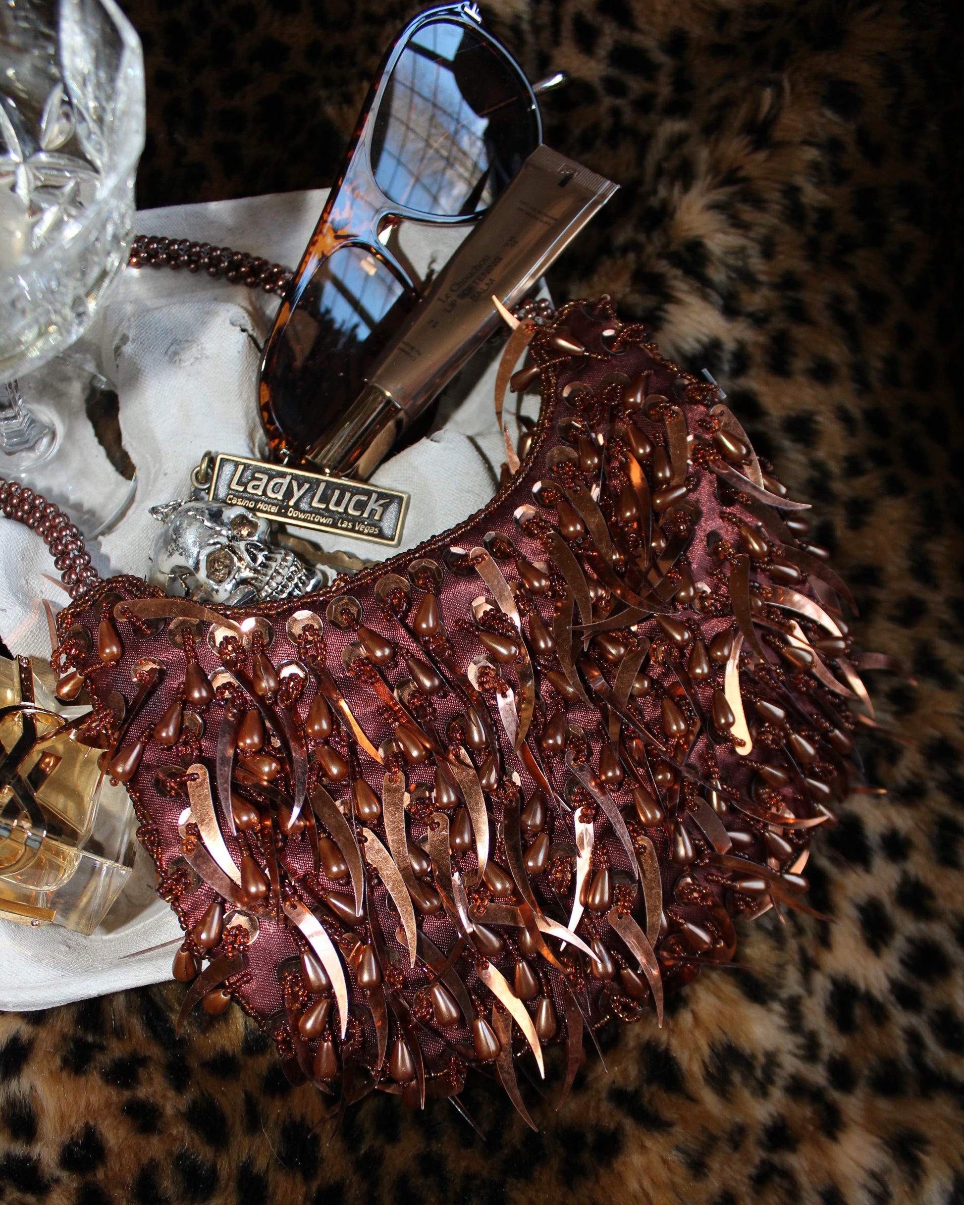 Copper colored mini bag featuring a beaded handle, zipper at the top to keep your goods secure, beaded/sequin details all over that sway when you walk. A bag just big enough to hold the essentials and still remain the life of the party. Measures approx 7.5” wide by 5.5” tall.