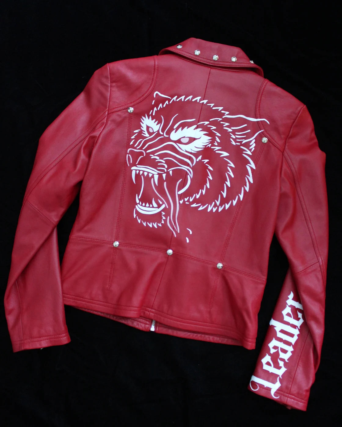 A red hot genuine leather custom jacket featuring hand painted lettering down the right arm and a traditional-style wolf on the back. Silver studded by hand. Features two zipped pockets. A one of a kind Thunderstruck original that will never be made again. Leather itself by Kenneth Cole. Size Women's Small; see measurements below!