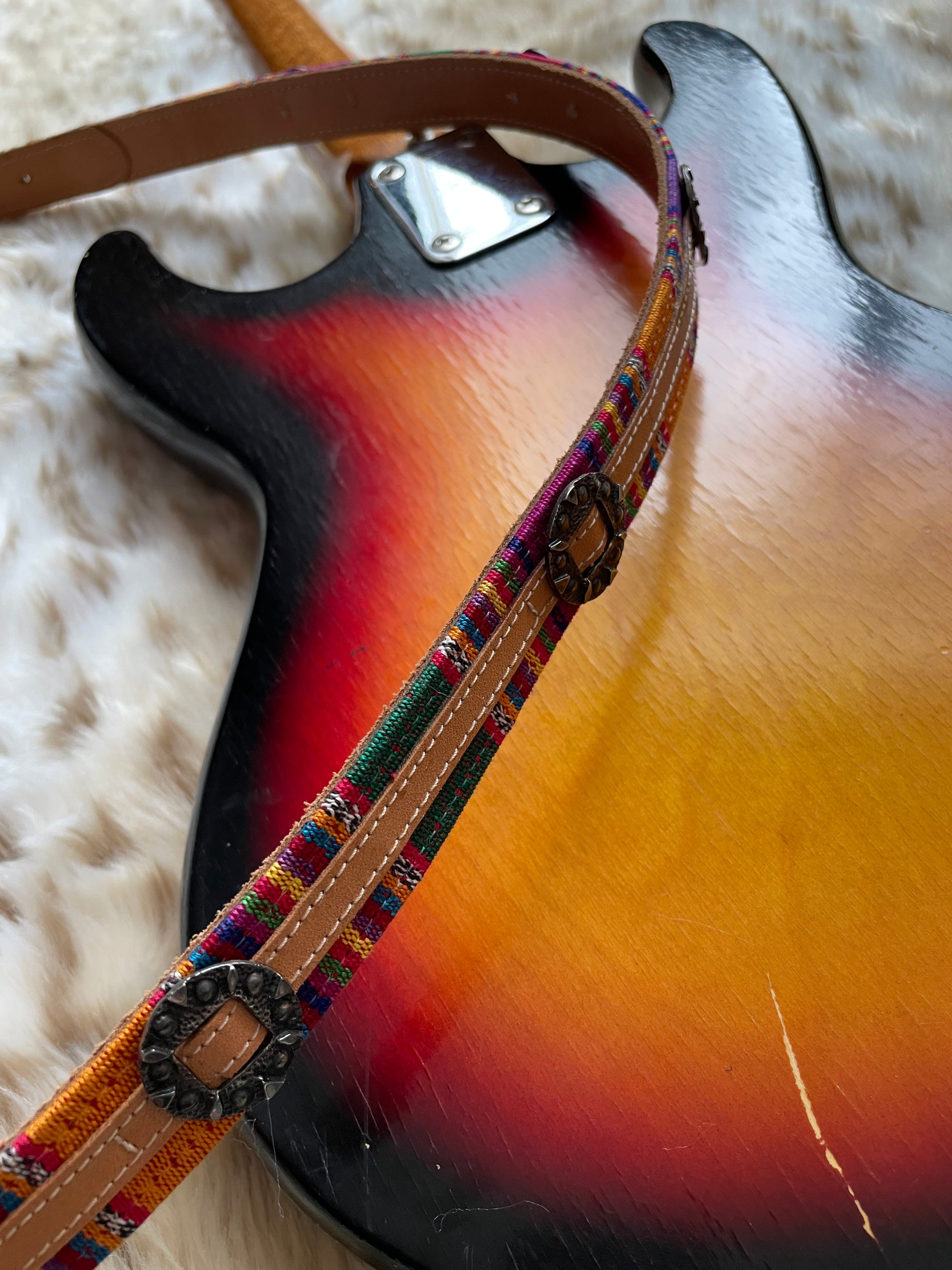 Incredible vintage belt by Omega featuring silver embossed buckle/belt tip, multicolored design and textured conchos. In beautiful vintage condition with a few minor flaws from age. Made in Guatemala. 100% Leather and Cotton. Can fit waist sizes 29” — 31” (Women’s Med).