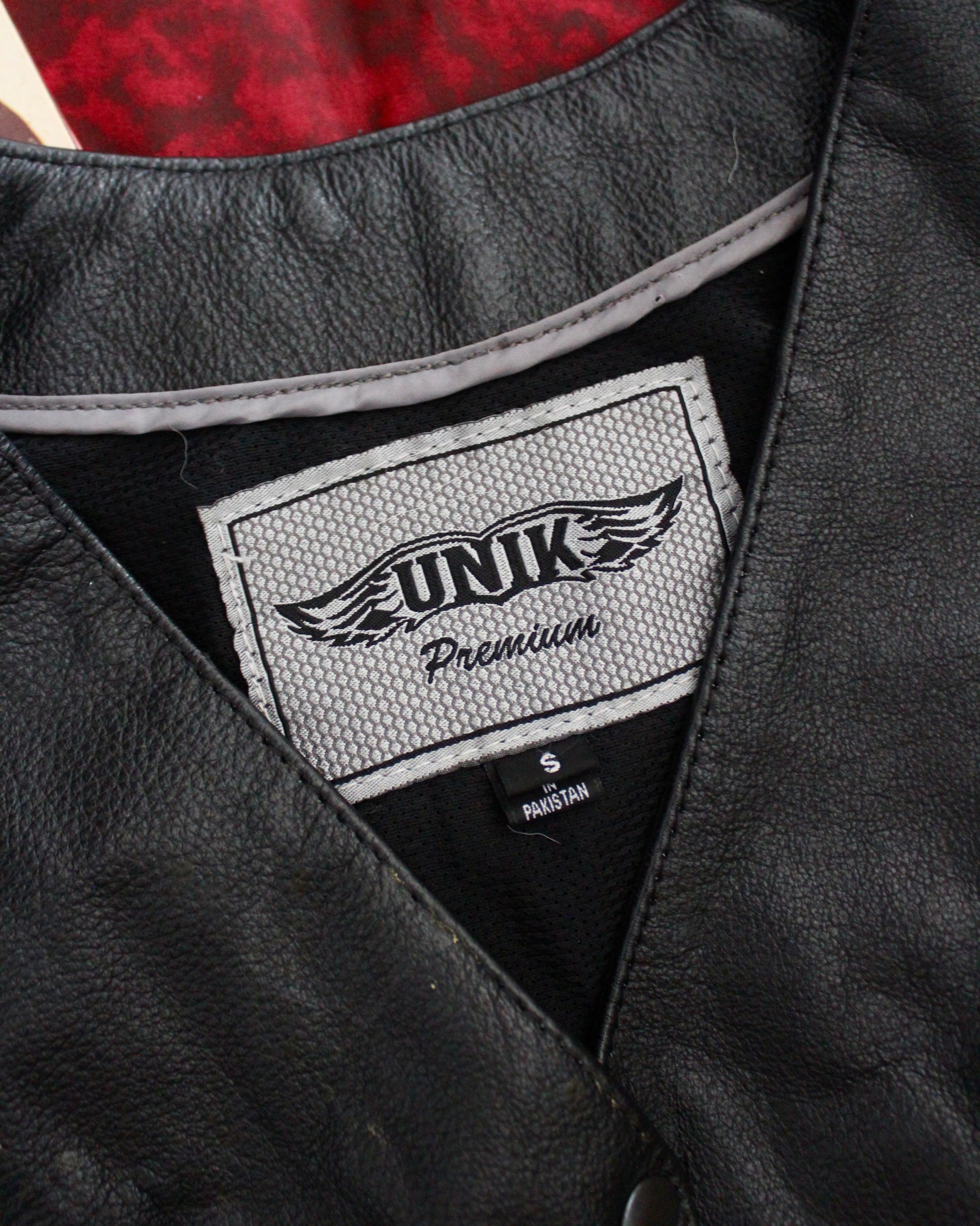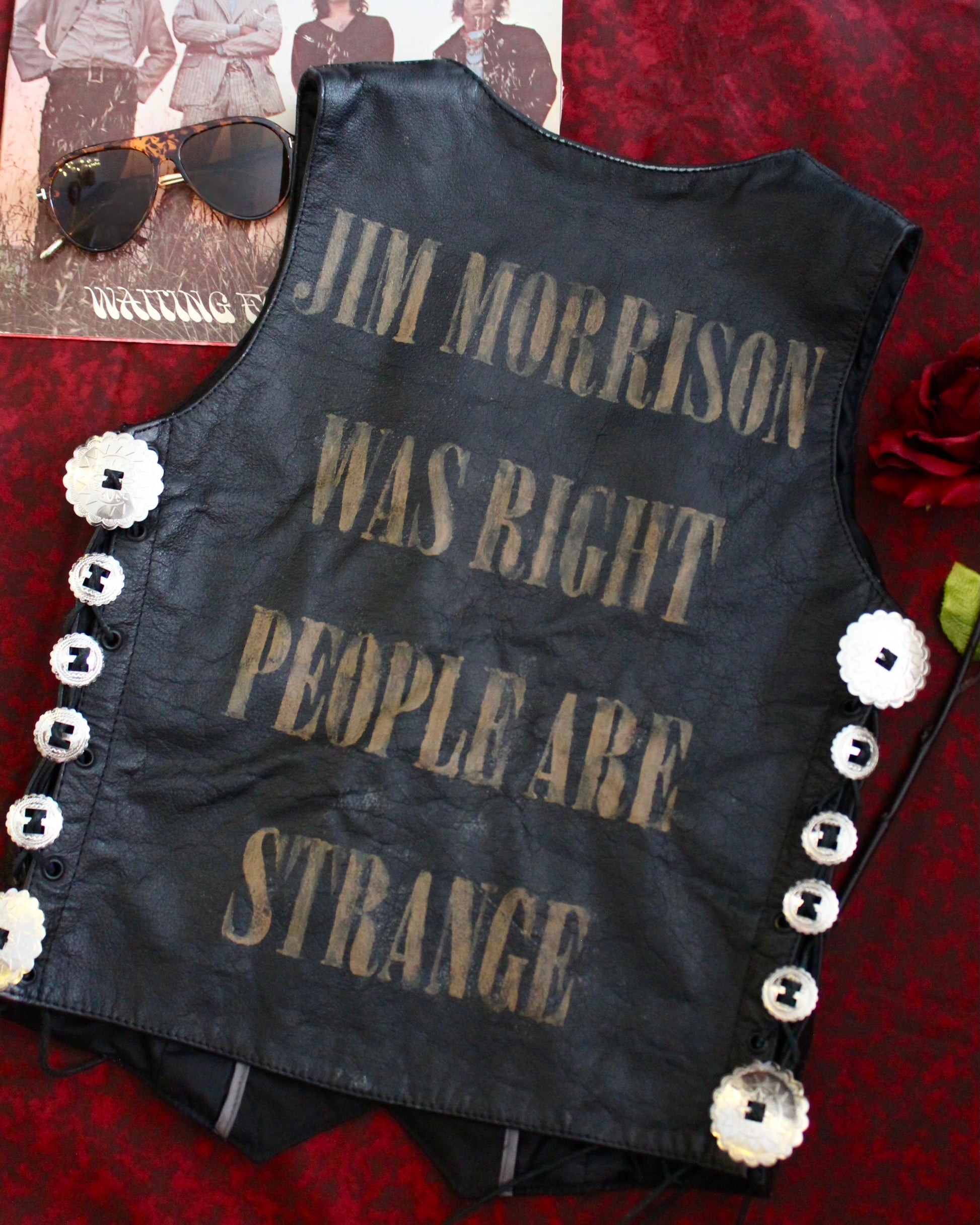 The Morrison Vest is a genuine leather black moto style vest featuring silver conchos, leather laced sides, four snap buttons down the front, two outside pockets, two deep inside pockets (with snap button closures), more conchos and studs on front and a hand painted saying on the back: “Jim Morrison Was Right, People Are Strange”. Distressed by hand to look straight outta 1968. High quality leather by Unik Premium. A one of a kind Thunderstruck piece that will never be made again. Marked as a size Women’s Small; see measurements below!
