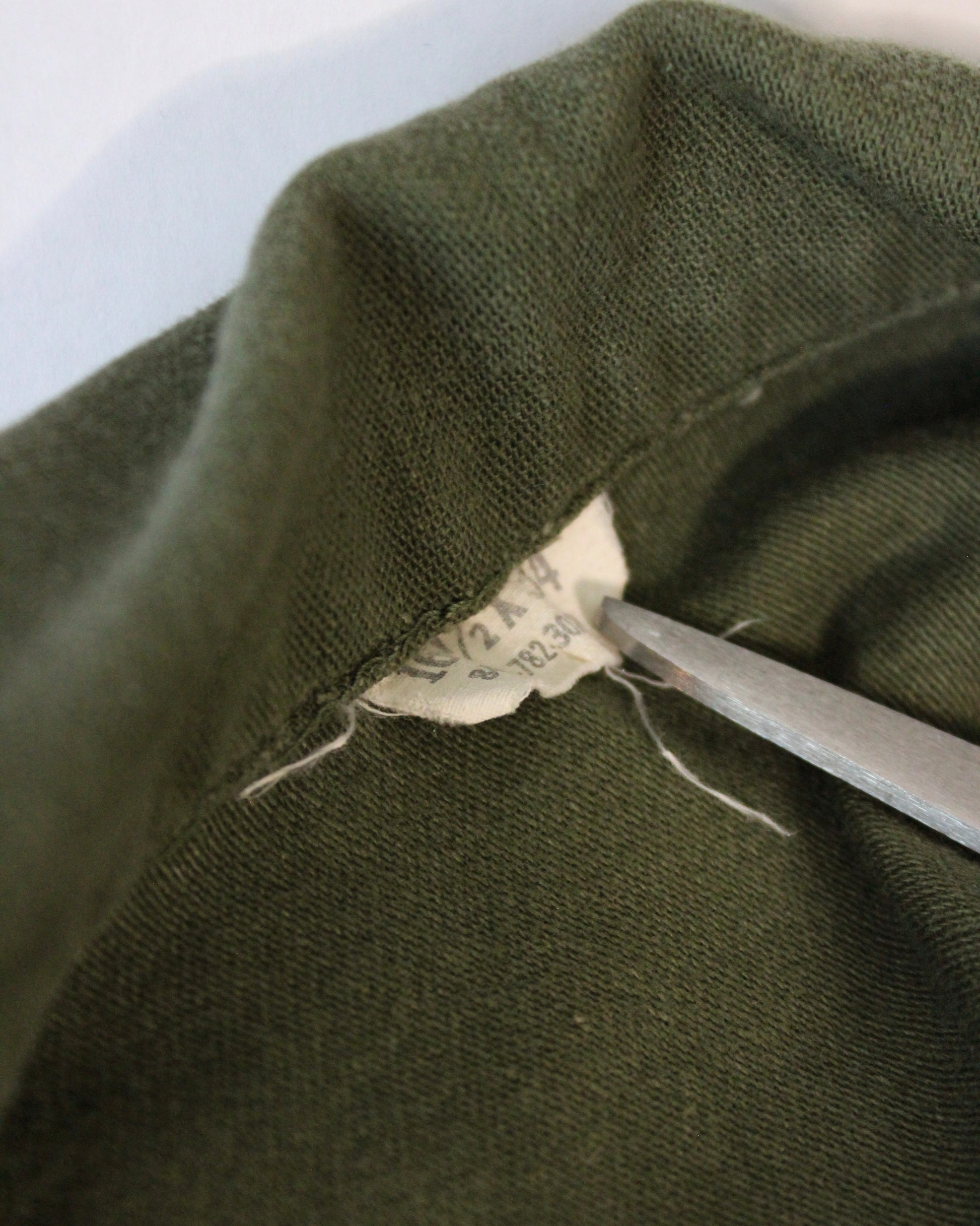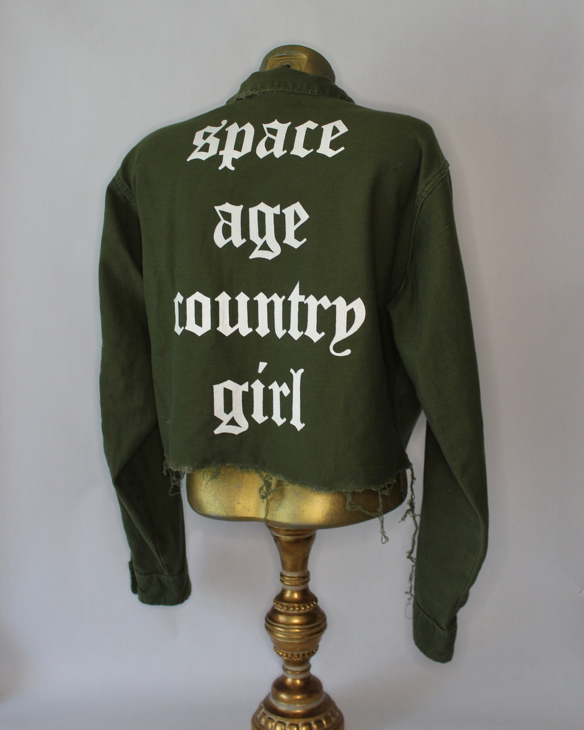 Inspired by Arctic Monkey’s song ‘I Want It All’, we bring you: The Space Age Country Girl Jacket. This vintage 60s/70s Vietnam era piece features hand painted lyrics on the back, western style studded accents on the front pockets, silver conchos and silver studs. Cropped raw hem and hand distressed throughout. Buttons down the front. Made for a cosmic cowgirl. Can fit Women’s Small — Large, depending how oversized/cropped you want it to fit. See measurements below!