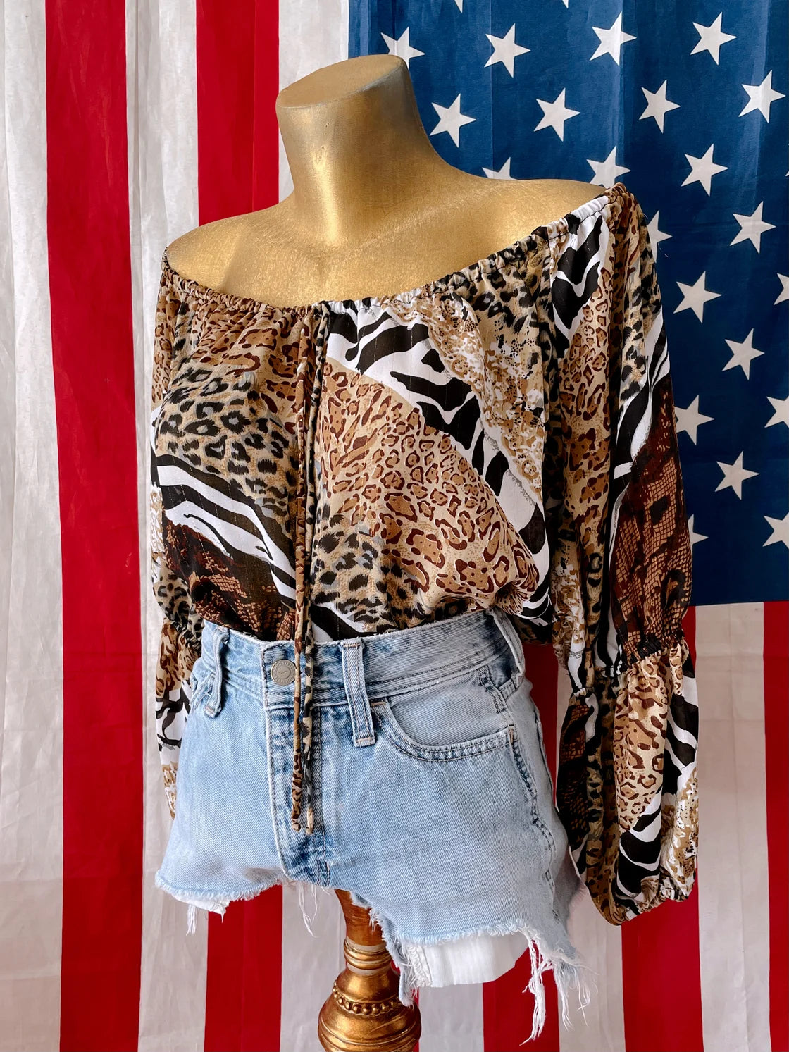 Release your wild side in this fabulous top by Feathers. Featuring cheetah, snake, leopard, and zebra print on semi-sheer fabric. Off the shoulder. Elastic on arms and bottom hem. Little tie detail on the neckline. Subtle gold pinstripes. Not vintage, just cute! Size Women's Medium; see measurements below!