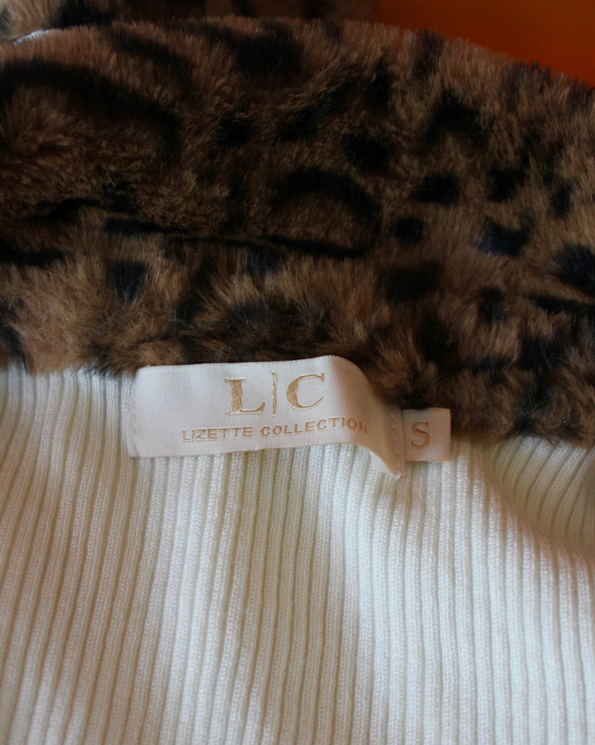 A modern take on a 90s style — and done perfectly. This fabulous cream zip-up sweater by Lizette Collection features stretchy ribbed cream fabric, o-ring zipper and super soft leopard faux fur trim sleeve cuffs and collar. Size Women’s Small; see measurements below!
