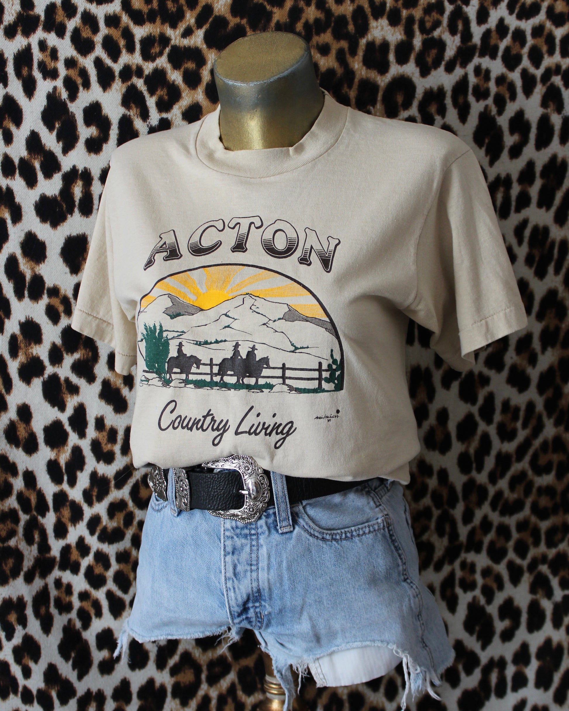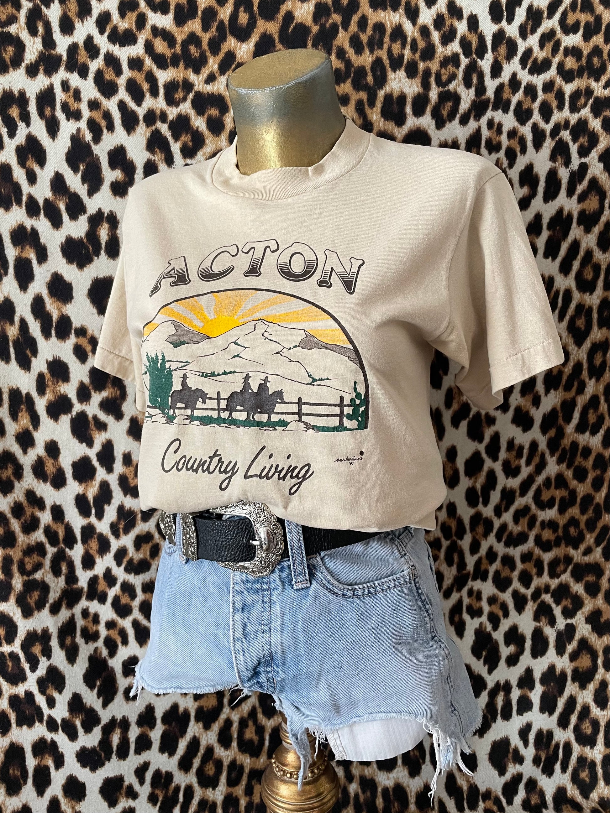 Coolest vintage 1989 Acton, California “Country Living” tee. Featuring a western style graphic on a tan, soft, perfecrly worn in tee. 50% Cotton, 50% Polyester. Has some minor flaws, see all pictures. By Screen Stars Best. Made in USA. Marked as an adults size Medium; see measurements below!