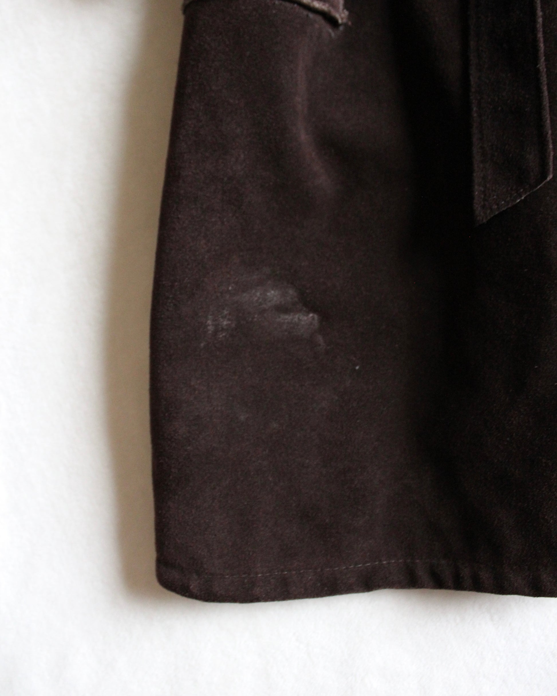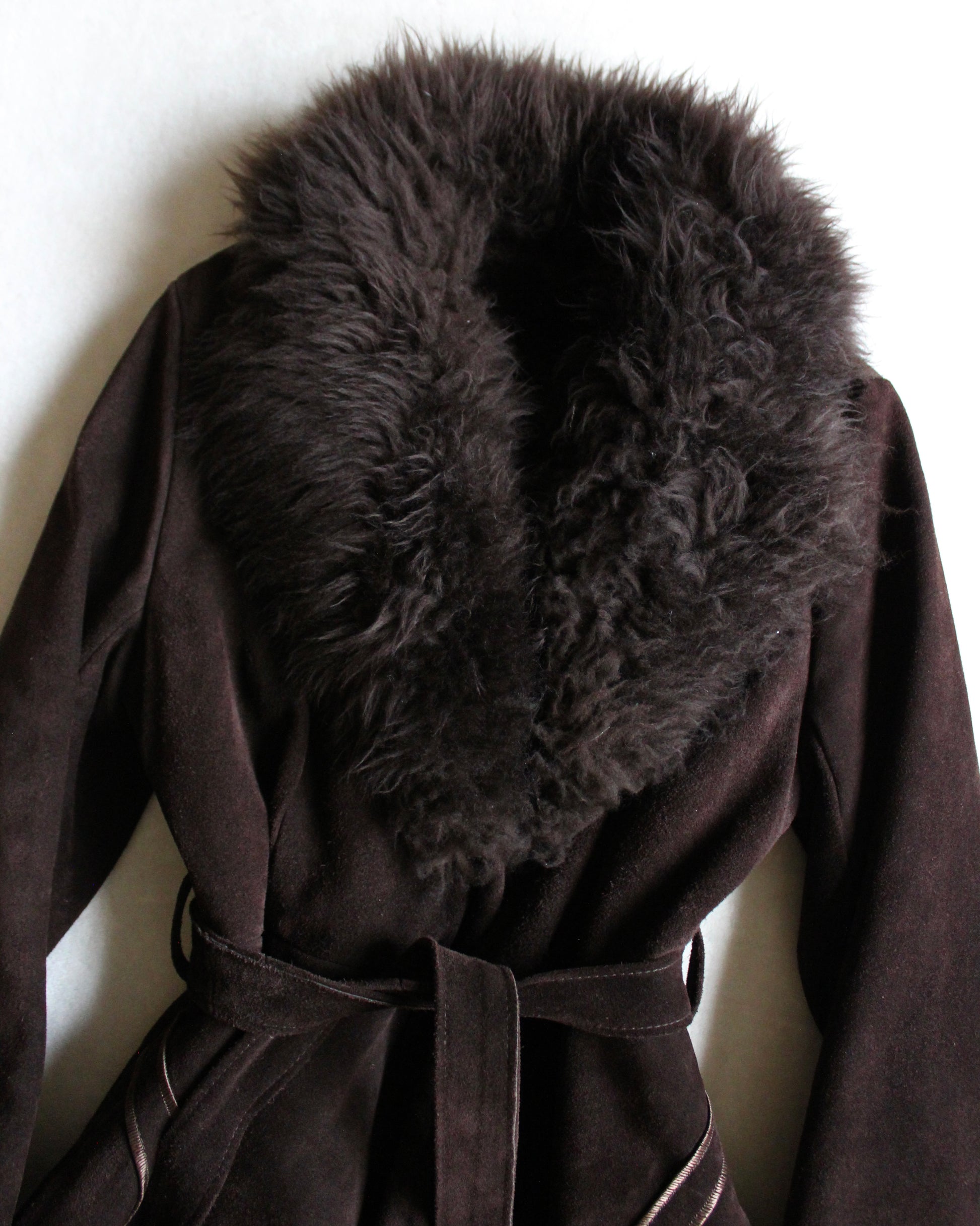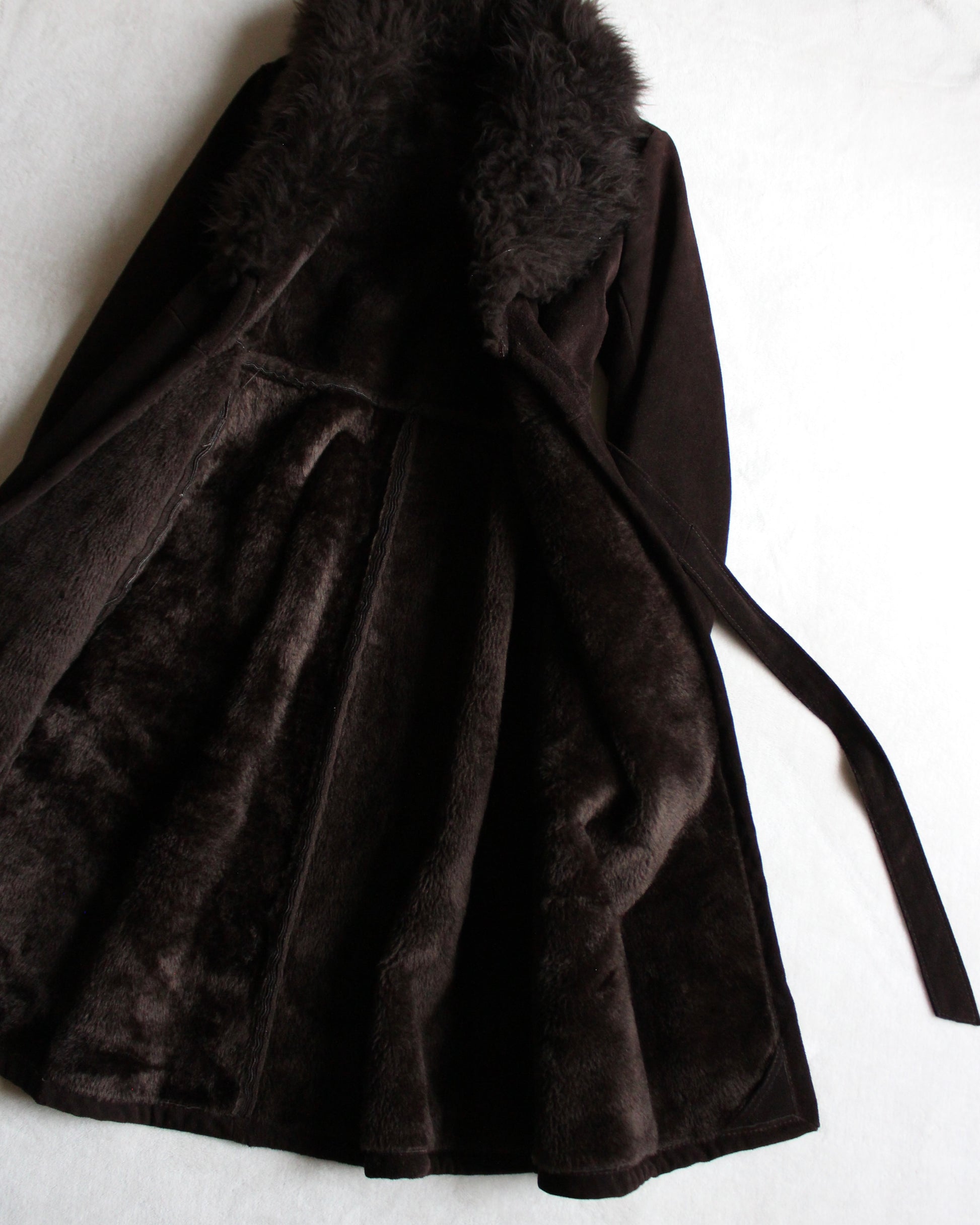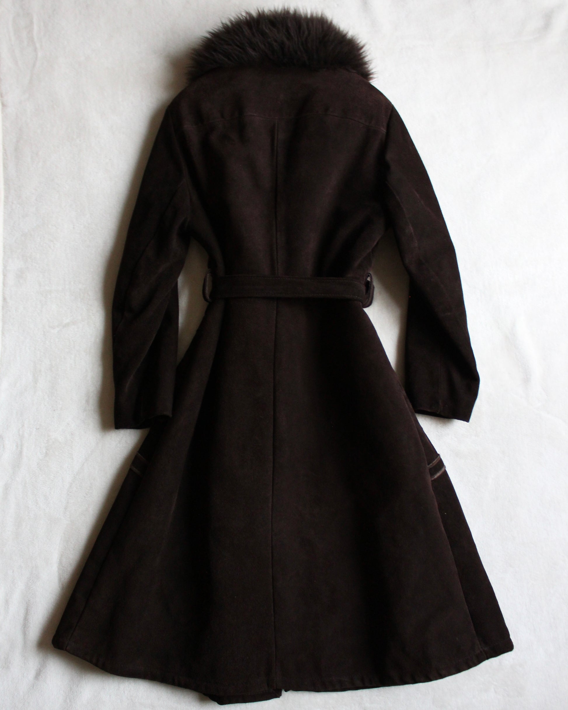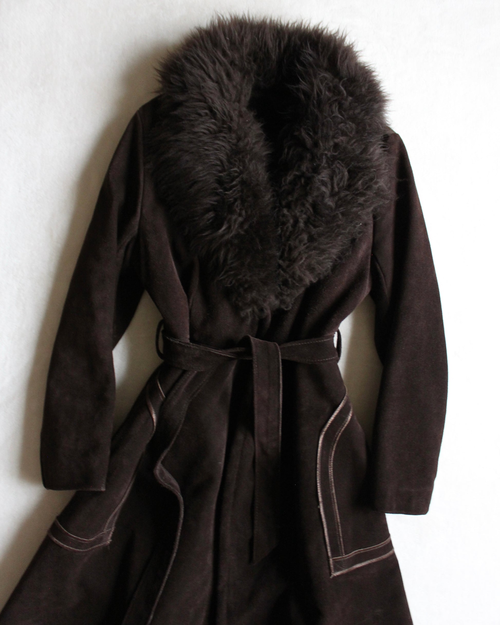If “main character” was a piece of clothing, it would be this vintage 1970s chocolate brown full suede leather coat. This Penny Lane style number features front pockets (check out that incredible stitch detailing), a soft and cozy inside lining to keep you extra warm, a big fur (most likely faux fur) collar and a belt to snatch your waist. One of the coolest and heaviest coats we’ve ever seen. One small flaw on front, see last picture. Would fit a Women’s Small best; see measurements below!
