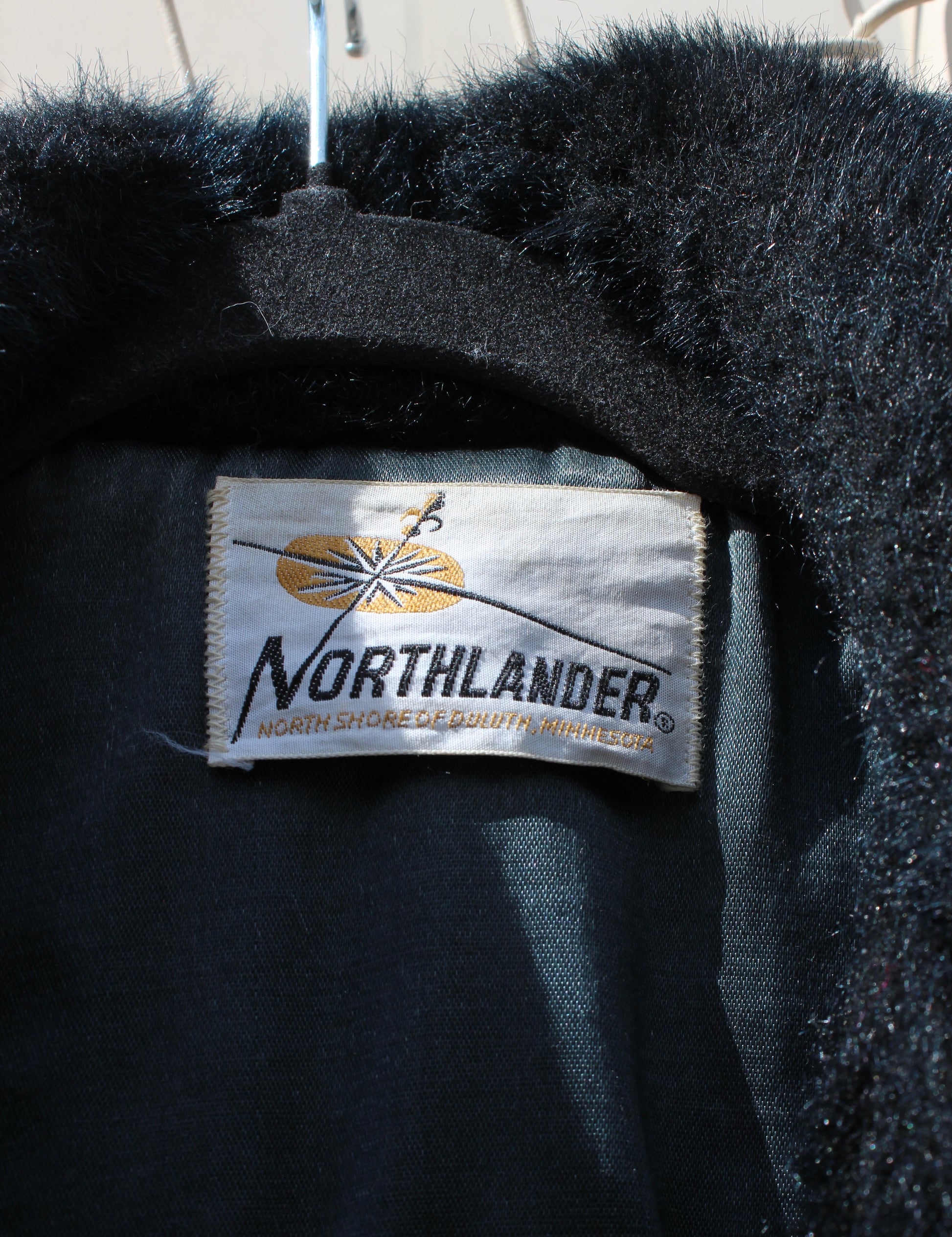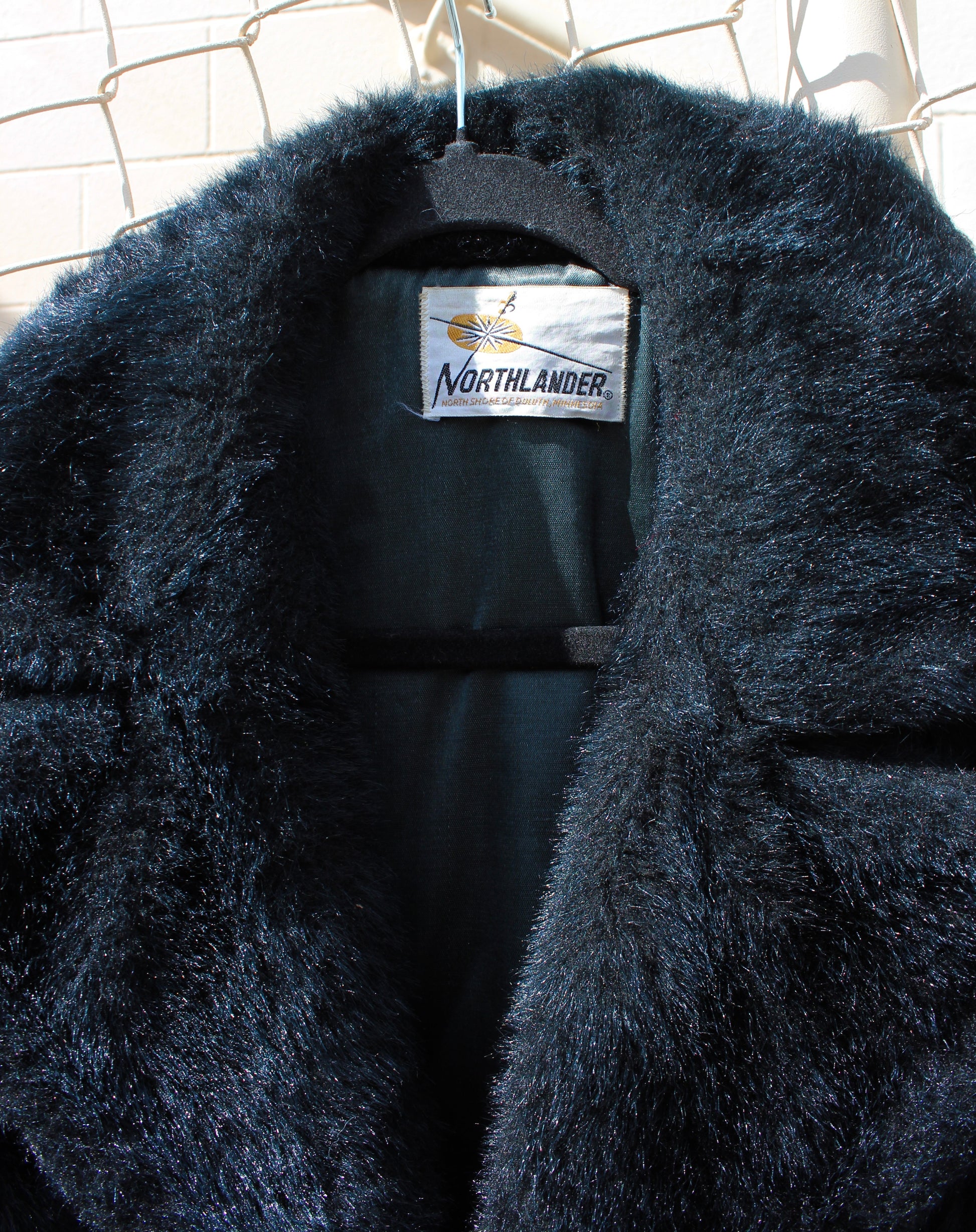 Midnight black vintage faux fur coat by Northlander featuring a wide, slightly rounded collar, two outside pockets and one inside pocket. Appears to be from 60s or 70s. A rockstar’s dream. From the North Shore of Duluth, Minnesota. Original buttons missing, priced accordingly. No size marked, would fit a Women’s Small best. See measurements below!