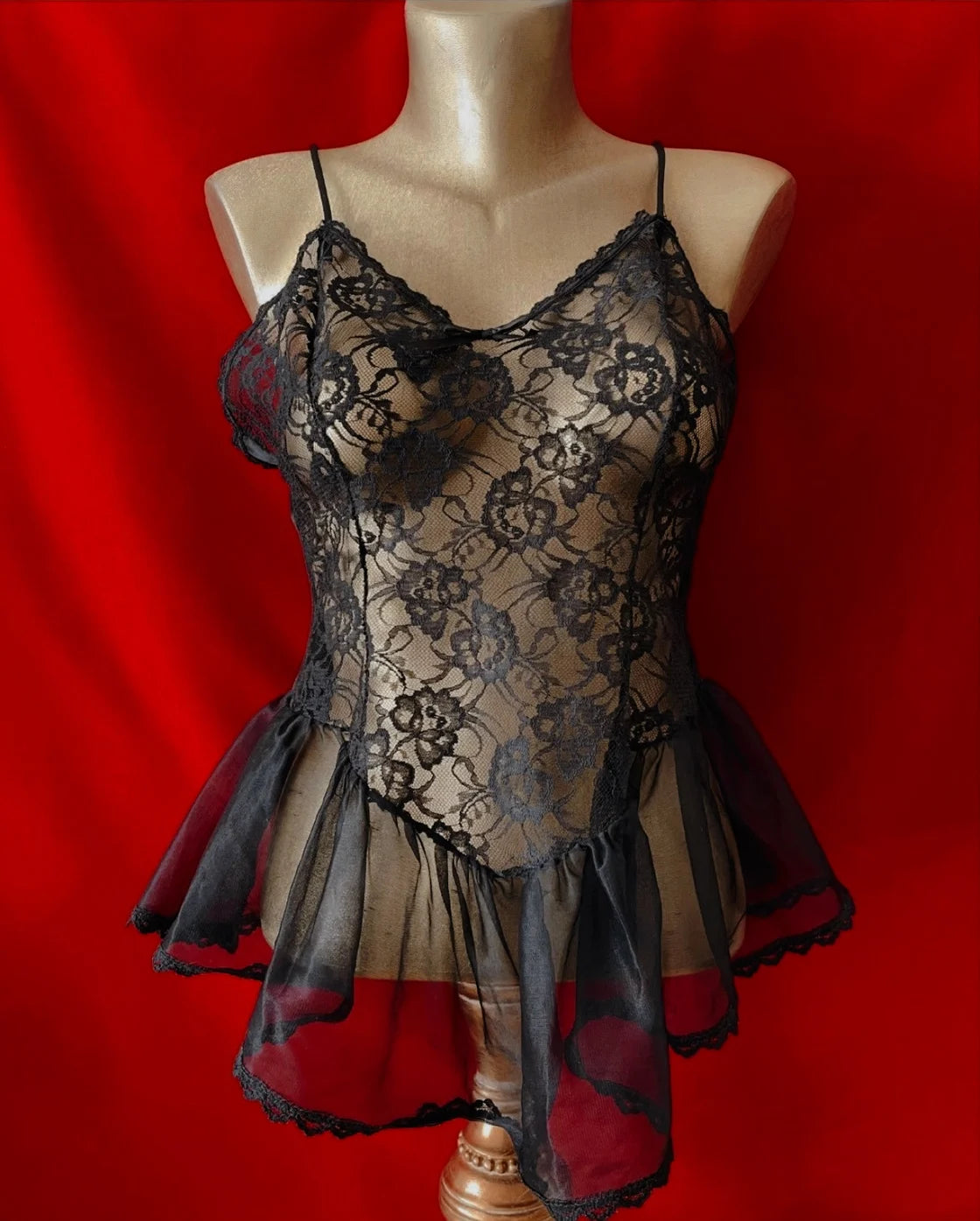 Vintage dainty babydoll piece. Featuring spaghetti straps, mesh pleating with lace trim, lace bodice, little silky bow, and flattering v cut waist. Made in USA. One small flaw by left strap. Size Women's Medium. See measurements below!