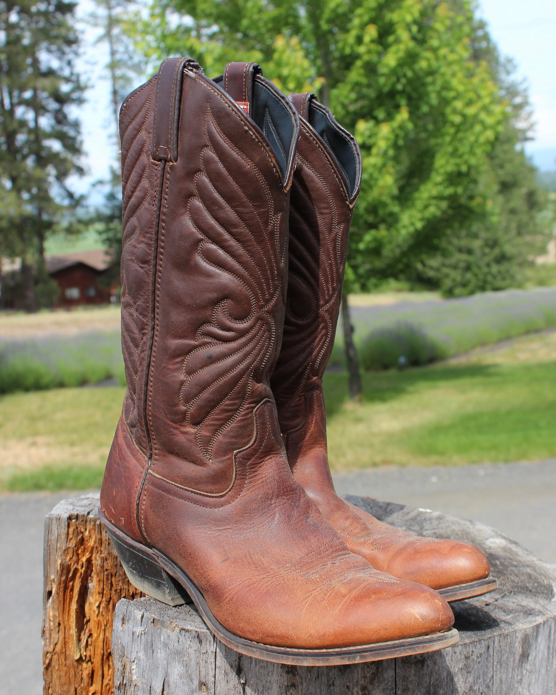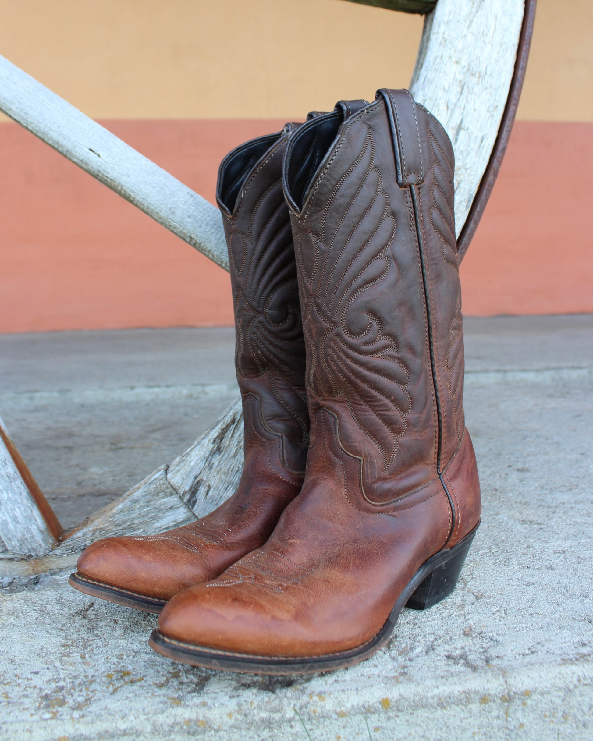 Gorgeous vintage brown leather boots by Santa Fe Boot Co. Quality and sturdy genuine leather. Classic Cuban heel. Drool-worthy butterfly stitching on the front AND back (to us, it also looks like the Trans Am Eagle). Shows normal wear due to age. Your new favorite boots for the summertime + all year long. Marked as a Women’s U.S. 7.5, would fit a 6.5 best. Best for small calves. Measures 12.5” top to bottom, including heel.