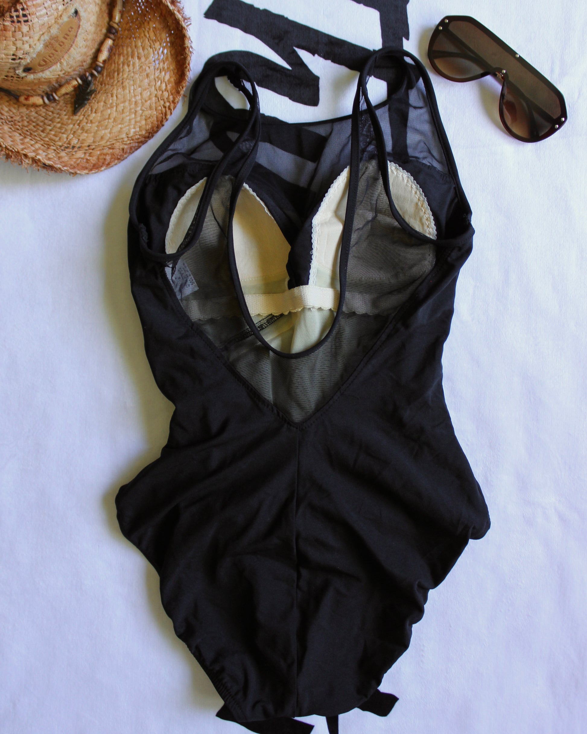 For the one’s that rock black head to toe year round. This one piece by Maxine of Hollywood features lightly padded cups, mesh details on the front and back, and gathering on the side for a sculpting flattering fit. Made in USA. Marked as a *vintage* Women’s U.S. 10; would fit a modern size Small best.