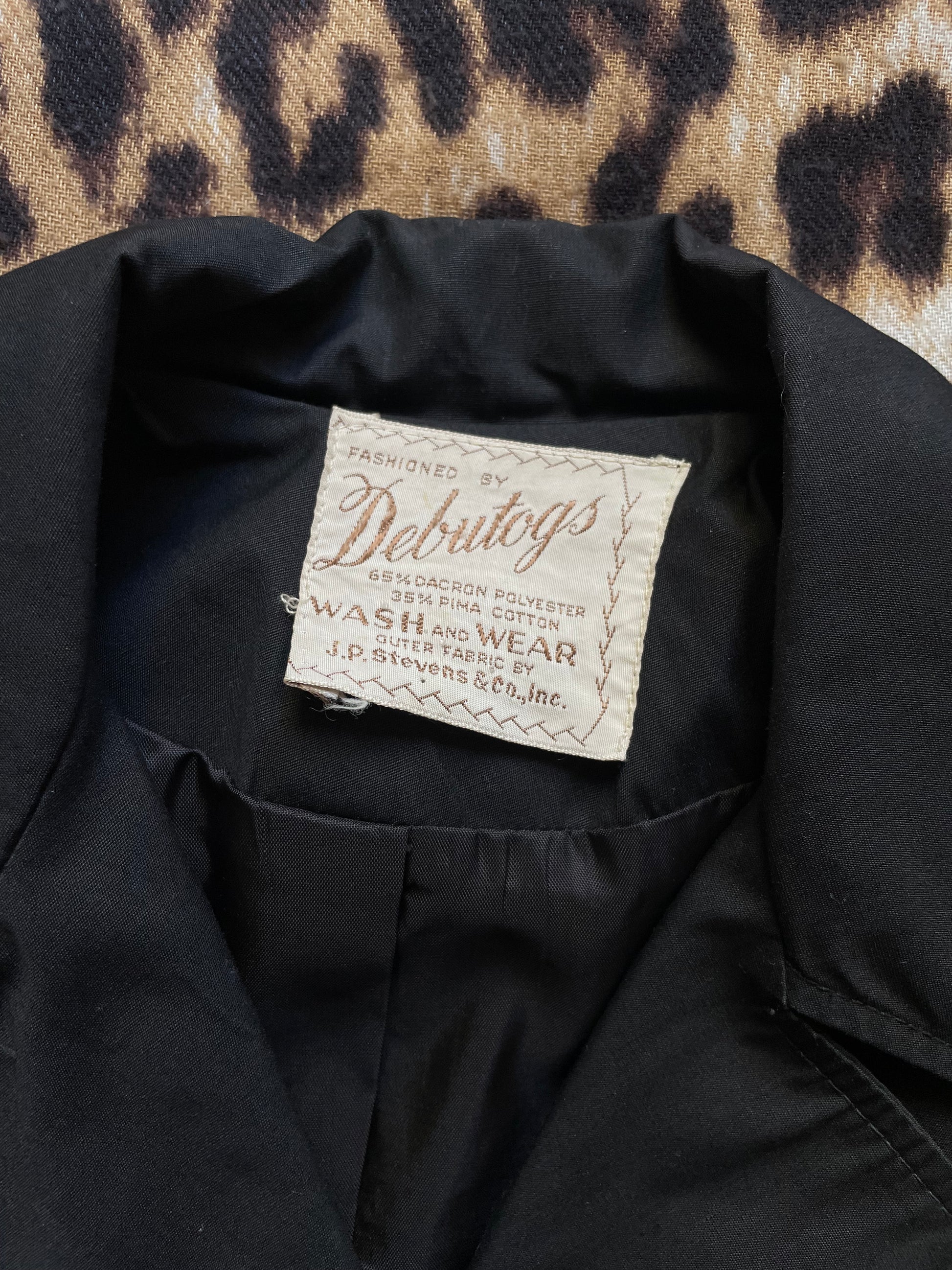 Nothing says mysterious dream girl quite like a classic black trench coat. The tag on this piece makes it 100x cooler. Vintage Debutogs featuring buttoned epaulets, double breasted buttons down the front, pockets, classic stitching on the front and back, belt loops and an adjustable belt. In good vintage condition, besides a few loose/missing stitches on armpit areas (see last two pictures). No sized marked; would fit a Women’s Medium best. See measurements below!