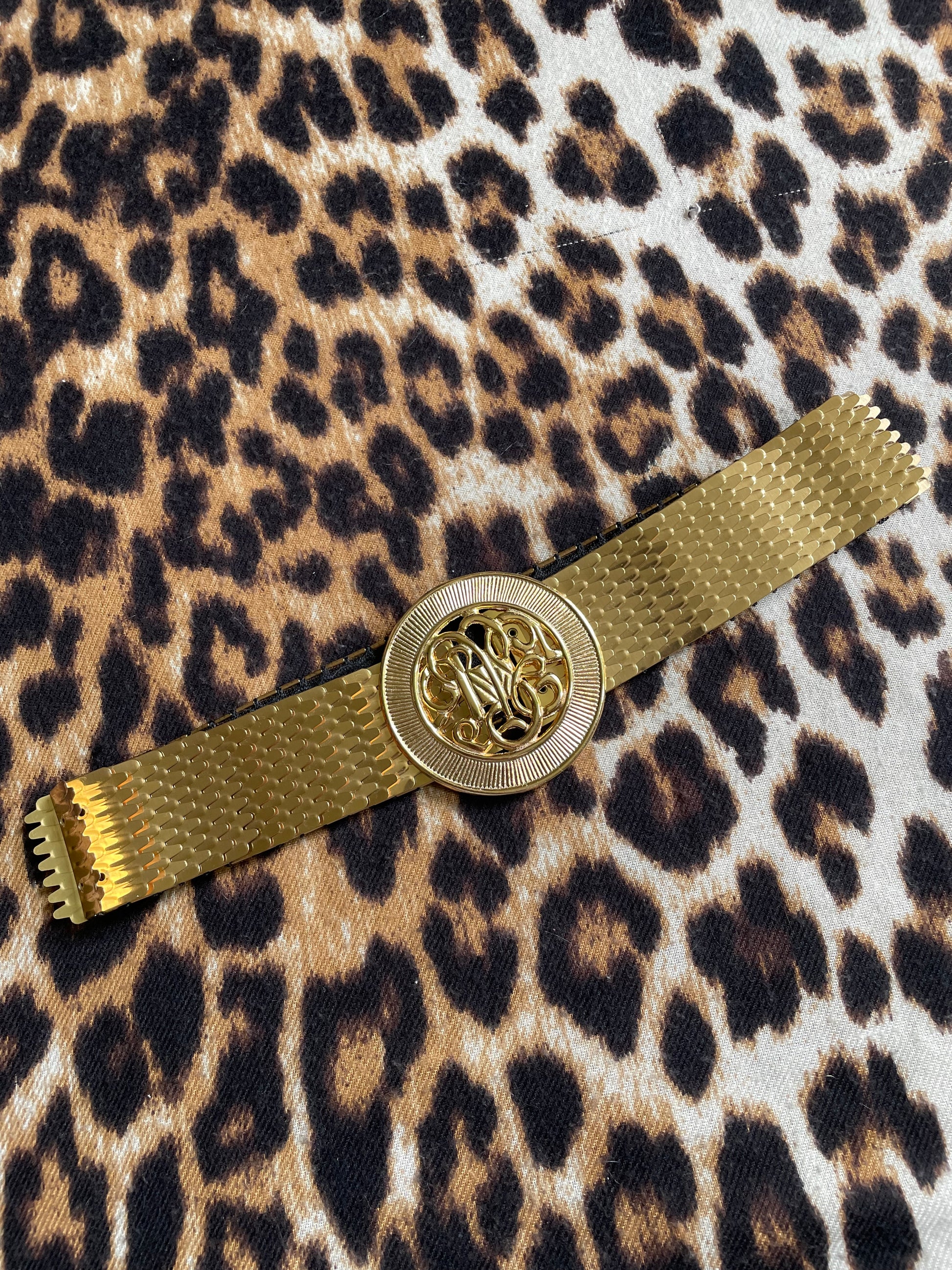 Vintage 1970s gold metal cinch belt featuring a round buckle and stretchy material for a perfect fit. Kept in beautiful condition. Whether you’re exaggerating the waist on a blazer or going full 70s Viva Las Vegas, this belt will do the trick. Size Women’s Small. Measures 24.5”, but is very stretchy.