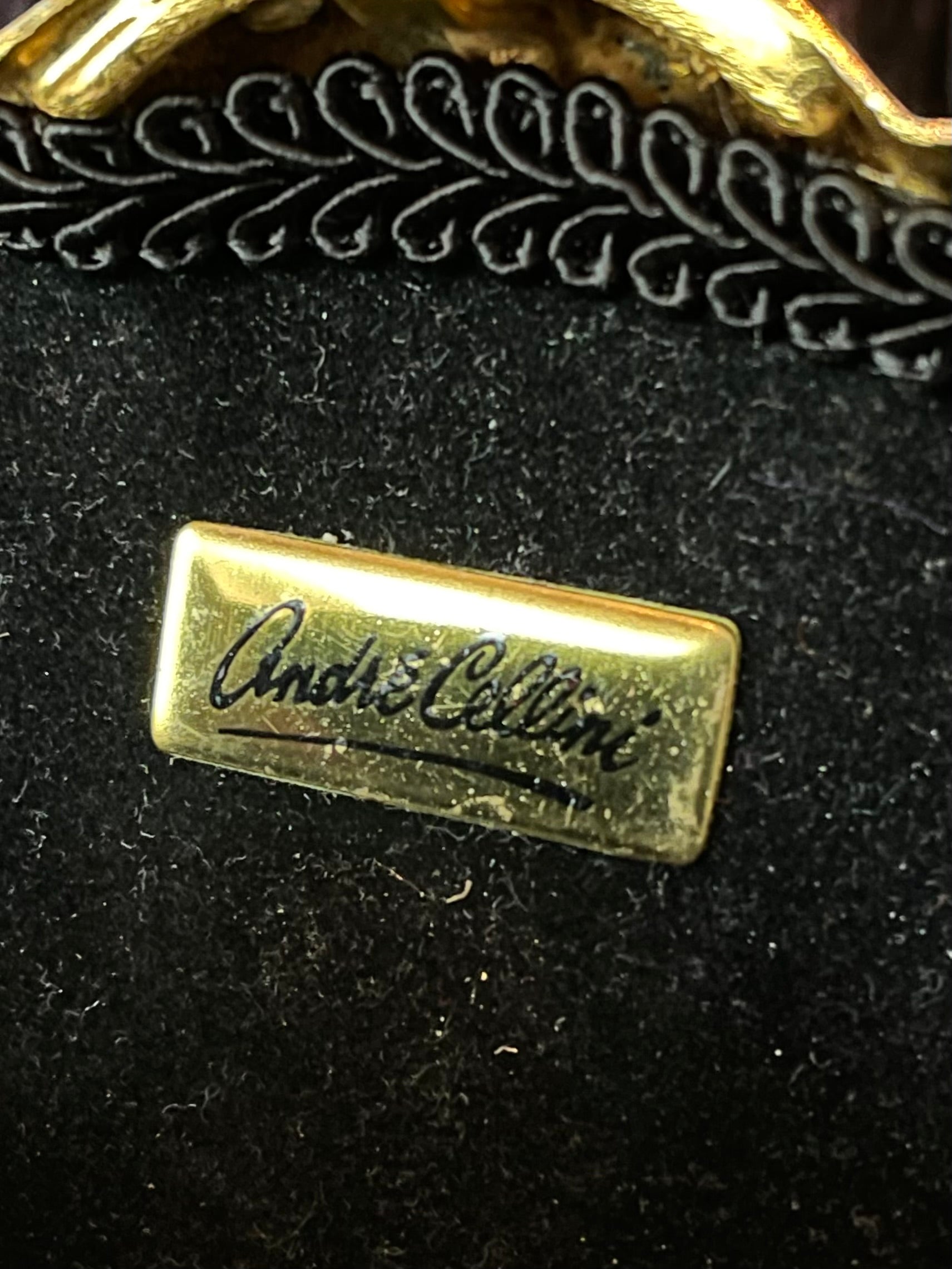 Did someone say the cutest bag ever? We’ve all seen the vintage beaded André Cellini bags but this hard shell design is a rarer Cellini design. Featuring a long chain strap (which can be tucked inside of bag if you’d rather carry it clutch style), metallic gold shell shaped body and black velour inside lining. Snaps open and shut. Measures approx 4.25” tall by 6.5” wide.