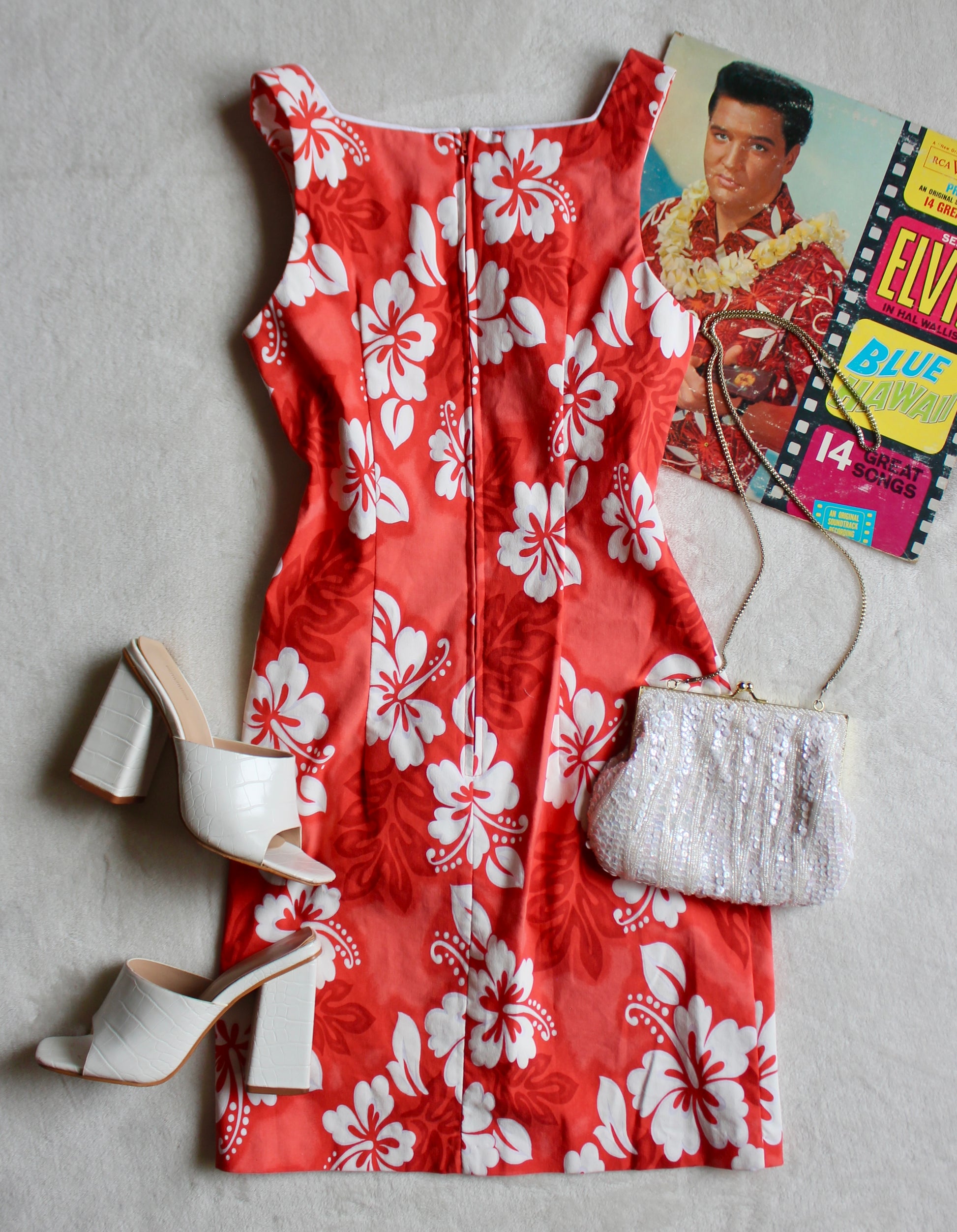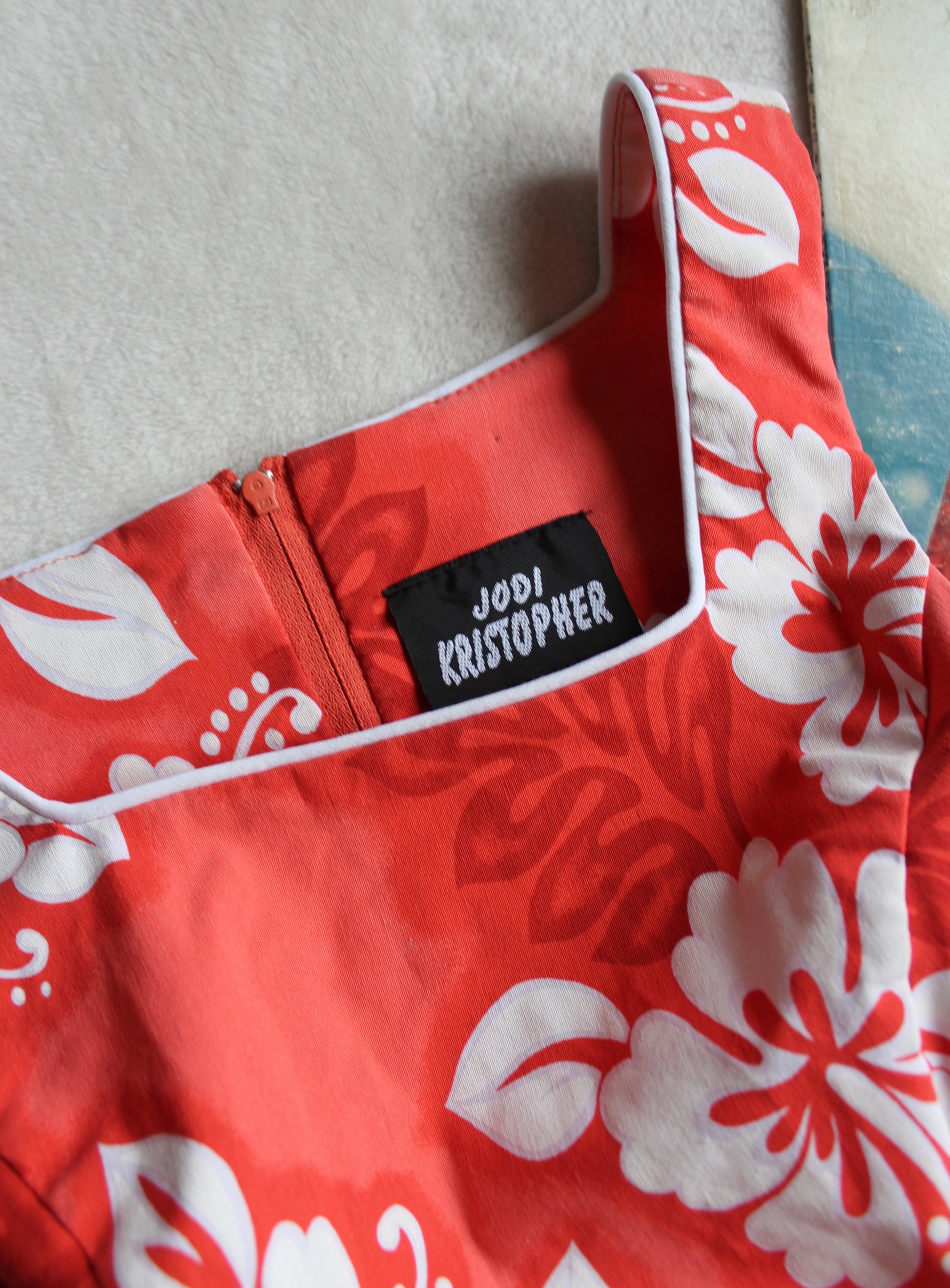 Instantly add some color and happiness to your life with this gorgeous vintage Hawaiian dress by Jodi Kristopher featuring a a square neckline with white piping, a 60s/70s style silhouette and zipper on the back. Material has a slight stretch to it, making it more comfortable on. No size marked; would fit a Women’s XS/Small best. See measurements below!