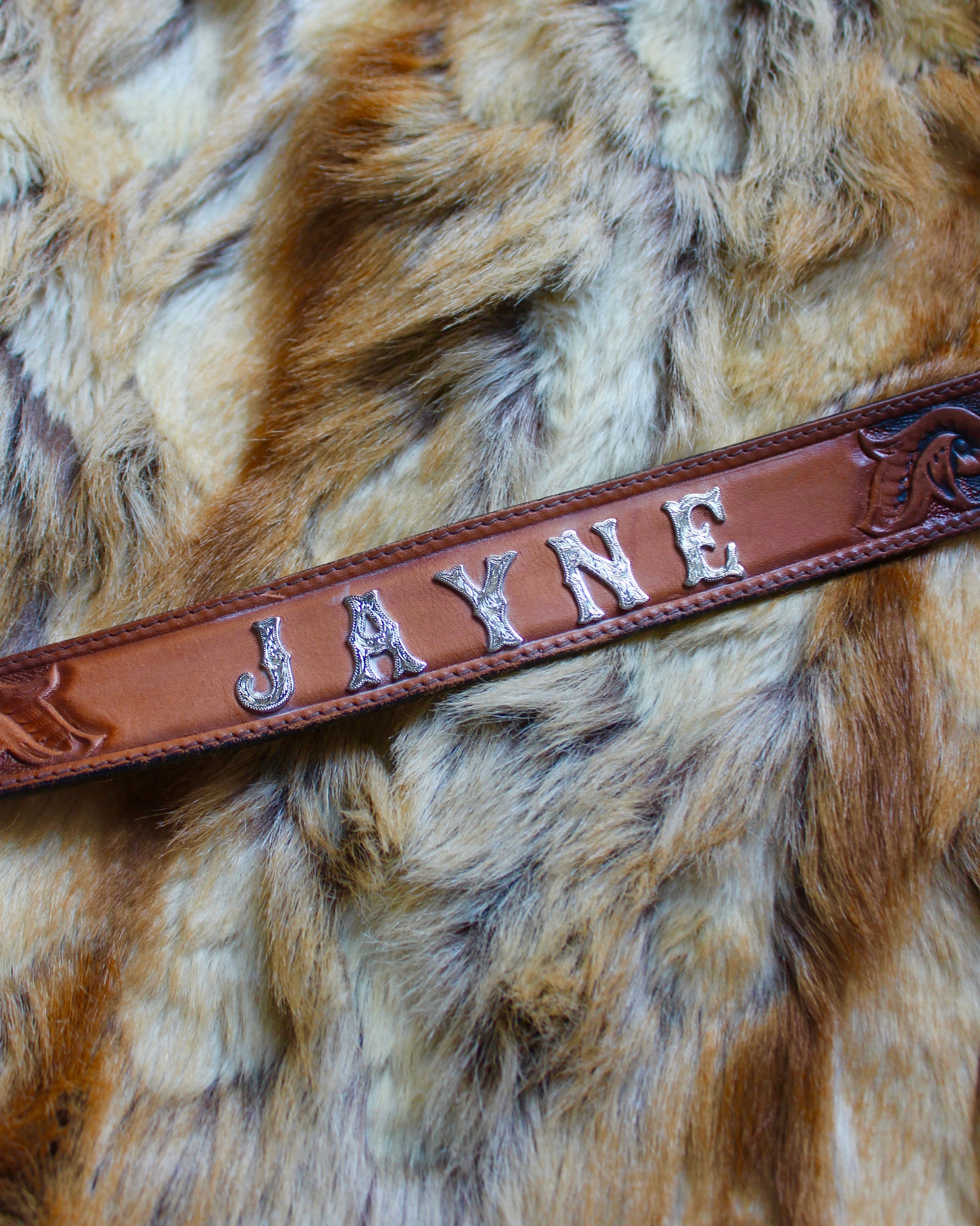 Vintage genuine leather tooled brown belt by Silver Creek Collection featuring intricate stitching and tooling, the name “Jayne” in silver engraved letters, and an engraved silver heart buckle by Montana Silversmiths. Buckle sterling silver plate. Belt and buckle show normal signs of age… built quality to last. Tightest notch measures 30.5”, loosest measures 34.5”. Would fit a Women’s Large best.