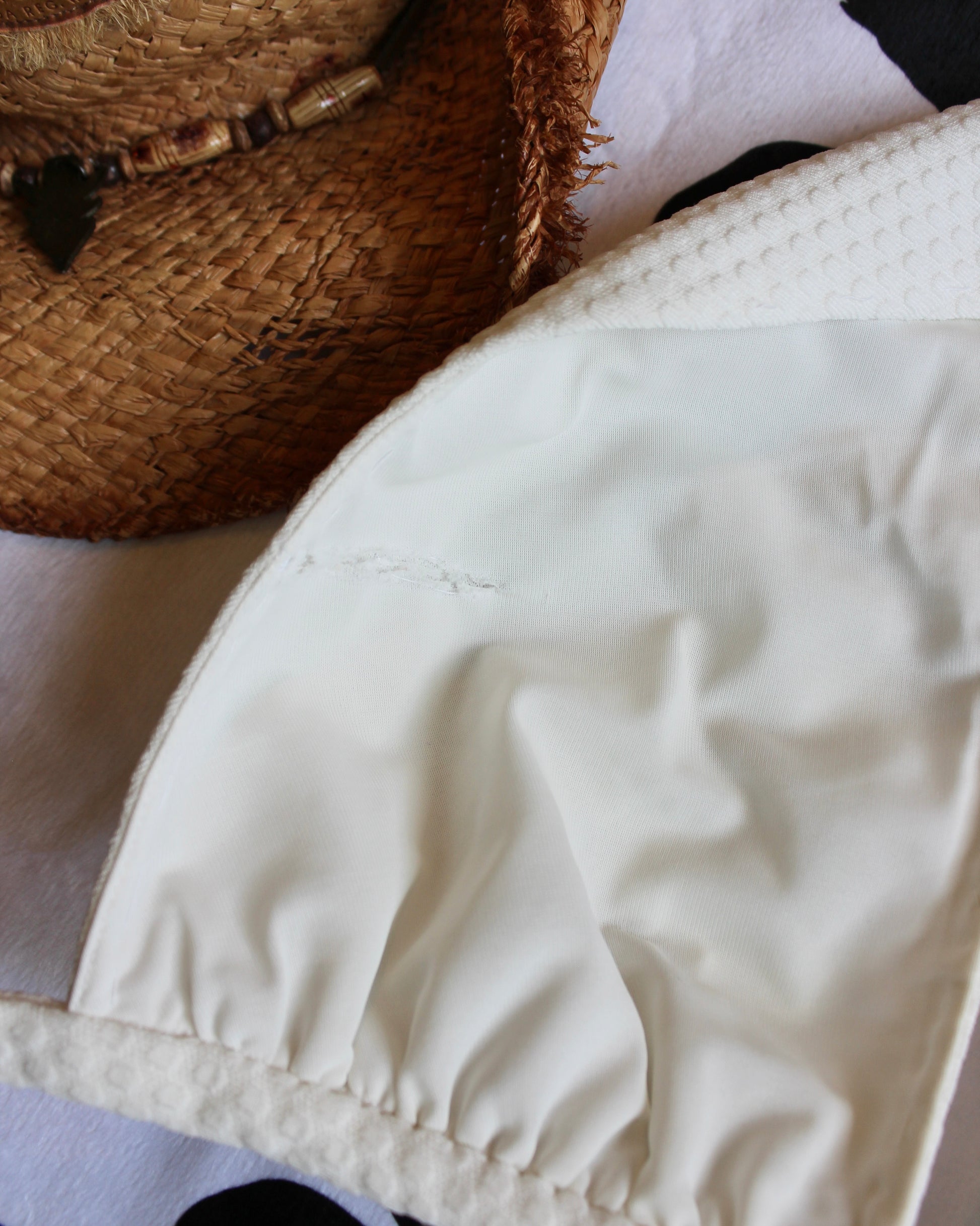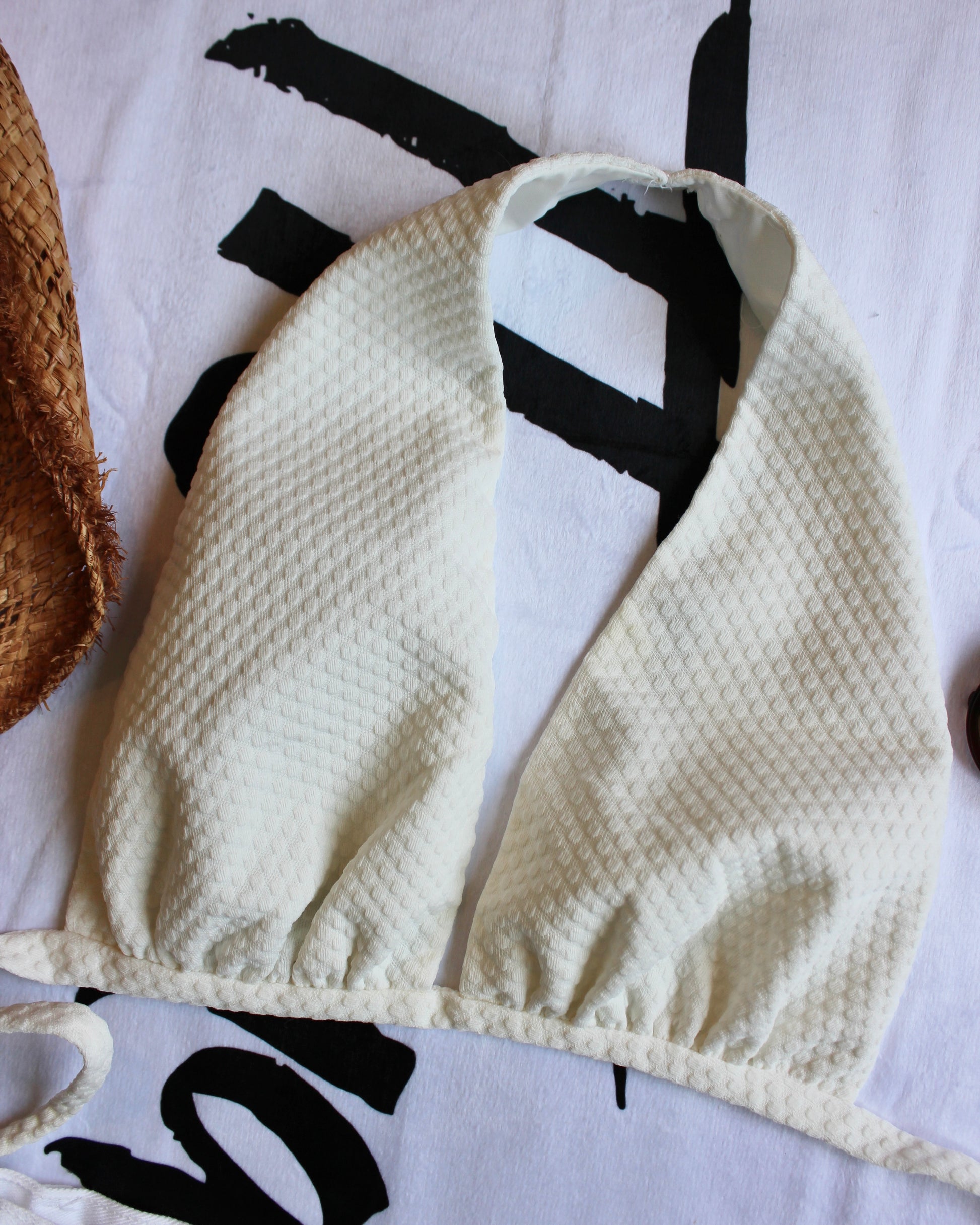 This gem reminded us so much of Marilyn Monroe’s iconic white halter dress that we had to name it in her honor. Vintage, hand made piece featuring textured fabric and comfortable inside lining. Pair with your favorite shorts and heeled sandals for a go-to summer ‘fit. The color is lighter, closer to white/cream in person. Inside lining has a couple of flaws; see last two pictures. Can fit a variety of cup sizes but ties fit around a size Small best.