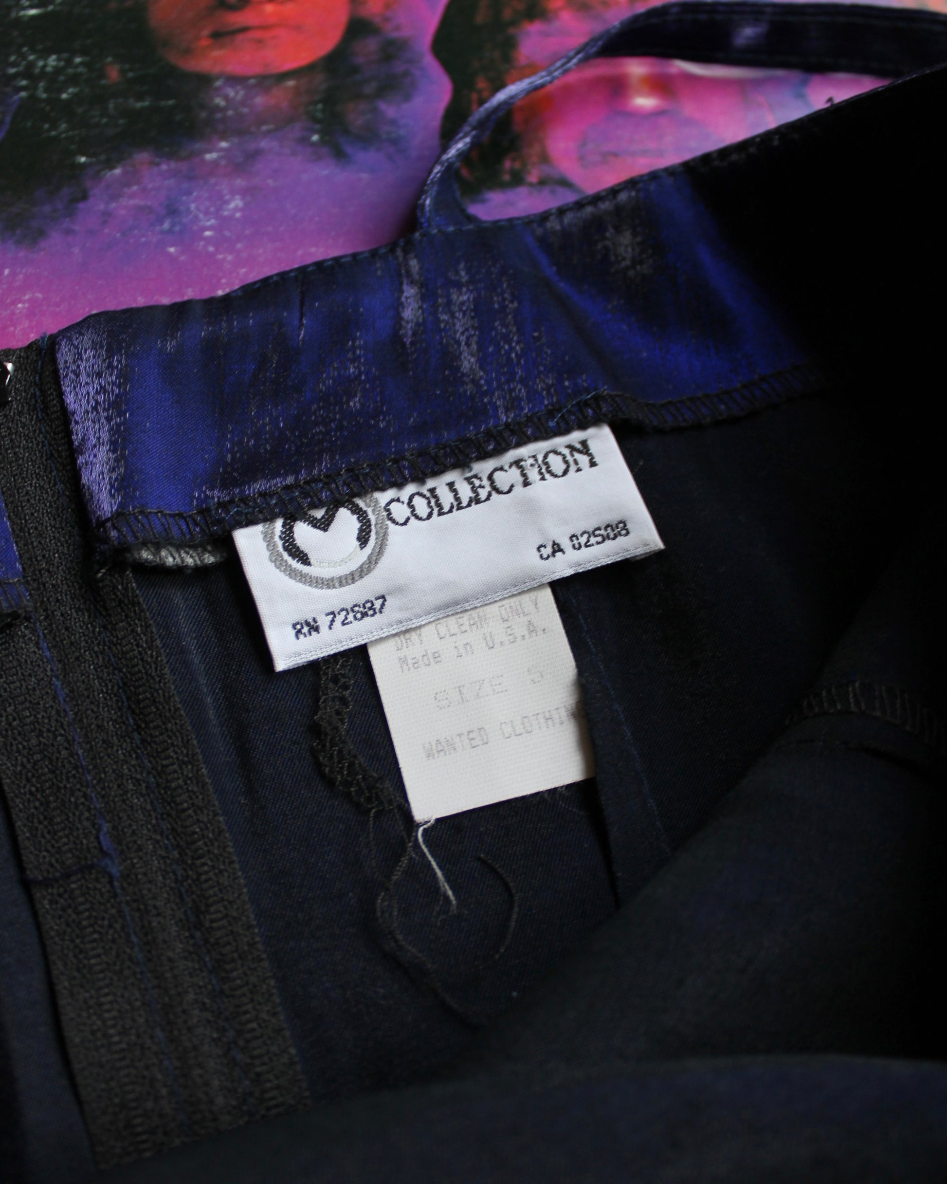 Mystical, magical vintage 90s mini dress featuring iridescent blueish purple fabric that reflects light beautifully (color is a bit more purple in person than pictures reflect), thin straps, zipper on the back, and a slightly flared slip-style silhouette. Made in USA. Looks amazing styled with belt (gold concho belt in pictures available and sold separately). Marked as a Women’s U.S. 5; see measurements below!