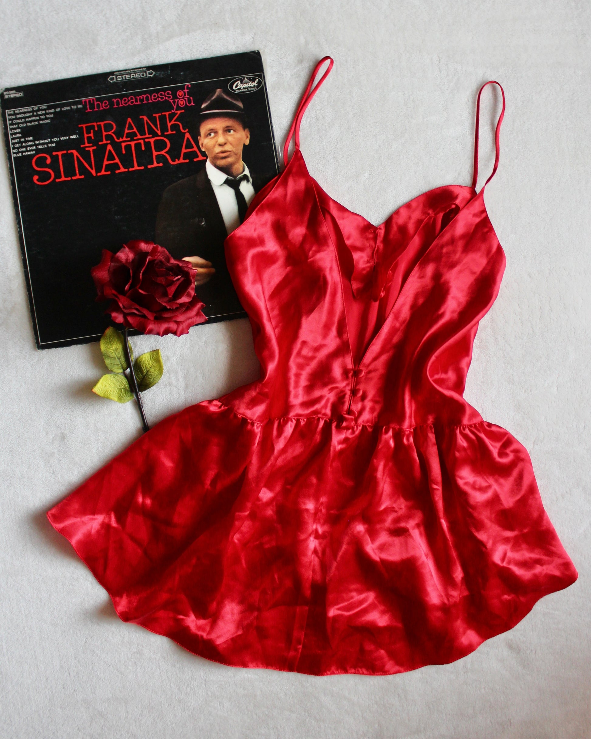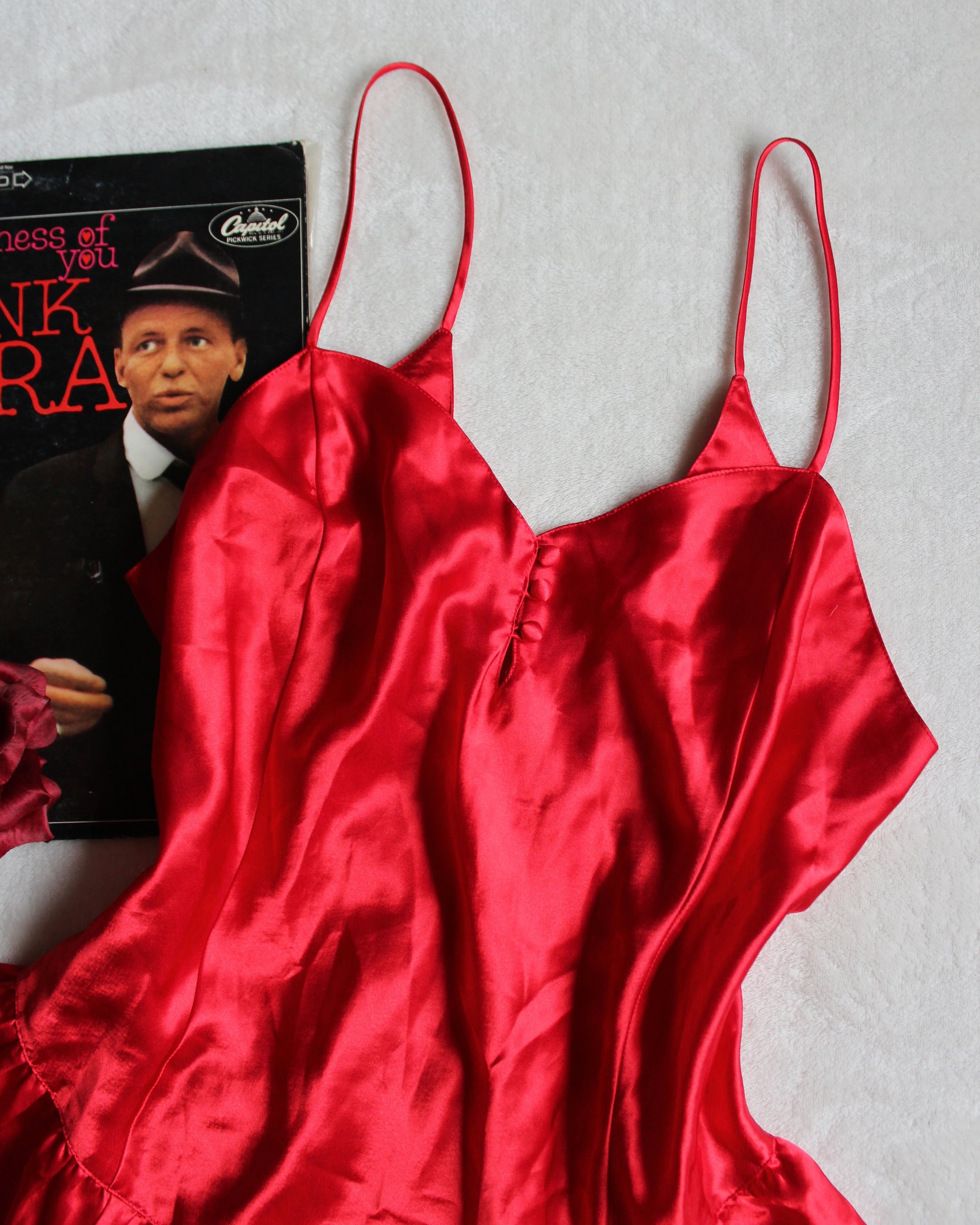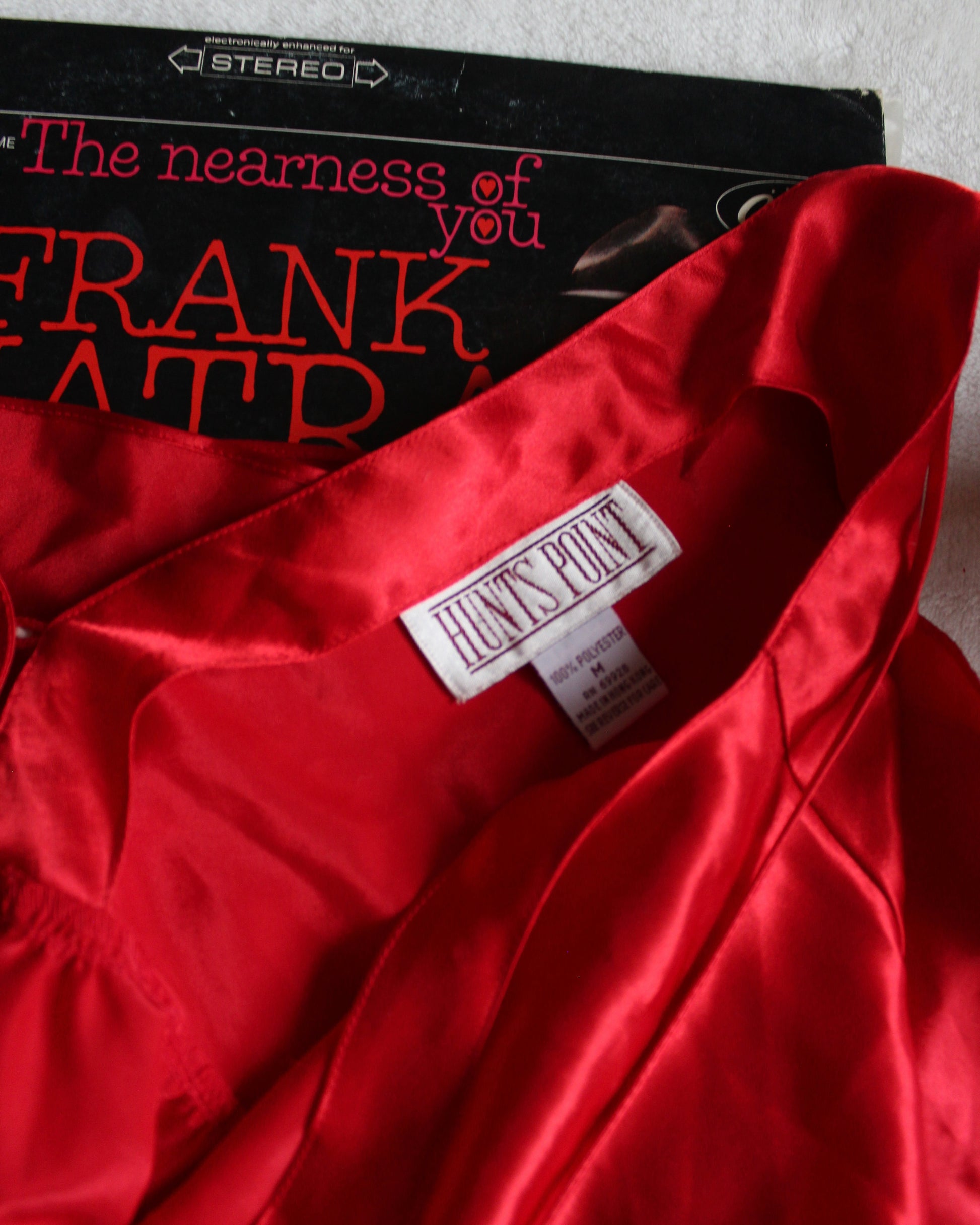 “Man, I feel like a woman!” — this slip dress if it could talk, probably. Vintage 90s/Y2K silky red slip dress by Hunts Point featuring dainty straps, sweetheart neckline, covered buttons on the front and the back, plunging back and a bit of a flair hem at the bottom. Size Women’s Medium; see measurements below!