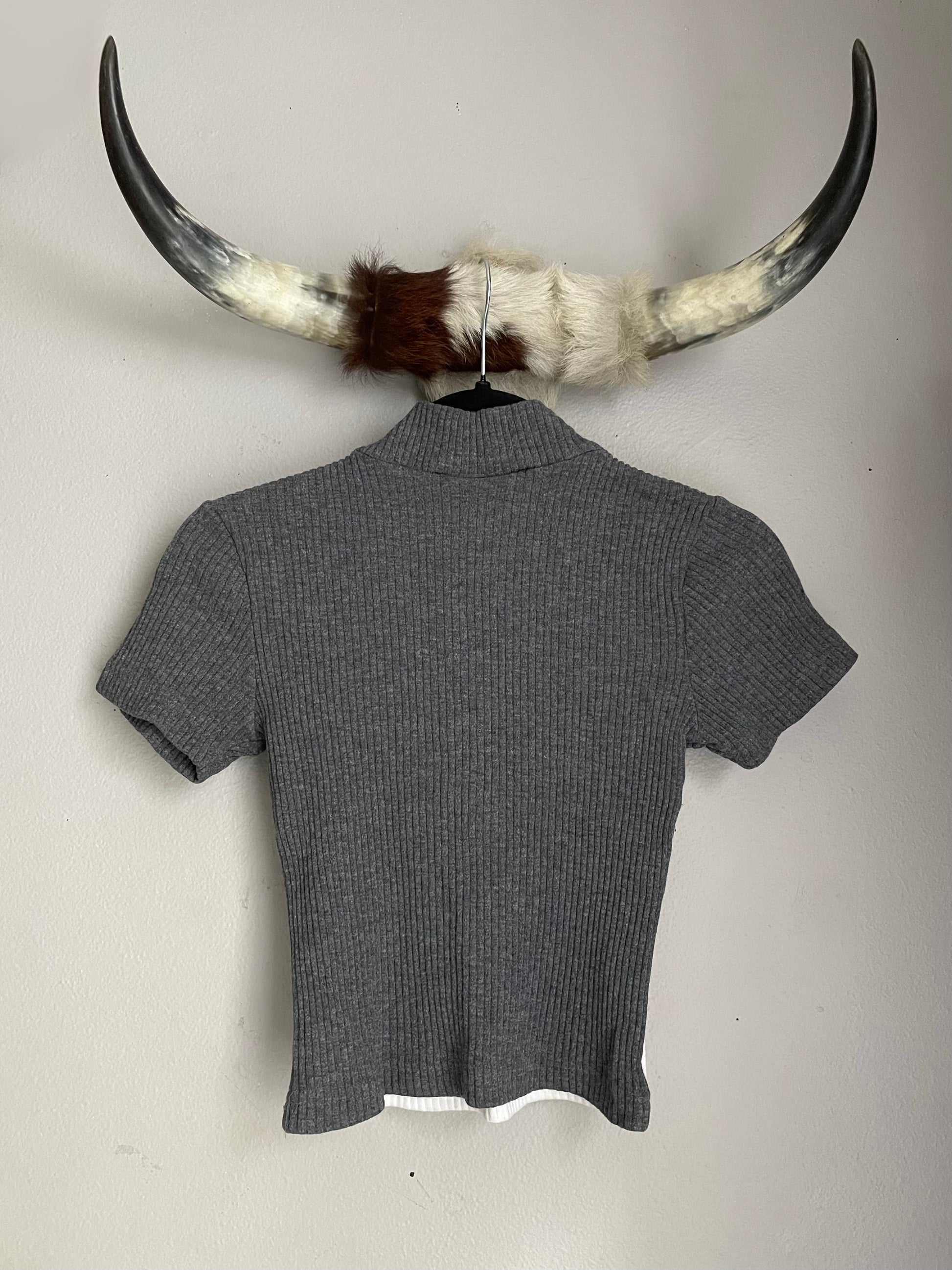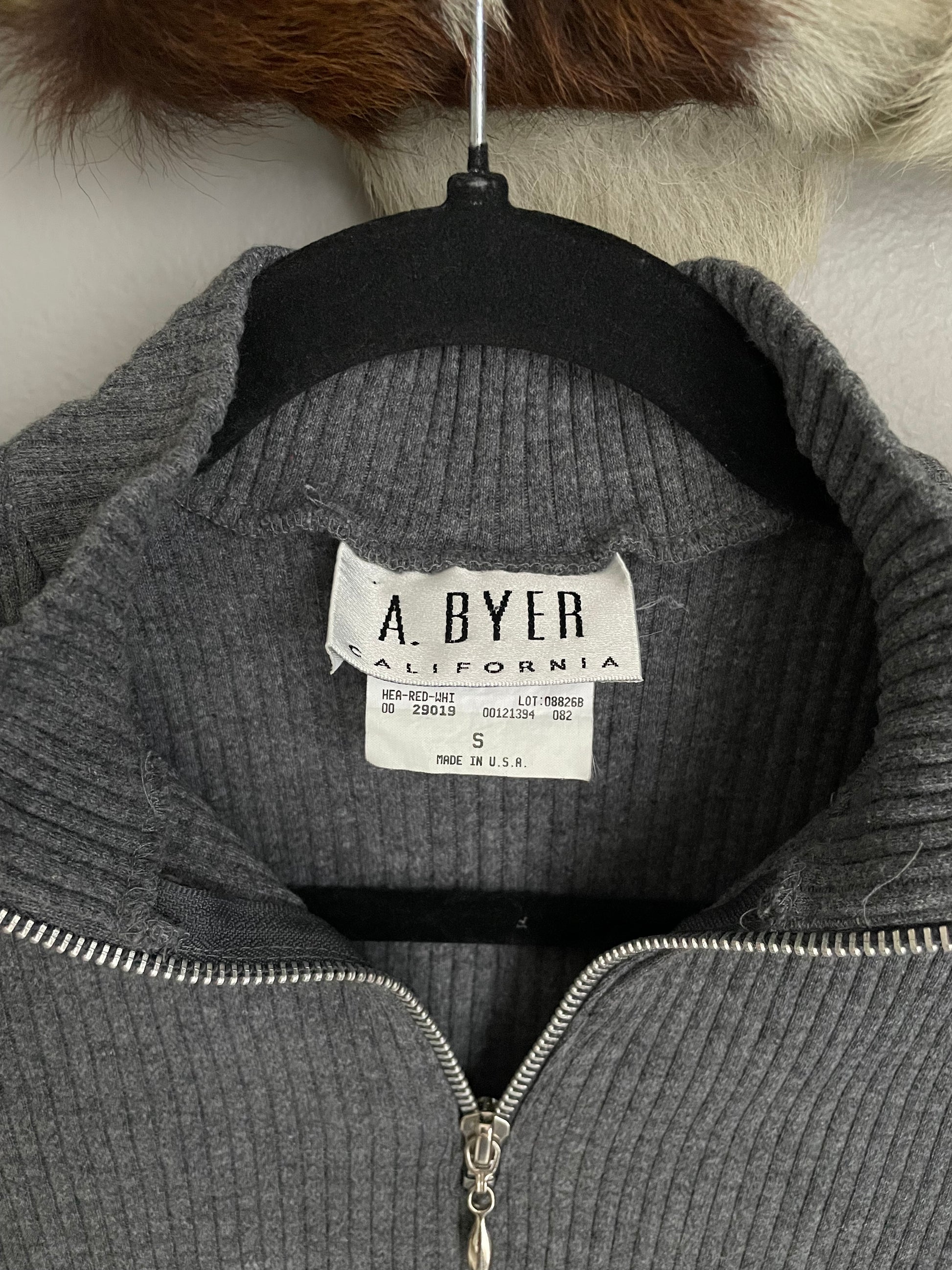 Cutest short sleeve zip up sweater by A. Byer California. Featuring slightly stretchy material, mock neck and silver half zipper. Appears to be from 2000. Made in USA. Shows normal signs of wear, like pilling, mostly in great vintage condition. Marked as a Women’s size Small; would fit an XS best. See measurements below!