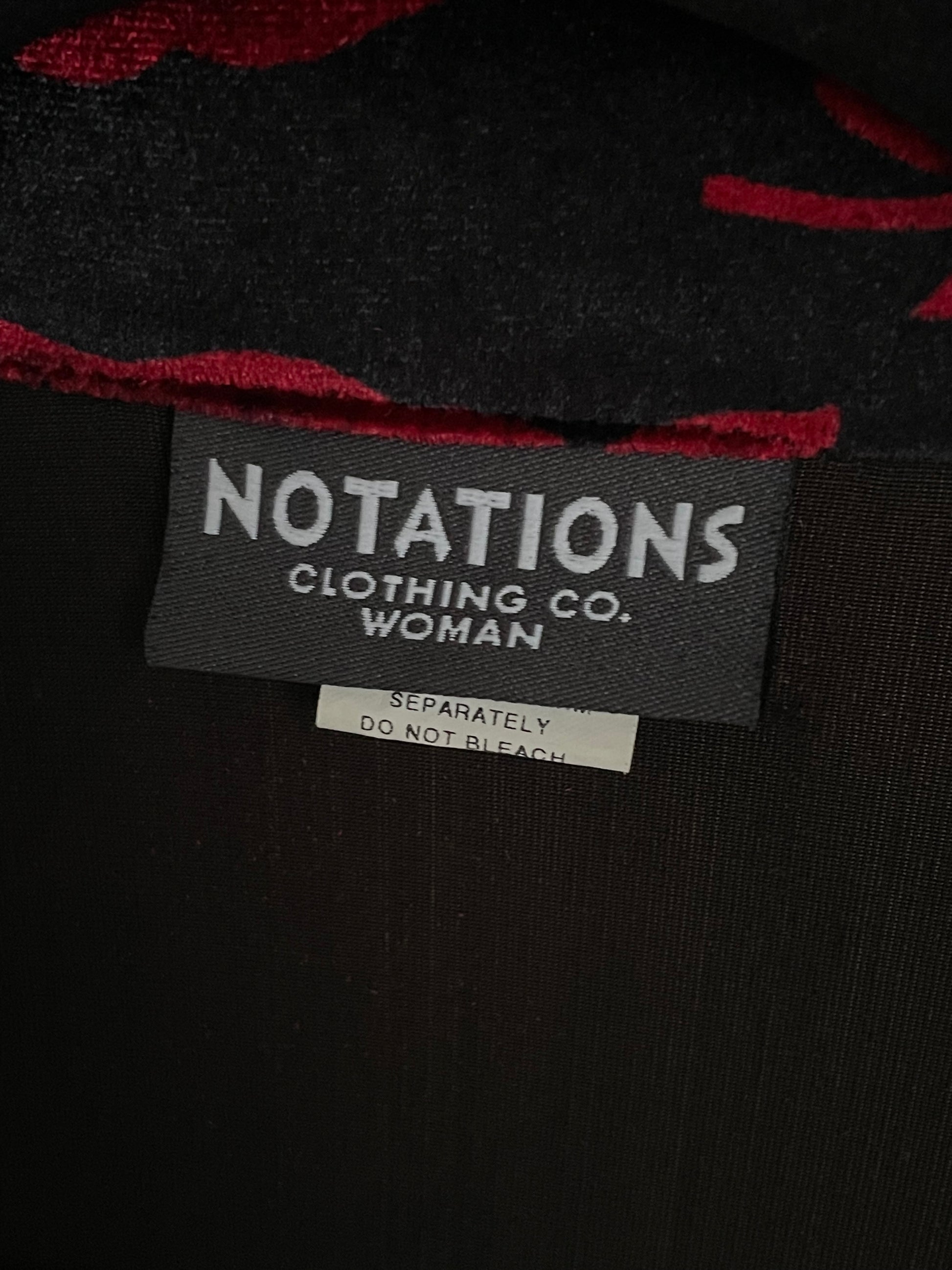 Vintage 90s/Y2K velour button-up shacket featuring red roses on a black background, small slits on the sides and black buttons down the front. Fits so comfortably, you’ll never want to take it off. By Notations. Made in USA. Marked as a Women’s 2X; can be worn oversized on smaller sizes as well (as seen in modeled picture). See measurements below!