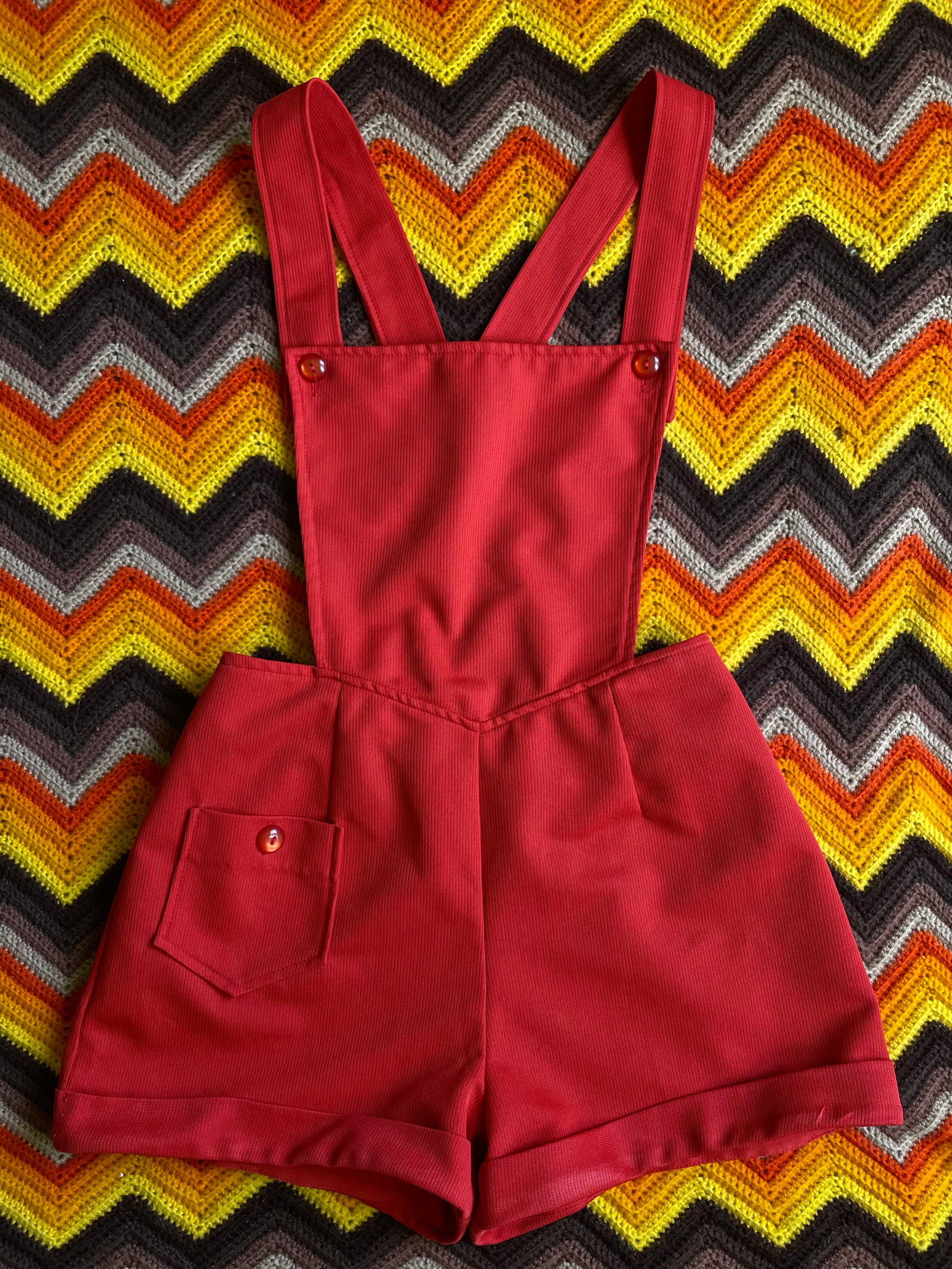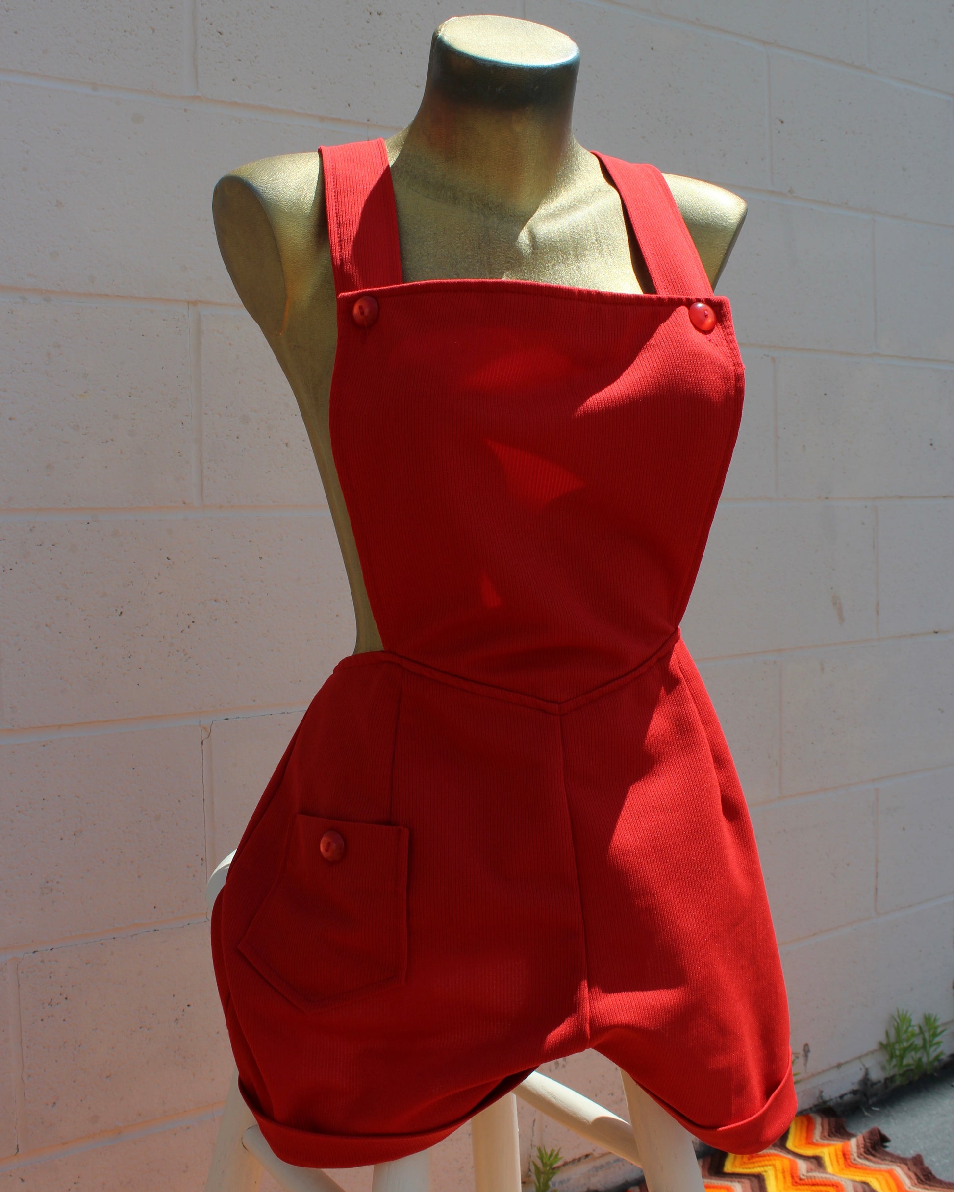 Vintage 1970s cherry red overall romper featuring a little pocket on the front, cuffed shorts, zipper on the back and the cutest tag. This piece would look fantastic paired with some roller skates on a hot summer day. By Angelica. Looks like there was originally a patch on the back (see last picture). Would fit a Women’s 4 best; see measurements below!