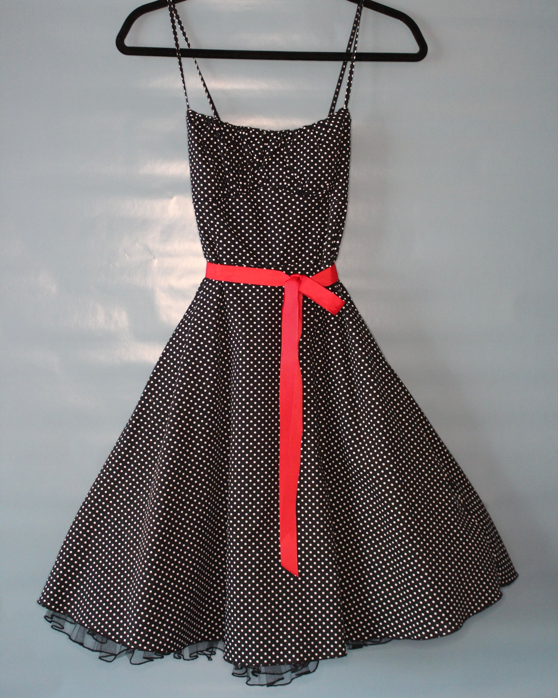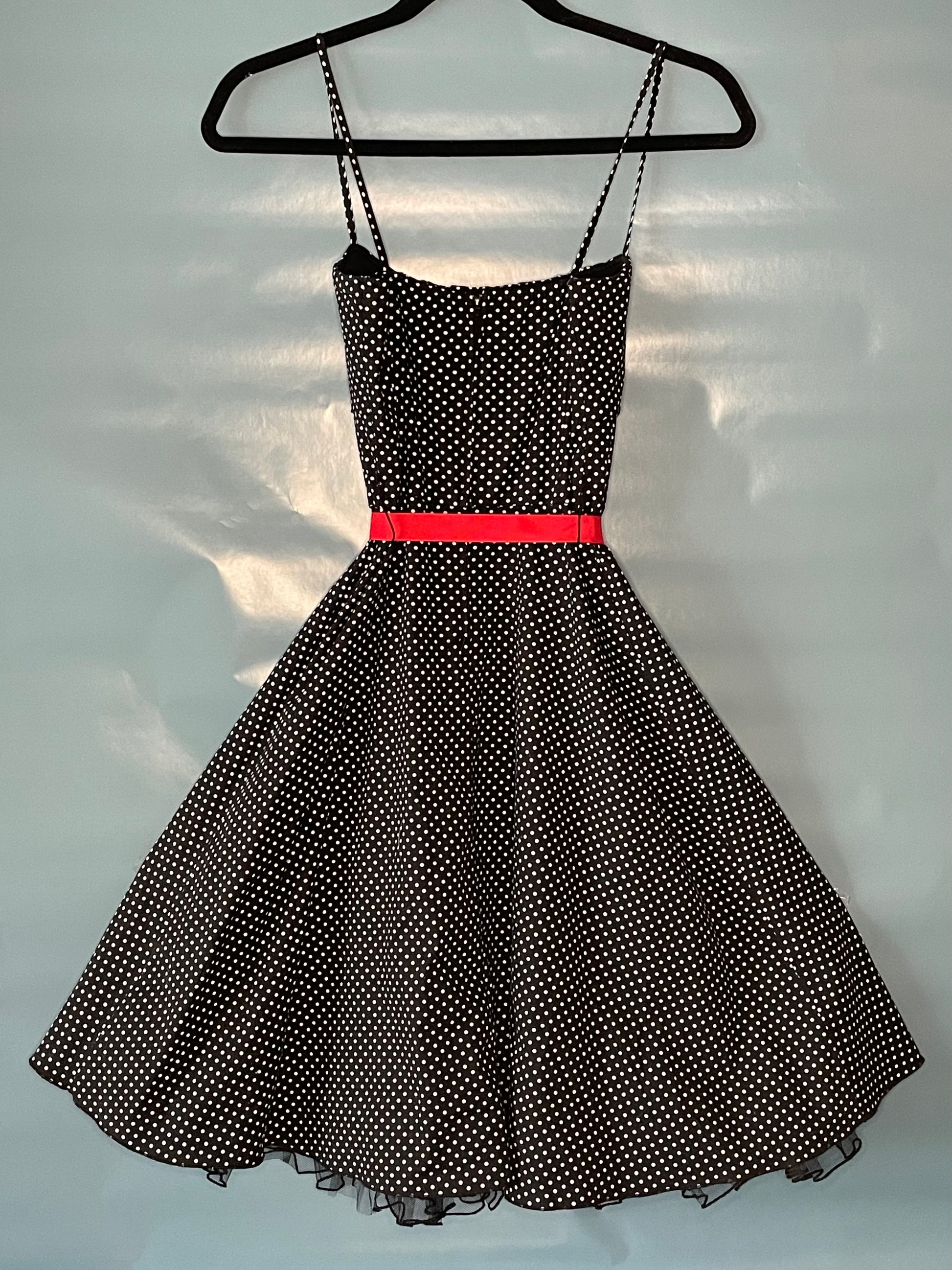 Adorable “90s does 50s” classic black and white polka dot dress by Donutz Inc. Featuring a double lined balconette style bust, dainty straps, removable red ribbon tie at waist and a lining inside with ruffle hem for extra volume. Zips up the back. Made in USA. Size Women’s Small; see measurements below!