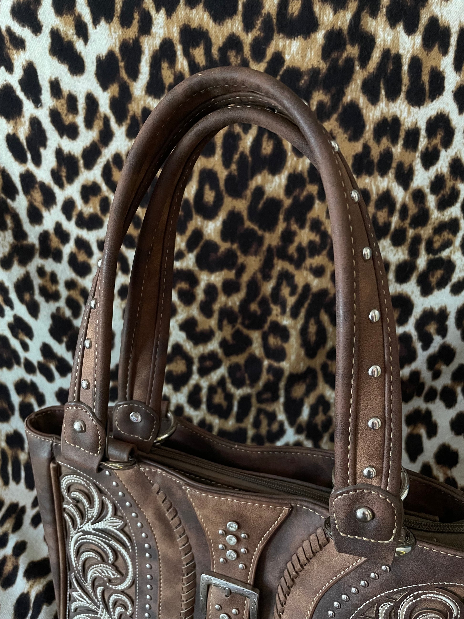 Gorgeous brown Montana West bag featuring studding, rhinestones, intricate stitching, pockets on the back and inside, and zipper on the top to keep your goods secured. Faux leather. In excellent condition. Measures approx 12.5” wide by 10” tall.