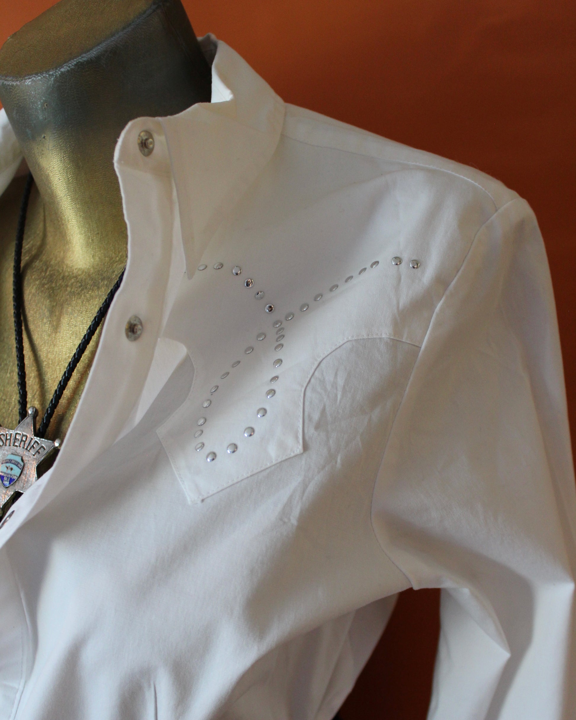 Classic crisp white western button-up featuring small silver stud details on front and back, pearl snap buttons, sharp collar and pearl snap buttons on sleeve cuffs. By Five Star by Roper. Size Women’s Medium; see measurements below!
